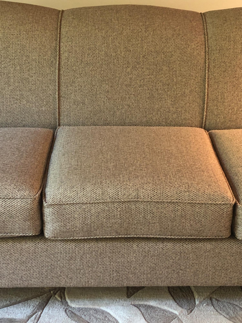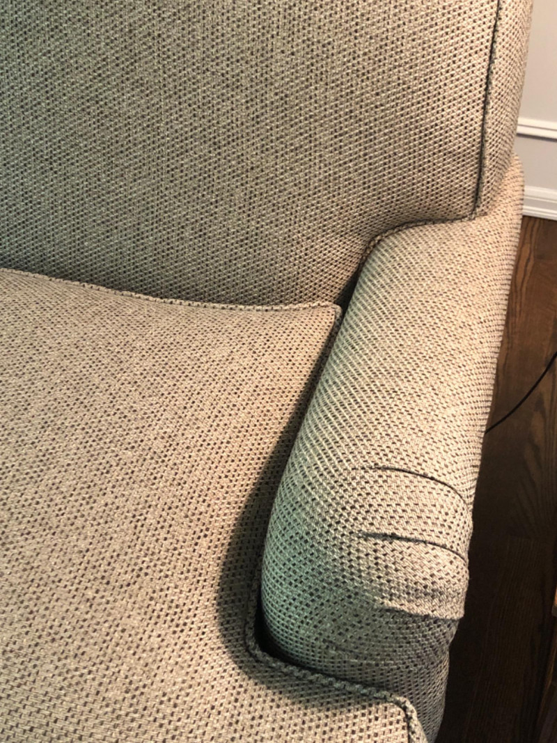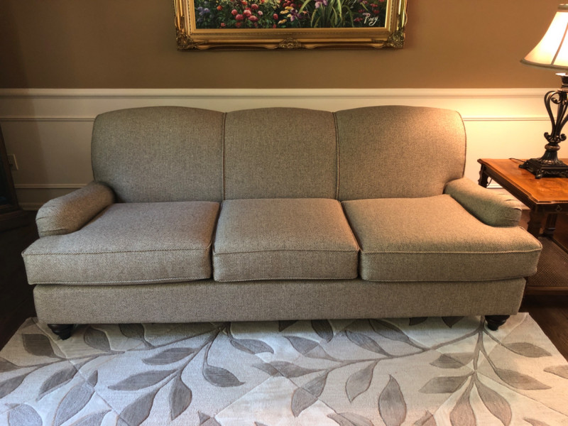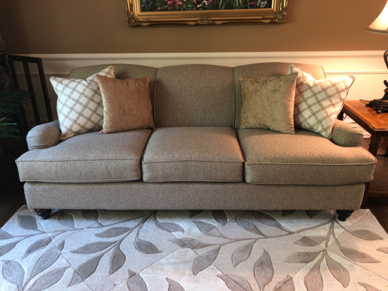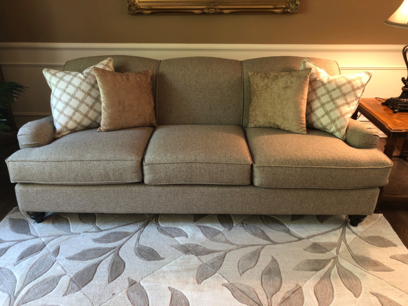 A full-length Bassett sofa with three-seat configuration, upholstered in a neutral fabric and framed by classic rolled arms. The design blends traditional proportions with contemporary restraint, offering a versatile silhouette suited to living rooms, dens, or transitional interiors. Its 84-inch length provides generous seating, while the tailored cushions and structured back suggest comfort without excess.