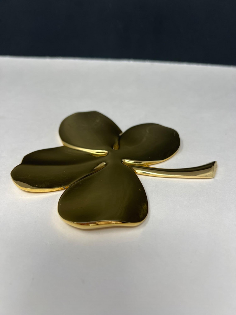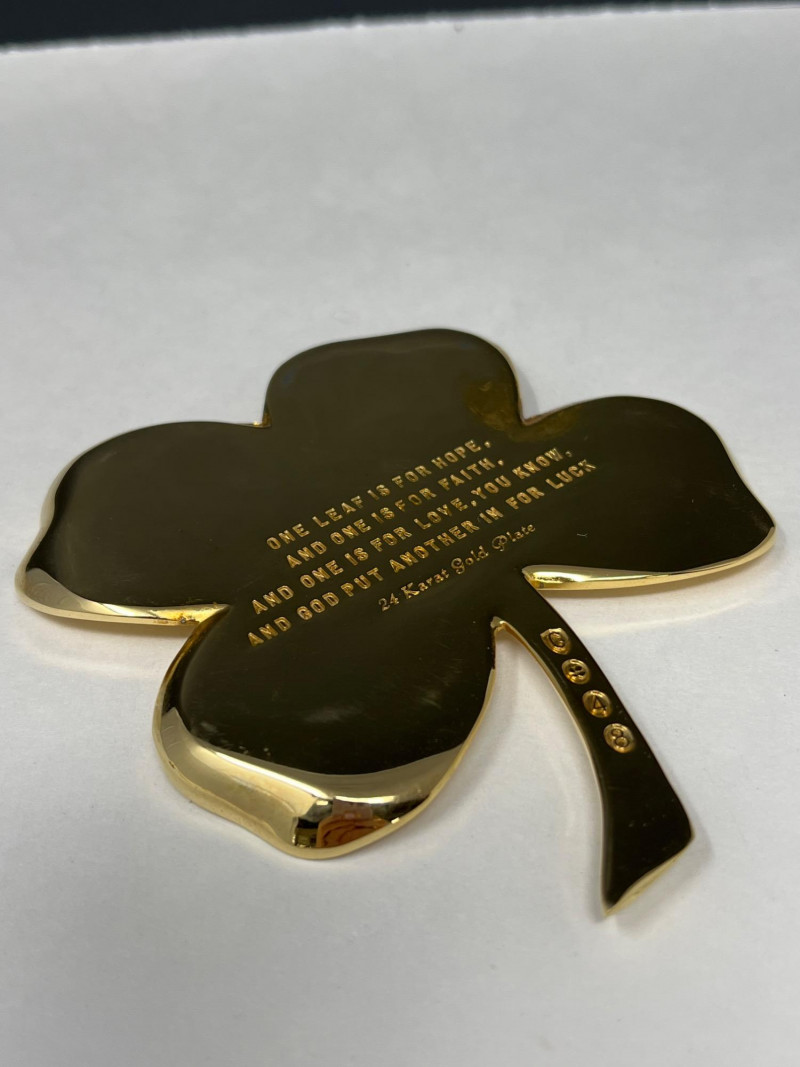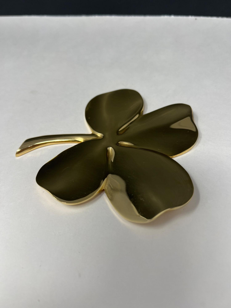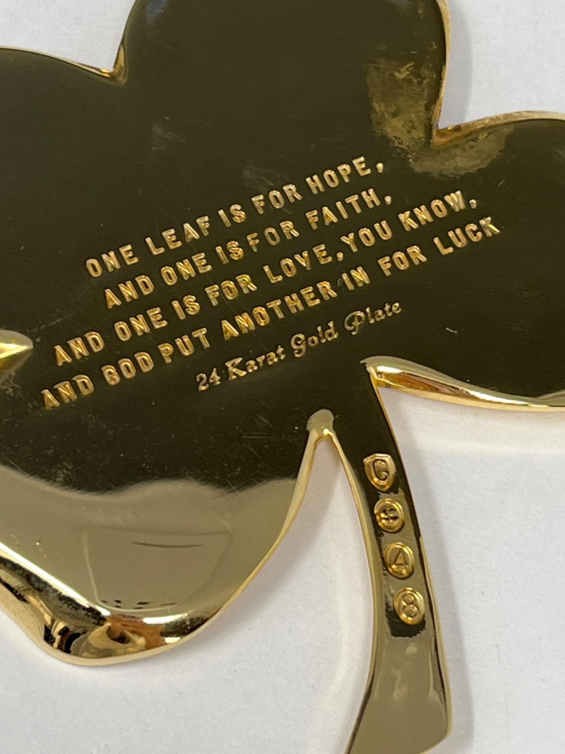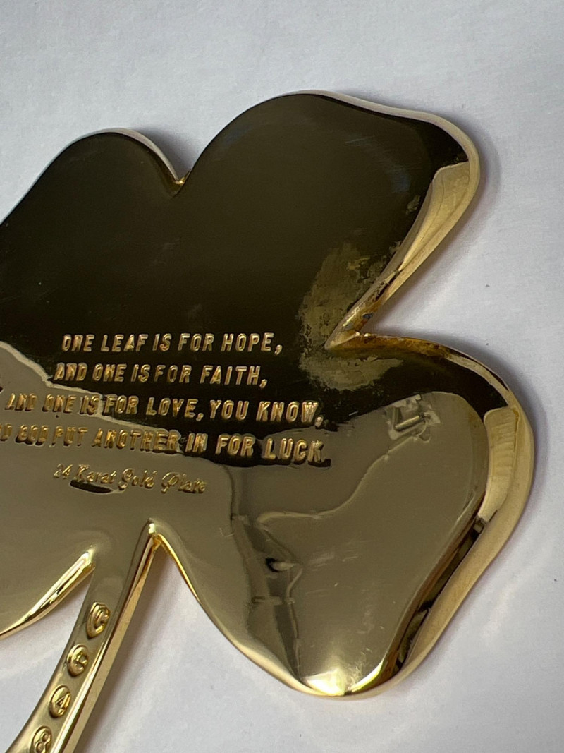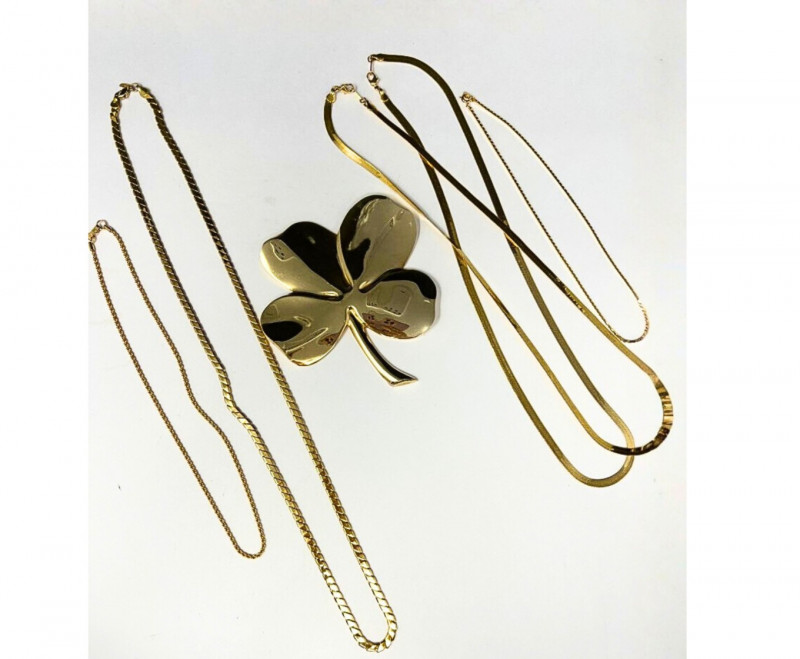 A radiant ensemble of gold-toned necklaces (e.g.: Napier, Korea) paired with a striking 24kt gold-plated four leaf clover pendant. The clover, measuring 5" tall by 4.25" wide, evokes vintage charm and symbolic luck. Chain lengths include 28", 22" (two), 18", and 14", offering versatile styling options. Whether layered or worn solo, this collection adds warmth and whimsy to any jewelry curation.