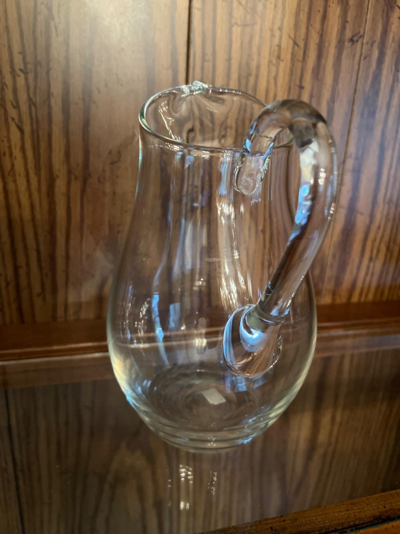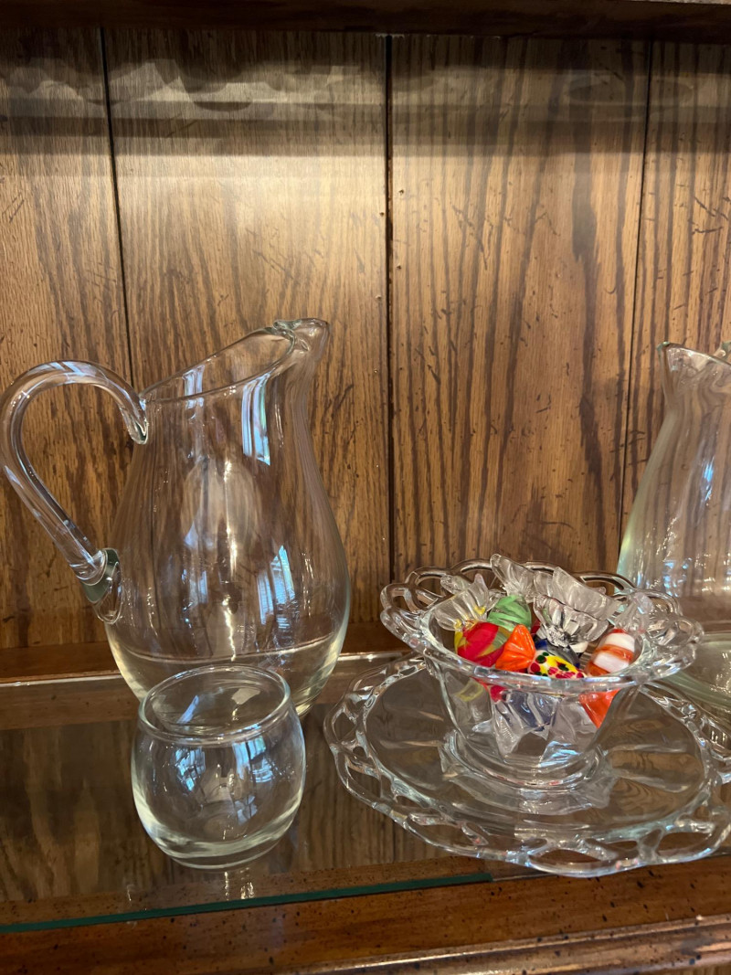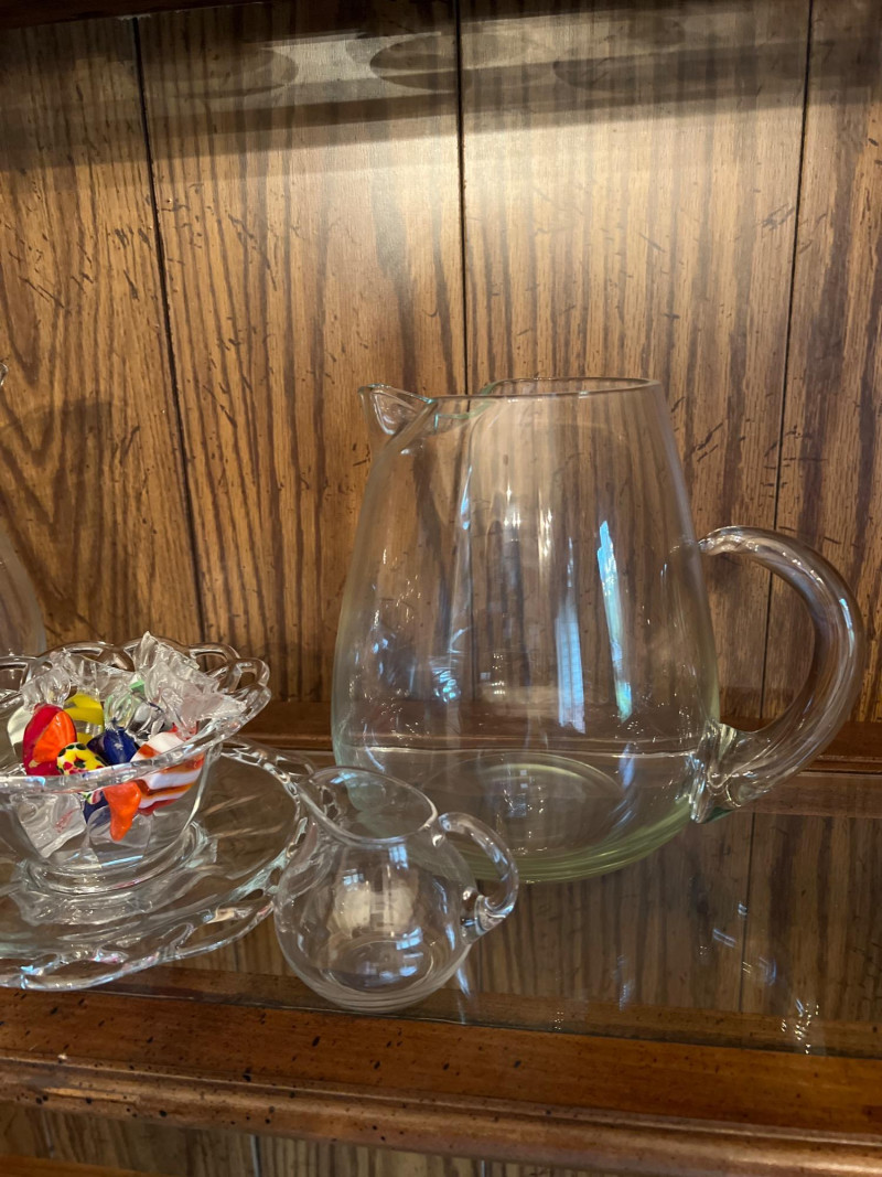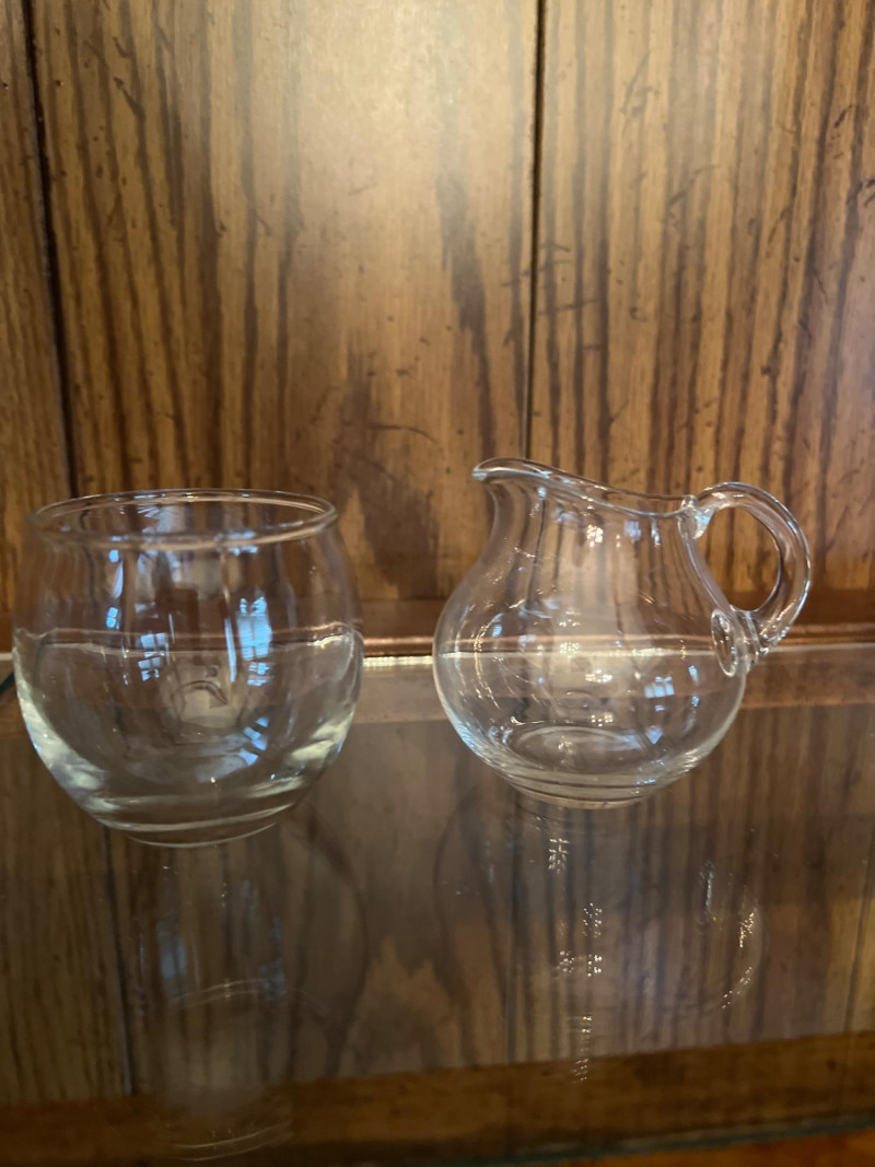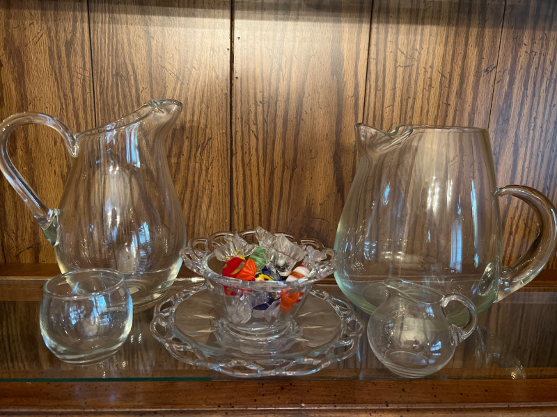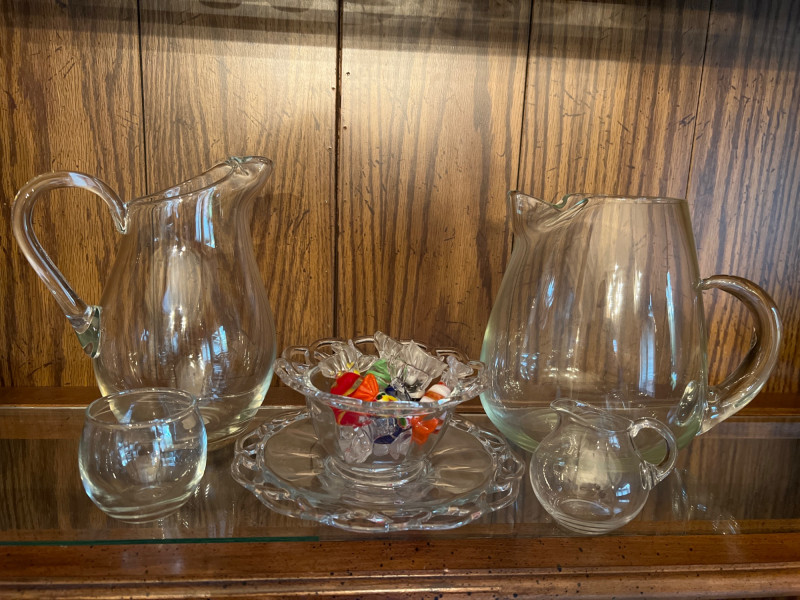 A versatile five-piece clear glass serving set, perfect for entertaining or everyday elegance. This lot includes: Two pitchers – 8" tall × 6" wide and 8" tall x 4" wide, ideal for water, juice, or floral arrangements One sugar bowl – 2.5" tall One creamer – 3" tall One condiment bowl – 5.25" wide × 3" tall (included are several colorful glass candies) One coordinating underplate – 7" diameter, pairs with the bowl for serving dips or sauces Each piece features classic clear glass styling with smooth curves and timeless appeal. A lovely addition to a traditional table setting or vintage glassware collection.