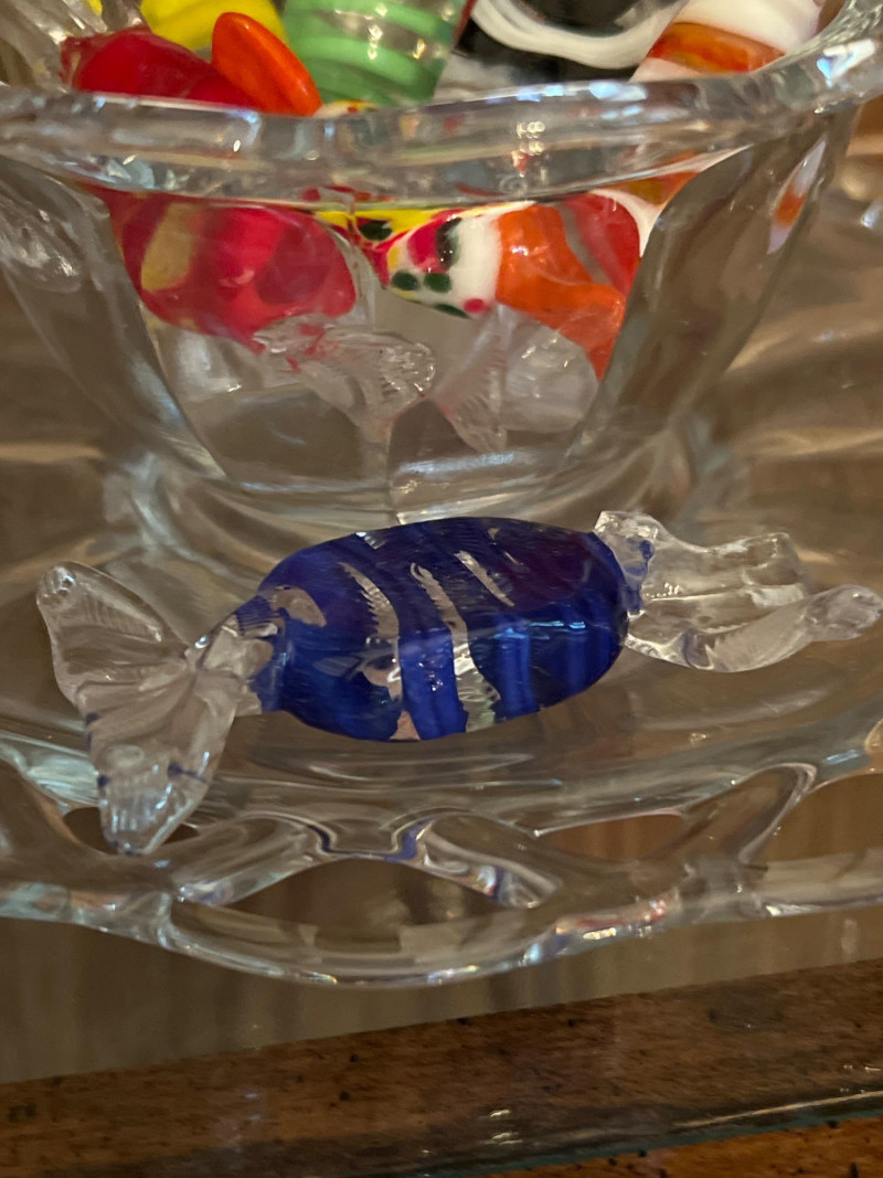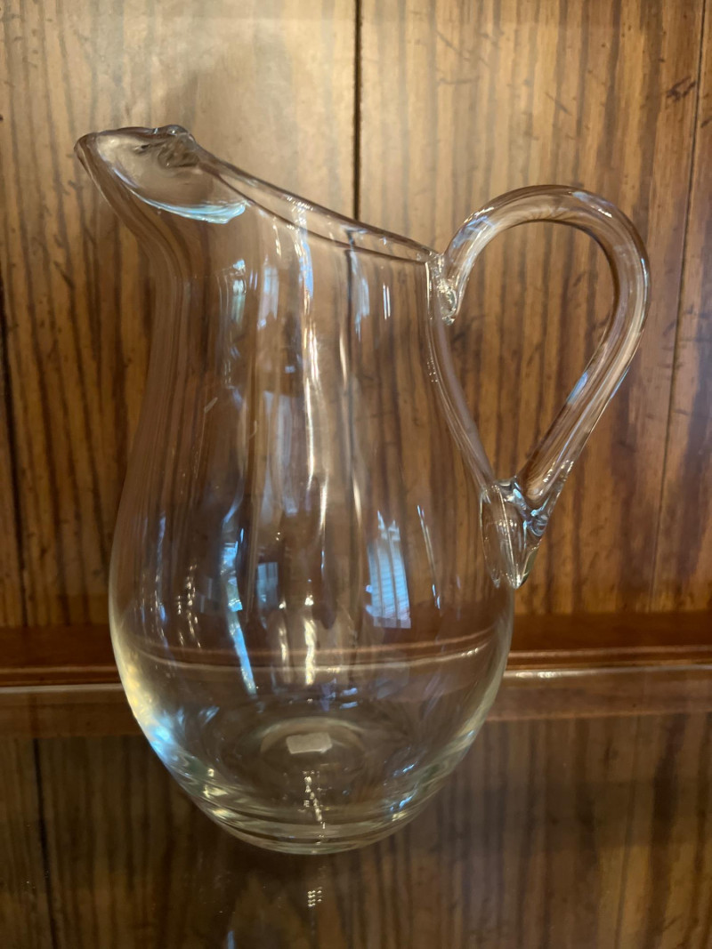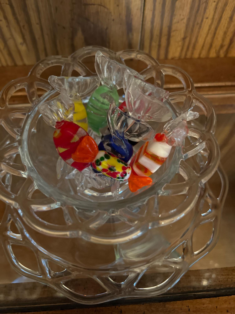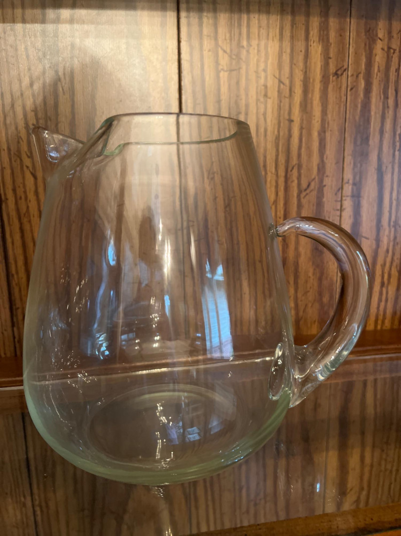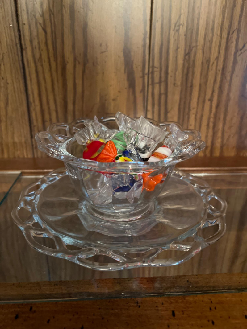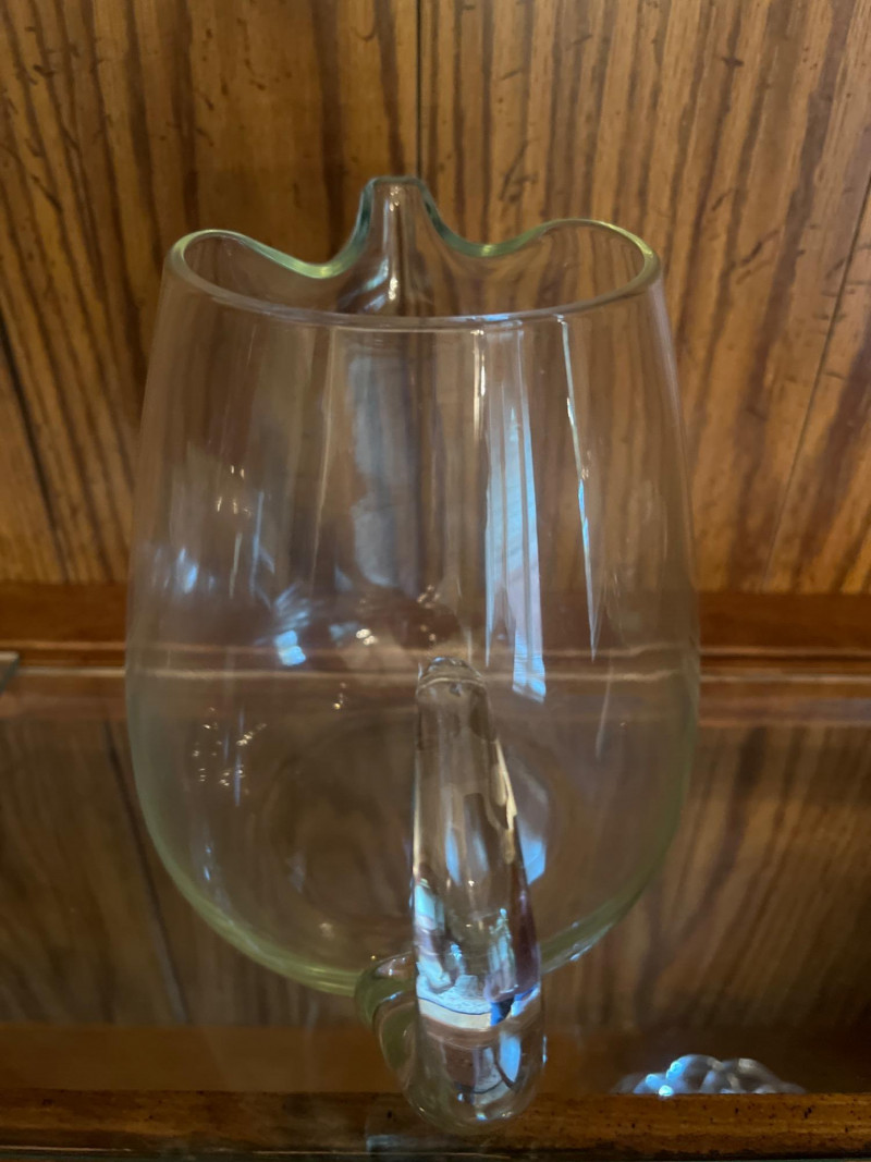 A versatile five-piece clear glass serving set, perfect for entertaining or everyday elegance. This lot includes: Two pitchers – 8" tall × 6" wide and 8" tall x 4" wide, ideal for water, juice, or floral arrangements One sugar bowl – 2.5" tall One creamer – 3" tall One condiment bowl – 5.25" wide × 3" tall (included are several colorful glass candies) One coordinating underplate – 7" diameter, pairs with the bowl for serving dips or sauces Each piece features classic clear glass styling with smooth curves and timeless appeal. A lovely addition to a traditional table setting or vintage glassware collection.