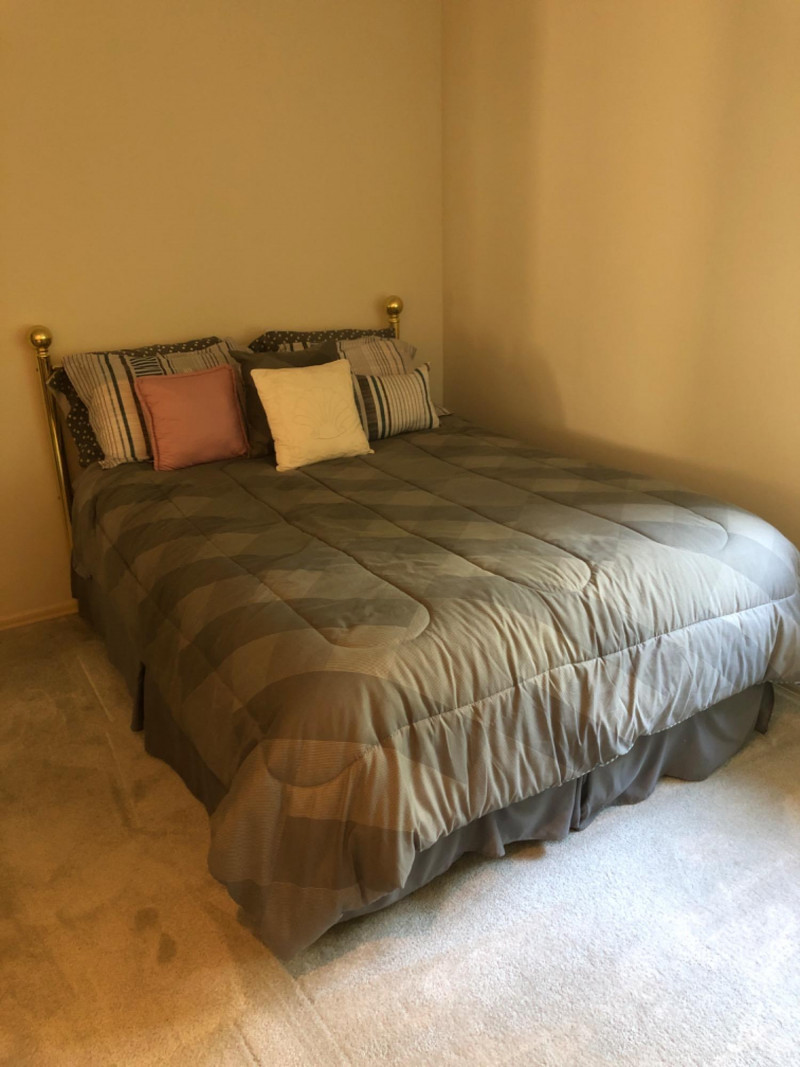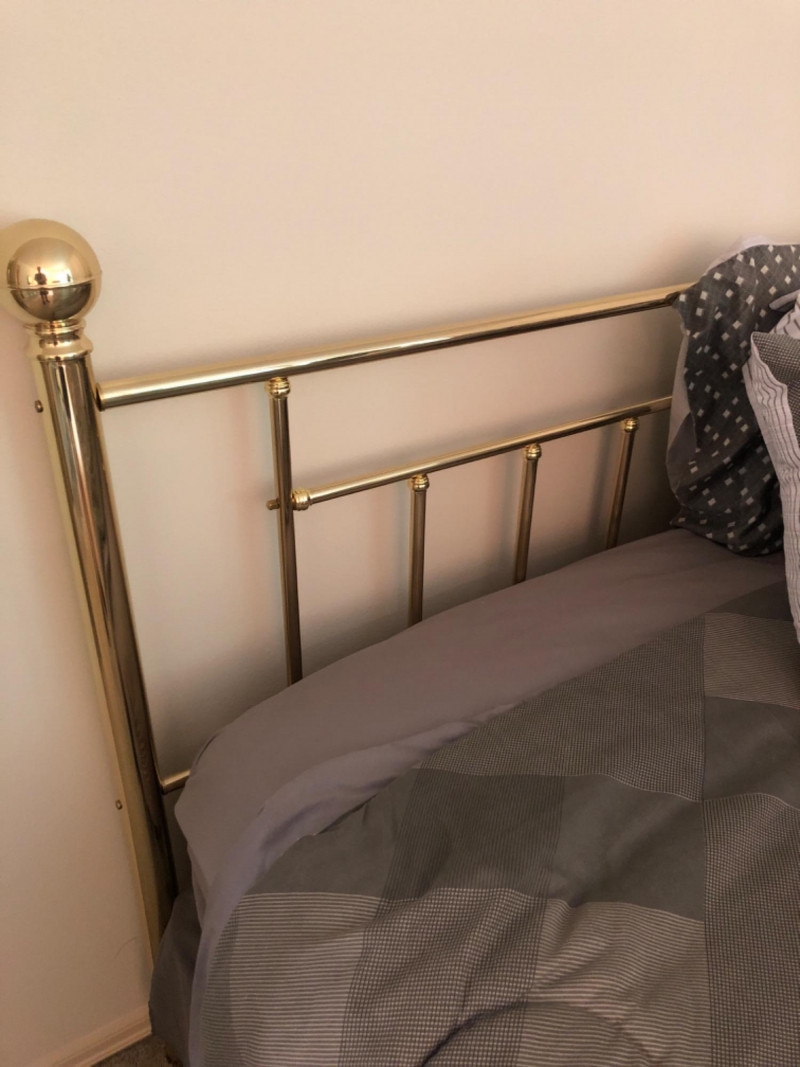 A timeless brass queen-size bed featuring warm metallic tones and classic lines. Brass headboard frame attached to hidden box spring metal frame. Here is everything needed for immediate use: mattress, box springs, and bedding. The brass finish offers a subtle glow that complements both vintage and contemporary interiors. Minor wear consistent with use; overall excellent condition. Ideal for those seeking a complete bedroom setup with character and comfort. Bidding on this lot is an agreement that: (1.) You will have 2 capable, able-bodied persons to lift and load at a minimum. (2.) You