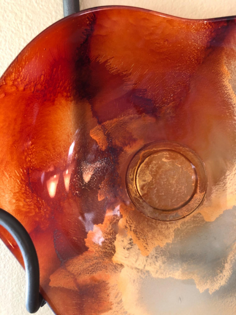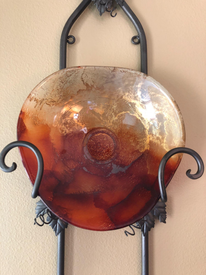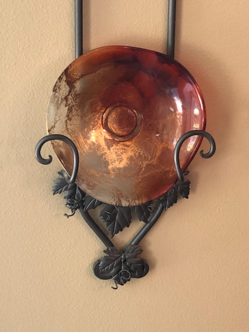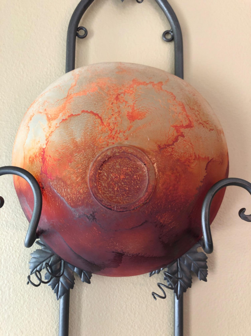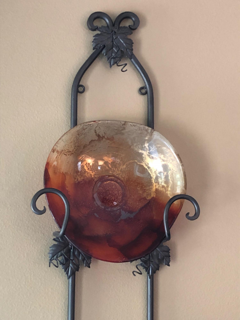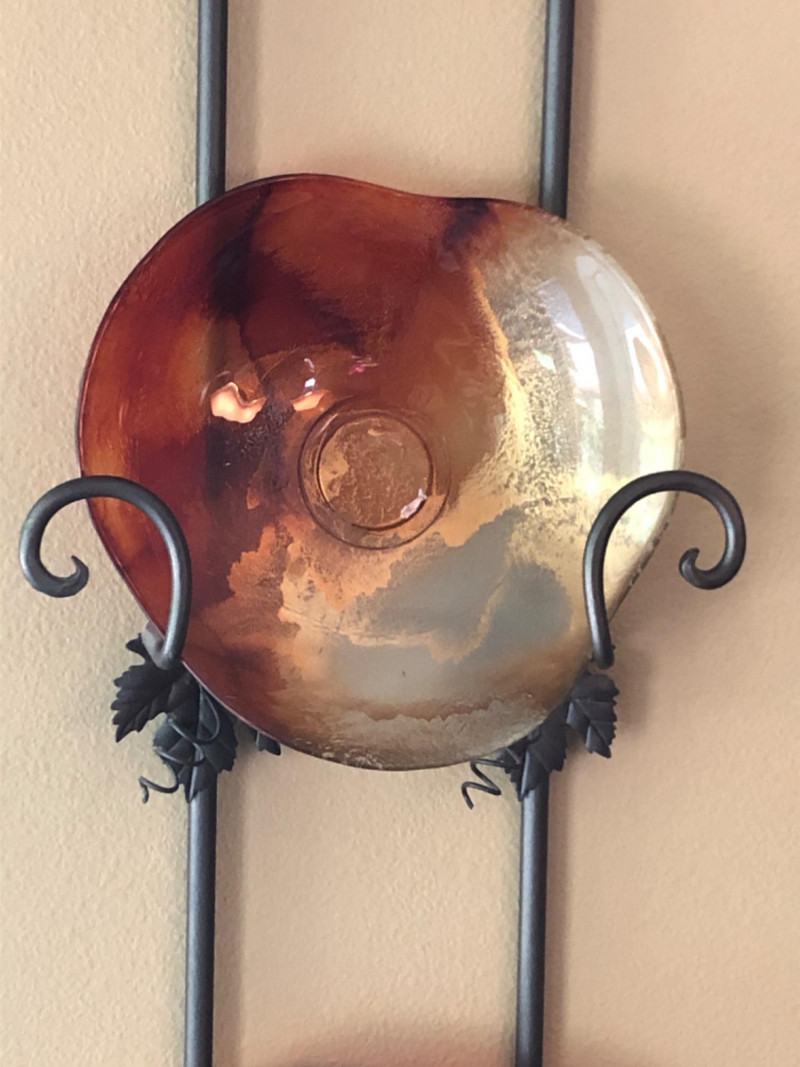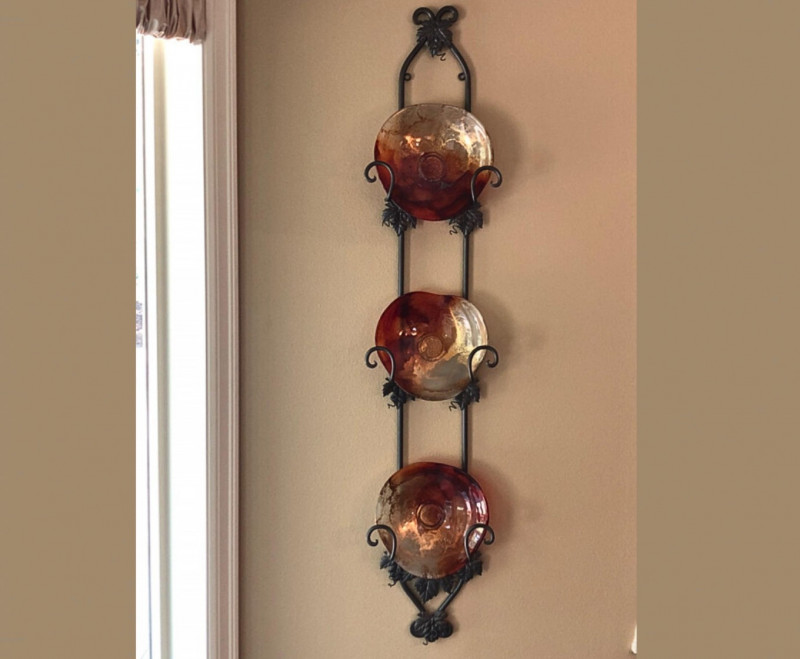 A vibrant trio of handblown glass plates from Pier 1, artfully displayed on a custom hanging wall rack. Each plate measures 8" in diameter and features rich, swirling color patterns that catch the light beautifully. The rack spans 45" in width and 9" in height, offering a striking horizontal presentation ideal for dining rooms, hallways, or gallery walls. Pier 1 is known for its globally inspired decor and artisan craftsmanship, and this set exemplifies their signature blend of color, texture, and visual storytelling. Excellent condition with no chips or cracks. Ready to hang.