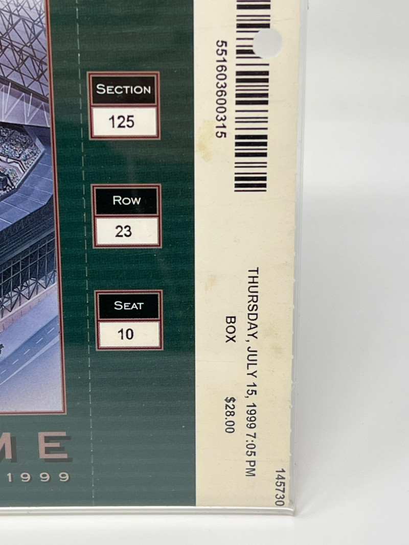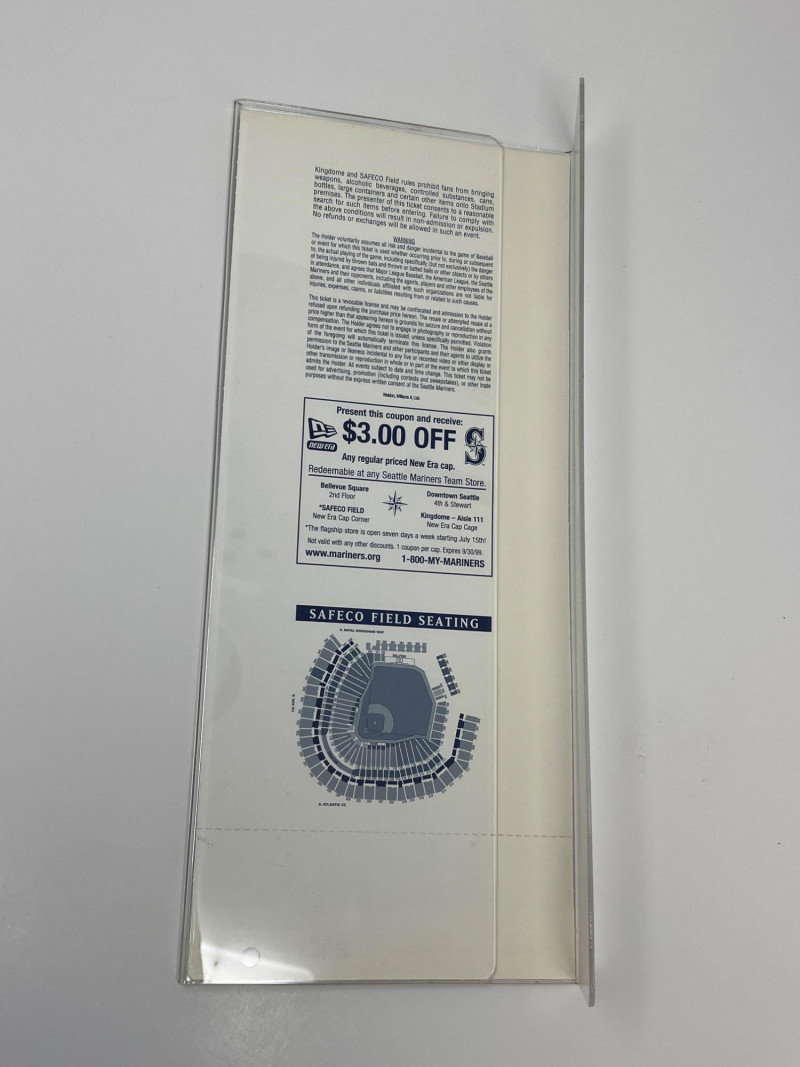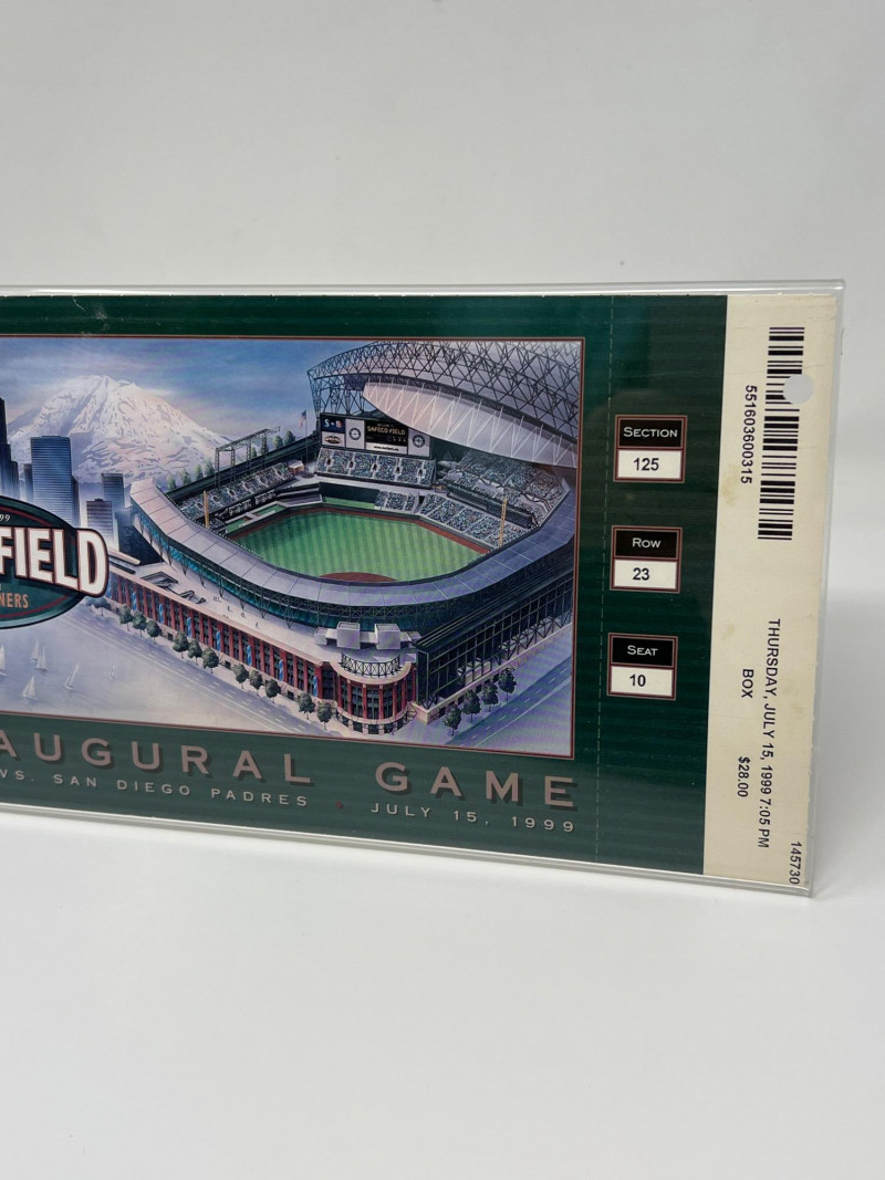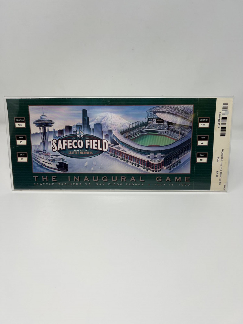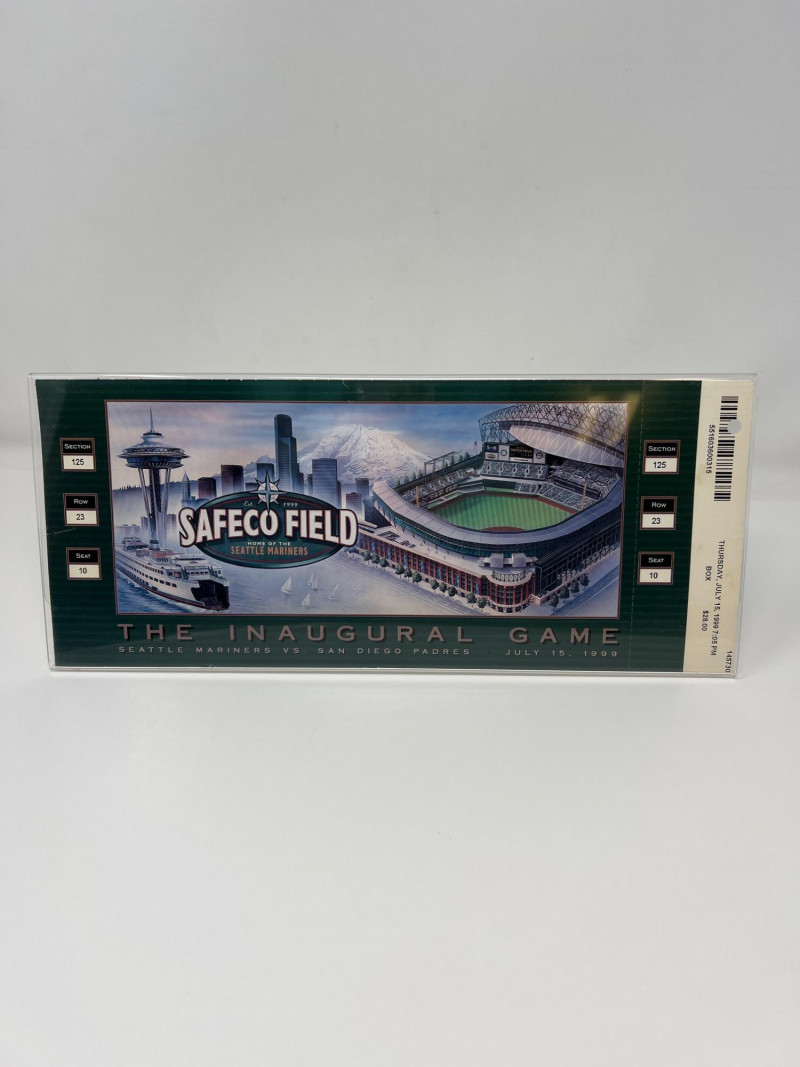 A commemorative artifact from the dawn of a new era in Seattle baseball, this collectible celebrates the inaugural game at Safeco Field in 1999. This one-of-a-kind memorabilia (section 125, row 23, seat 10) captures the spirit of that historic moment when the Mariners stepped onto their new home turf on Thursday, July 15, 1999 at 7:05PM.