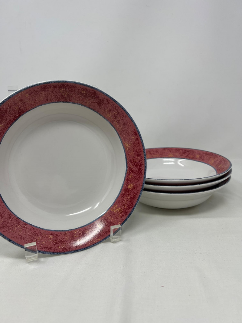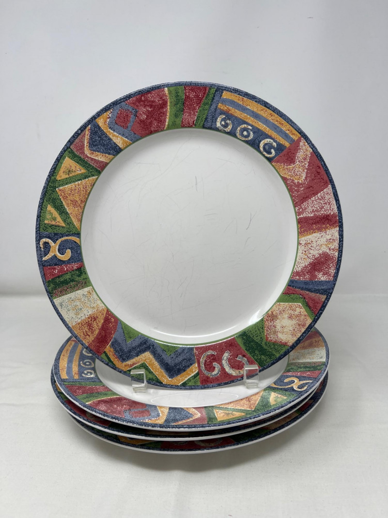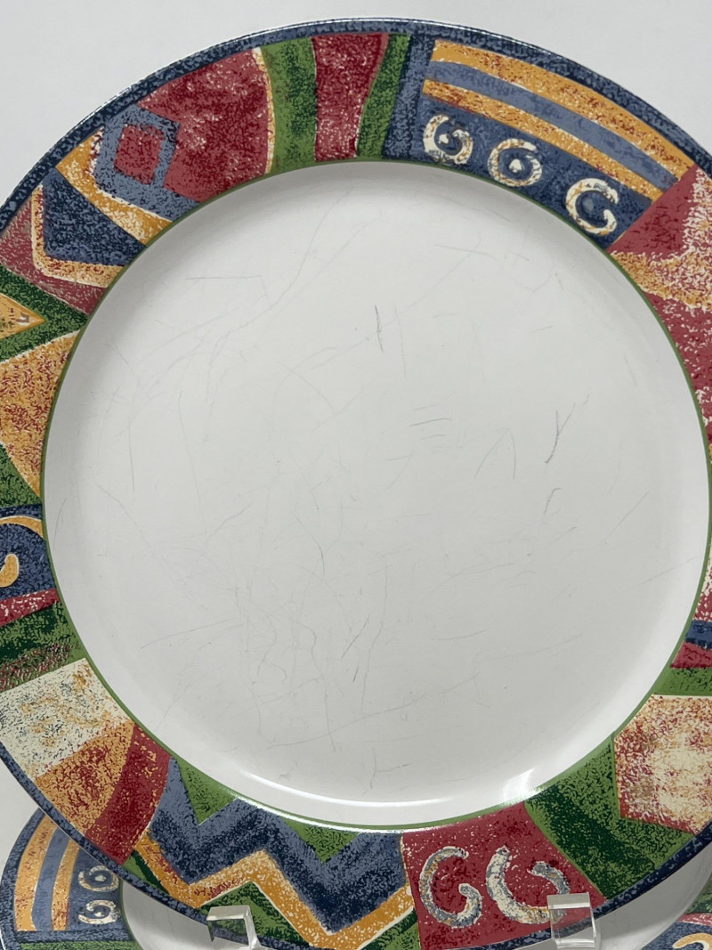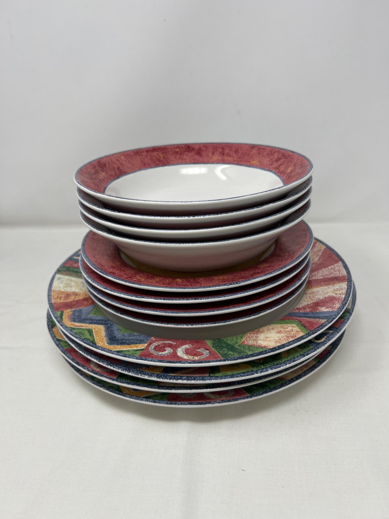 A casual dining place setting for four (4) from Oneida’s Sakura Malaga collection, featuring crisp white ceramic bordered with geometric Southwest motifs. The pattern evokes desert landscapes and artisan textiles—perfect for homes that blend modern simplicity with regional warmth. Durable and visually striking, this set is ideal for everyday meals, weekend gatherings, or collectors of 1990s–2000s era tableware with bold, intentional design.