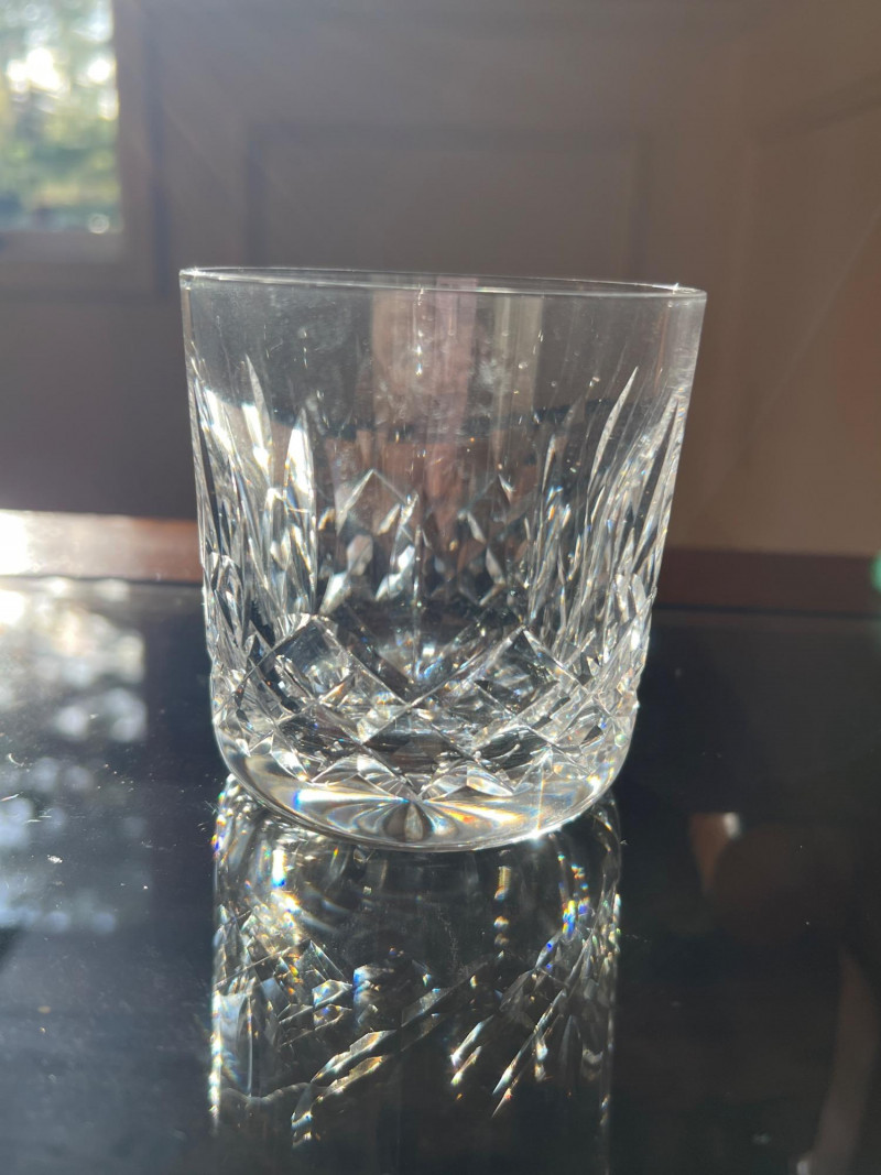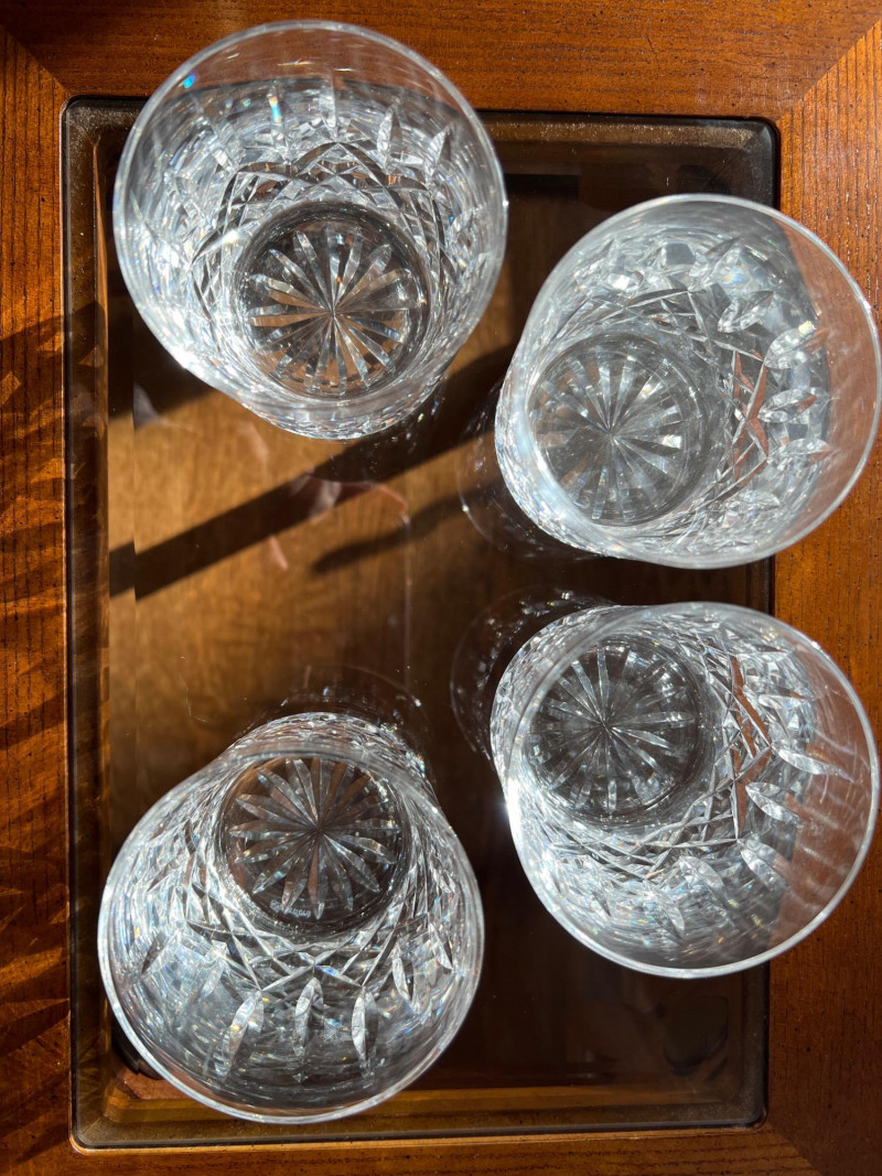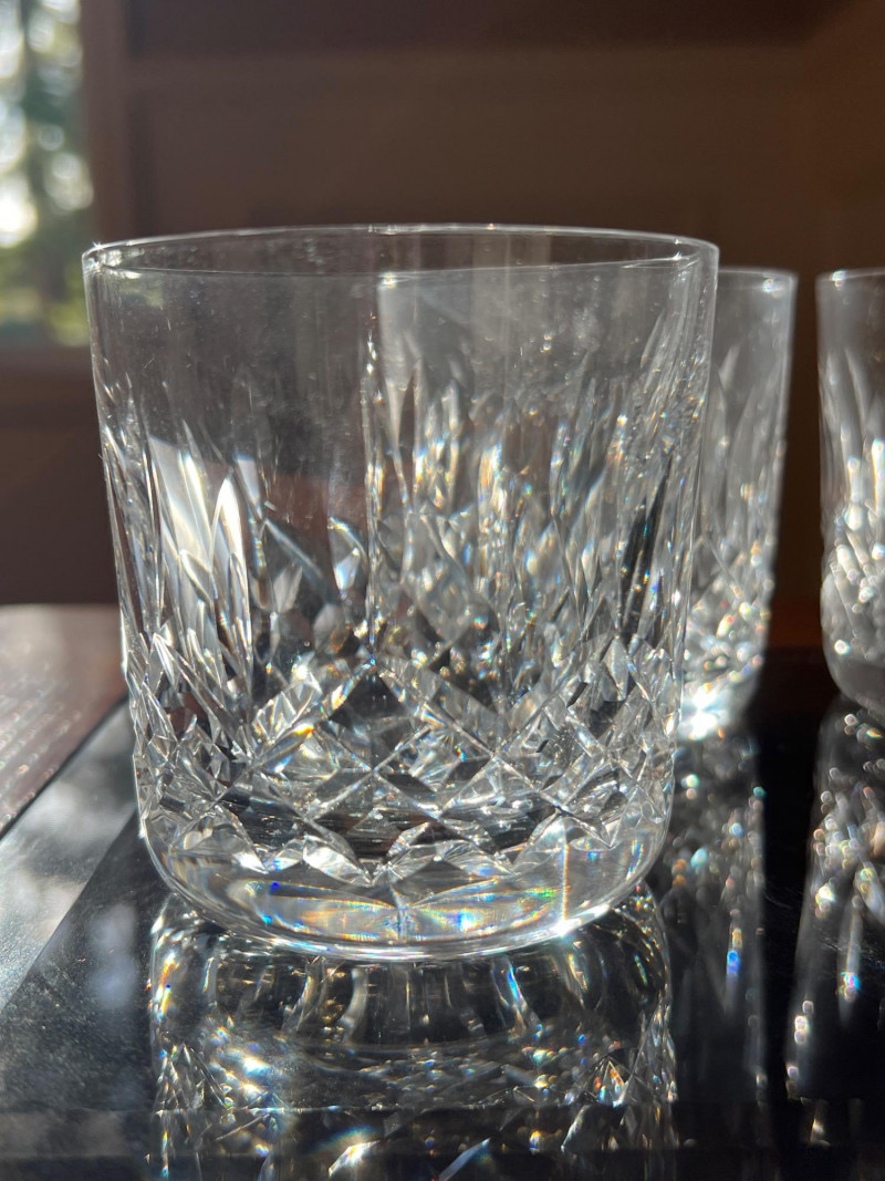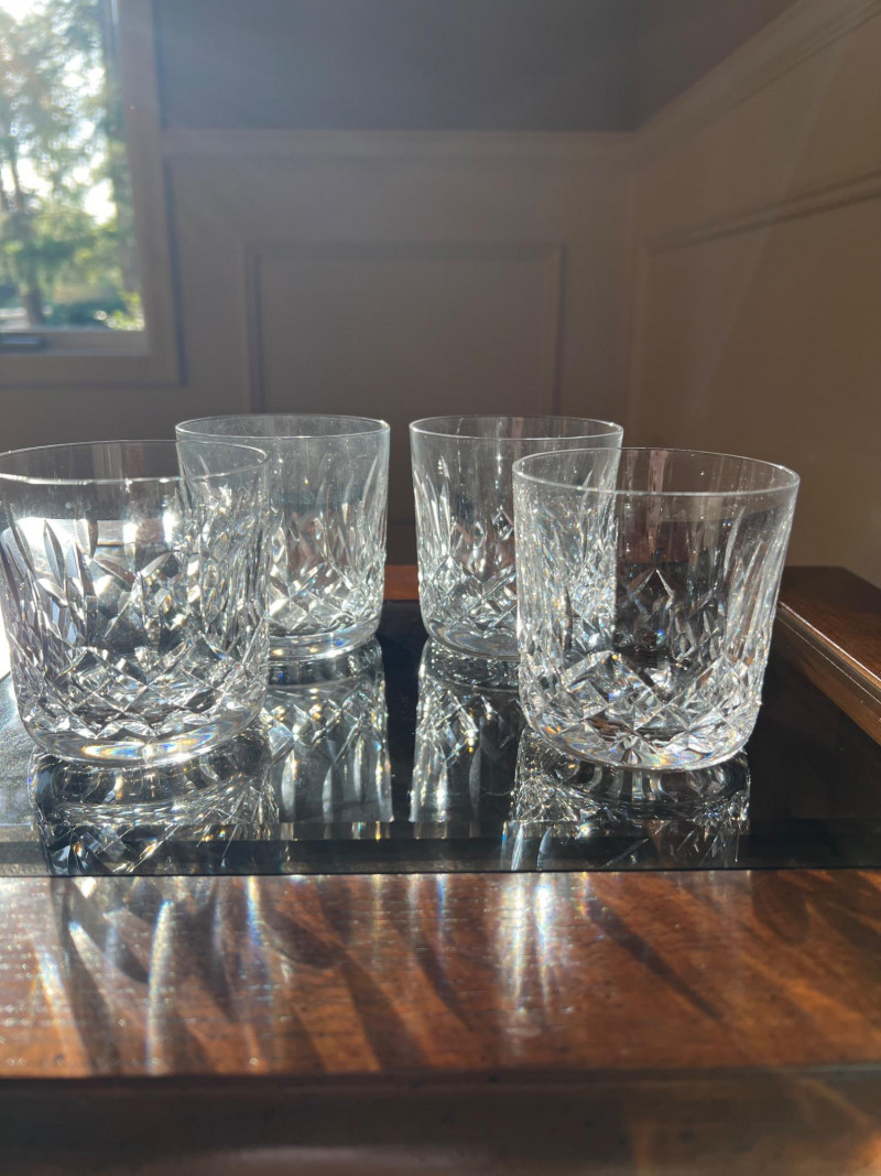 A set of four Waterford Lismore old fashioned tumblers, each showcasing the iconic diamond-and-wedge cut pattern that has defined Waterford crystal since 1952. With brilliant clarity and balanced weight, these glasses elevate any pour—whether whiskey, bourbon, or a favorite cocktail. Ideal for entertaining or gifting, they offer timeless sophistication and enduring craftsmanship.