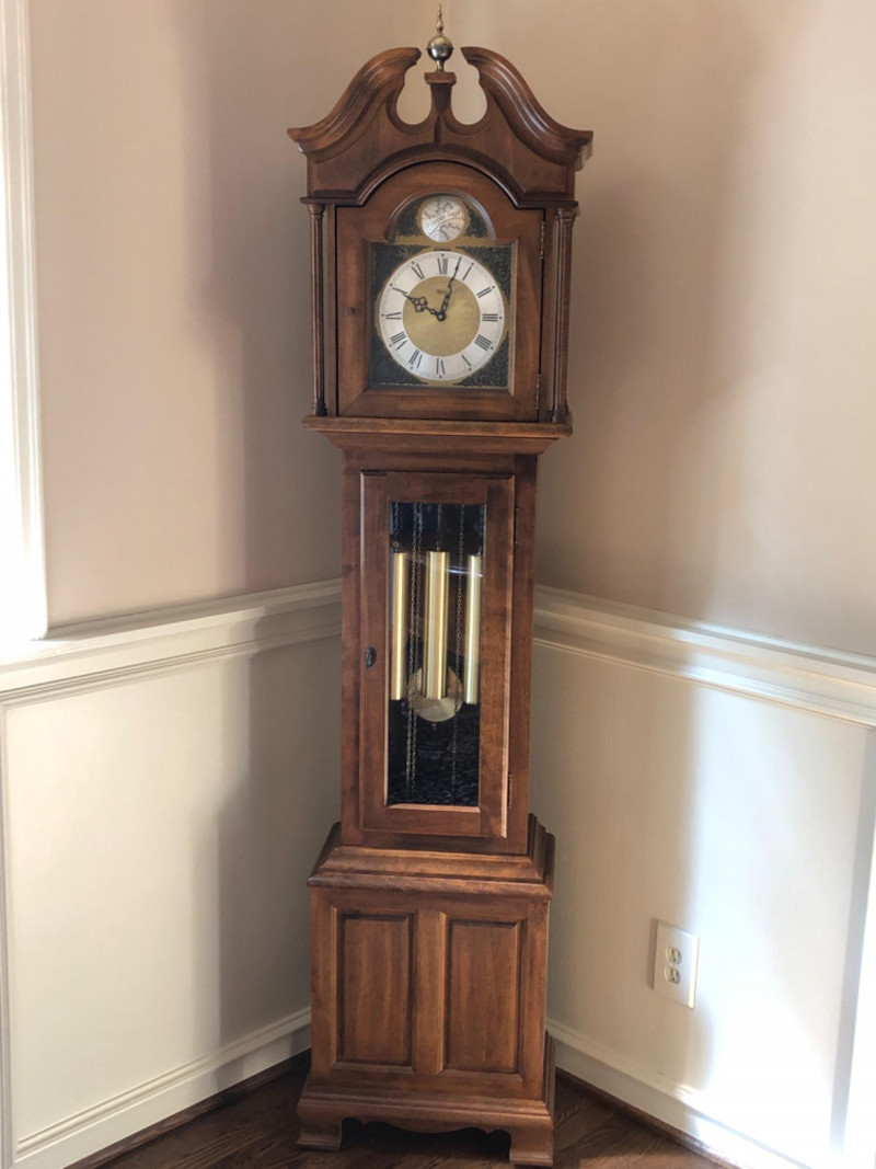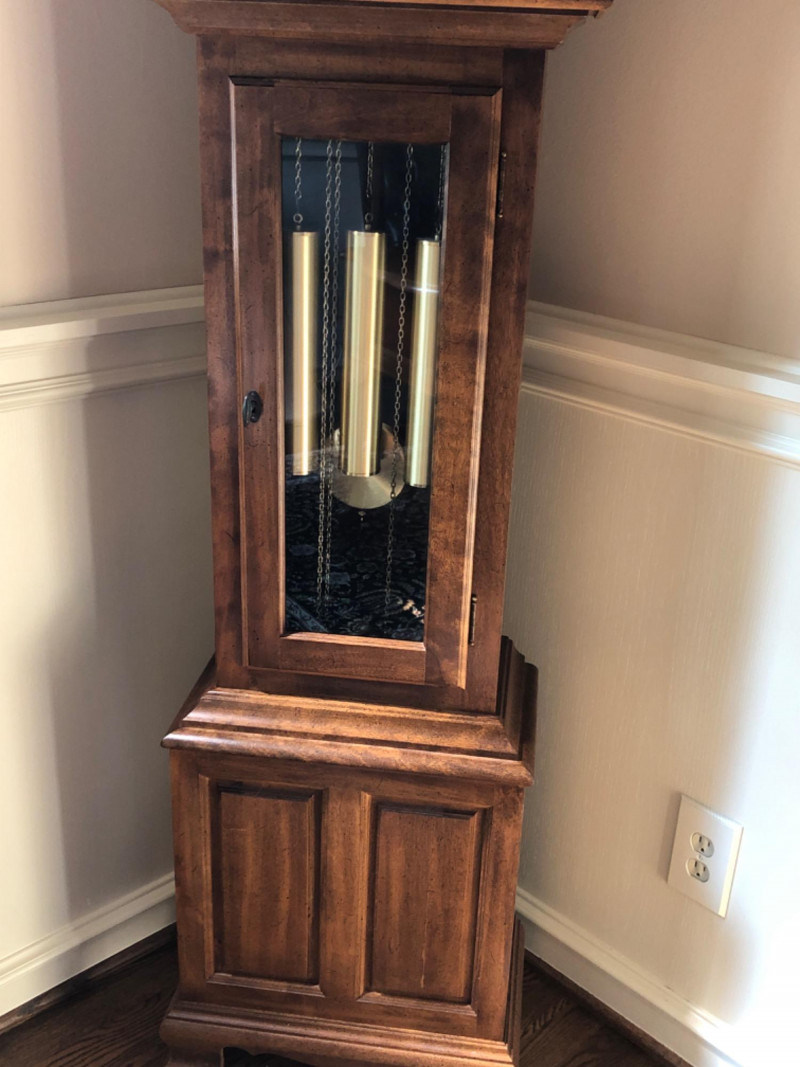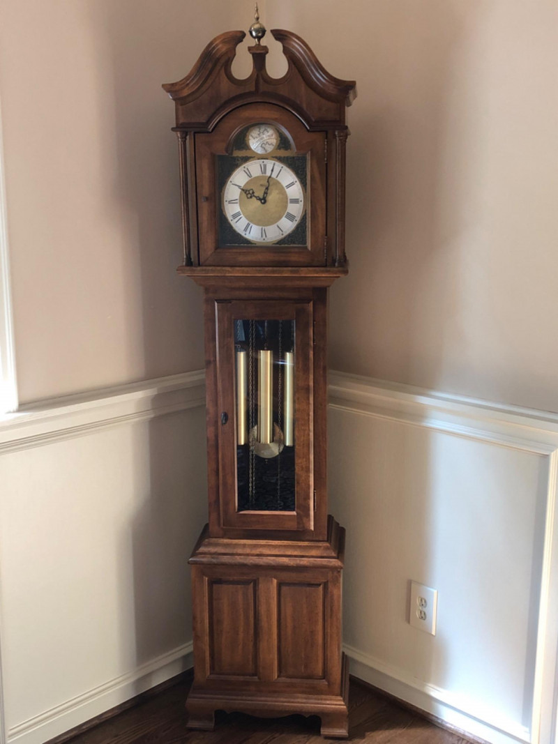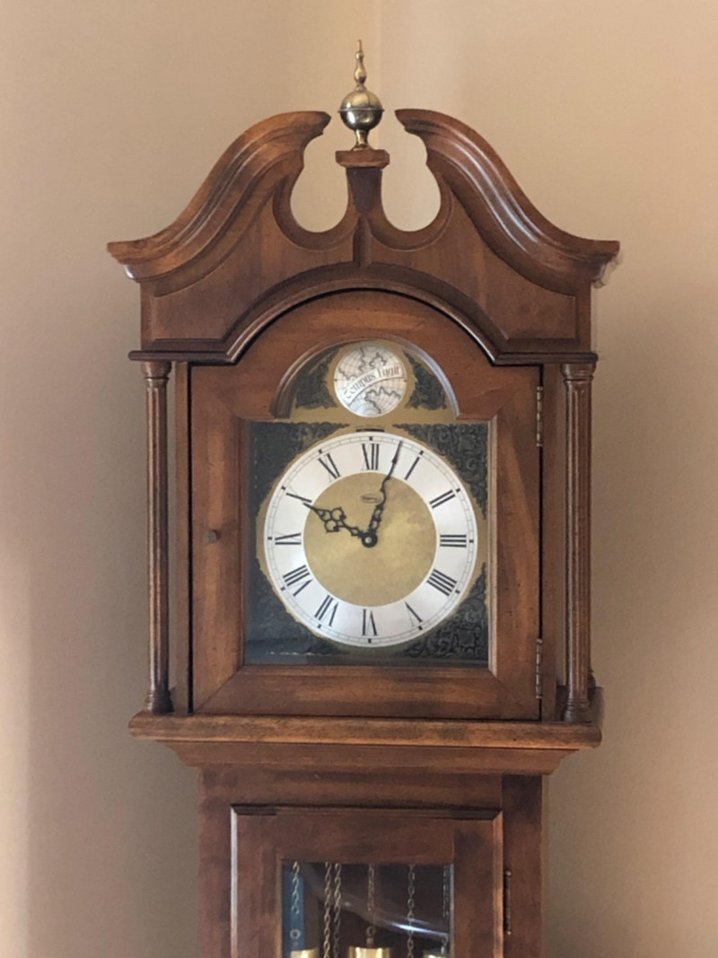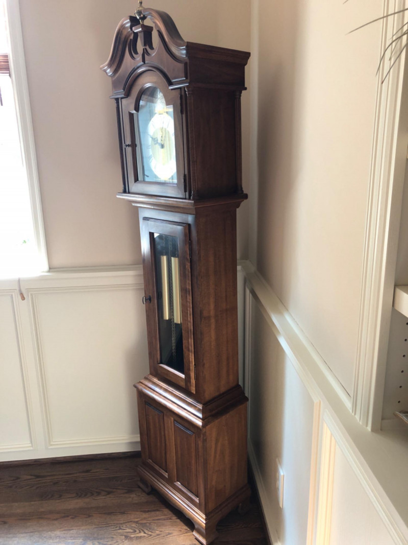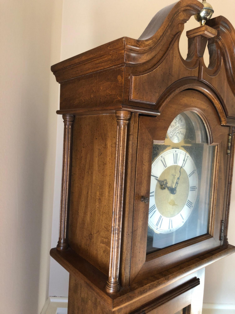 A stately Ridgeway grandmother clock, blending traditional craftsmanship with quiet grace. Its slender silhouette and rhythmic chime evoke the passage of time in homes where legacy lives and moments linger. Beautifully maintained timepiece with a stately presence for any home, or collector of American-made clocks.