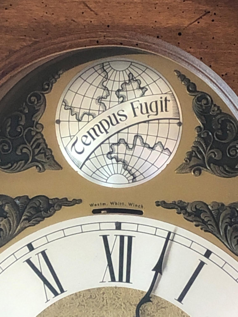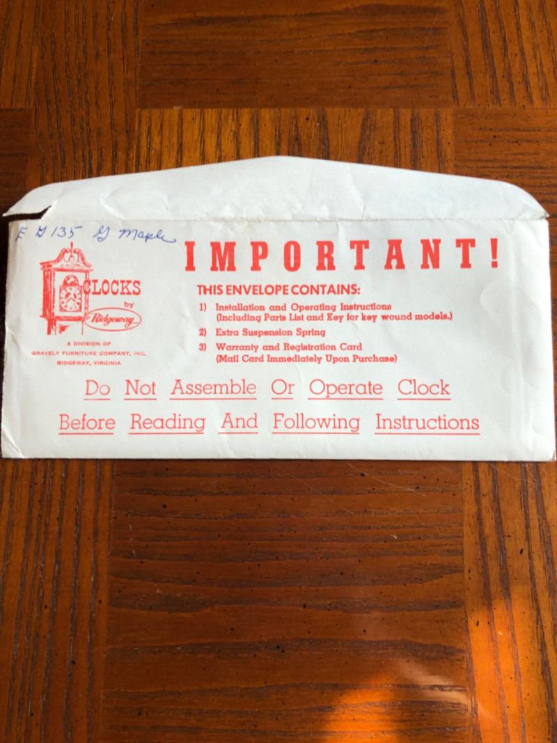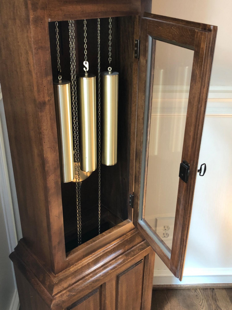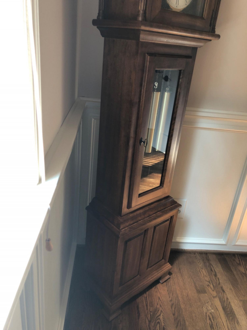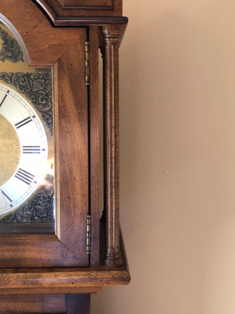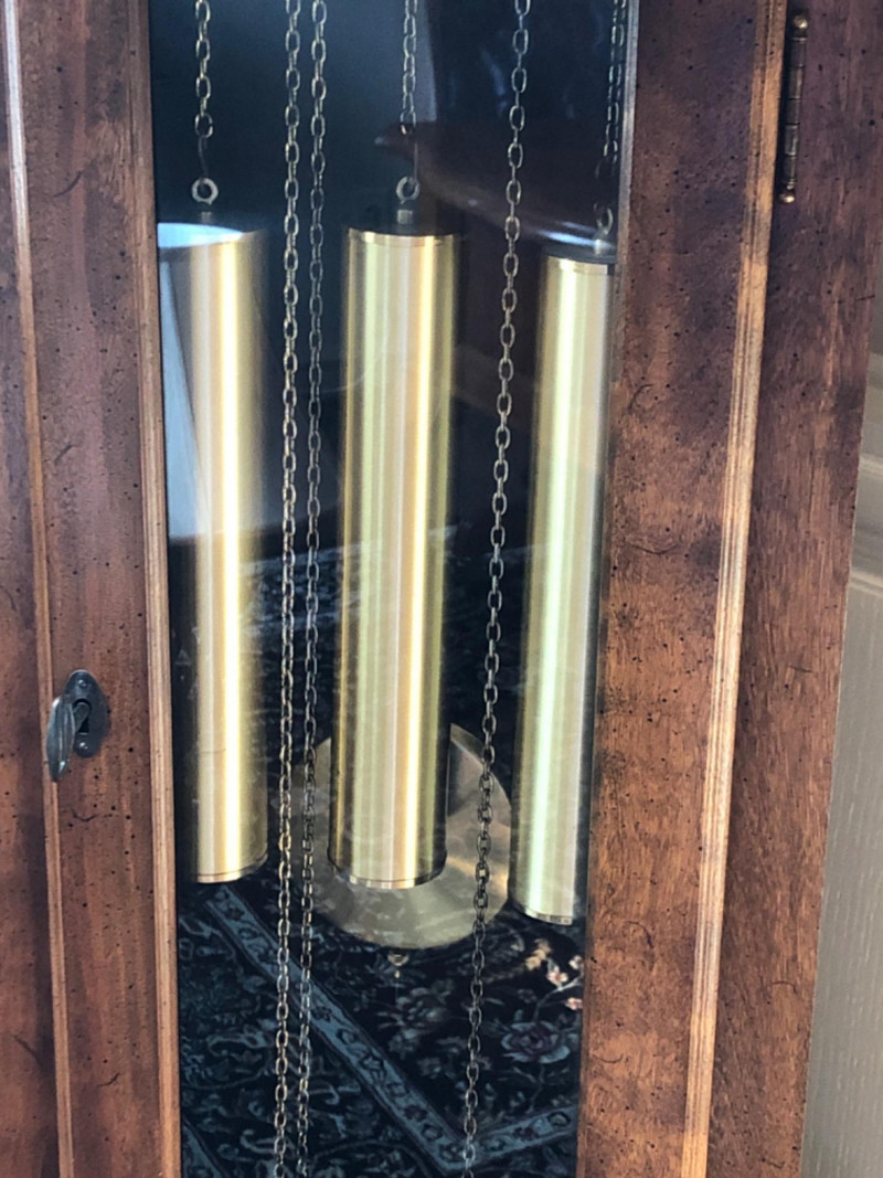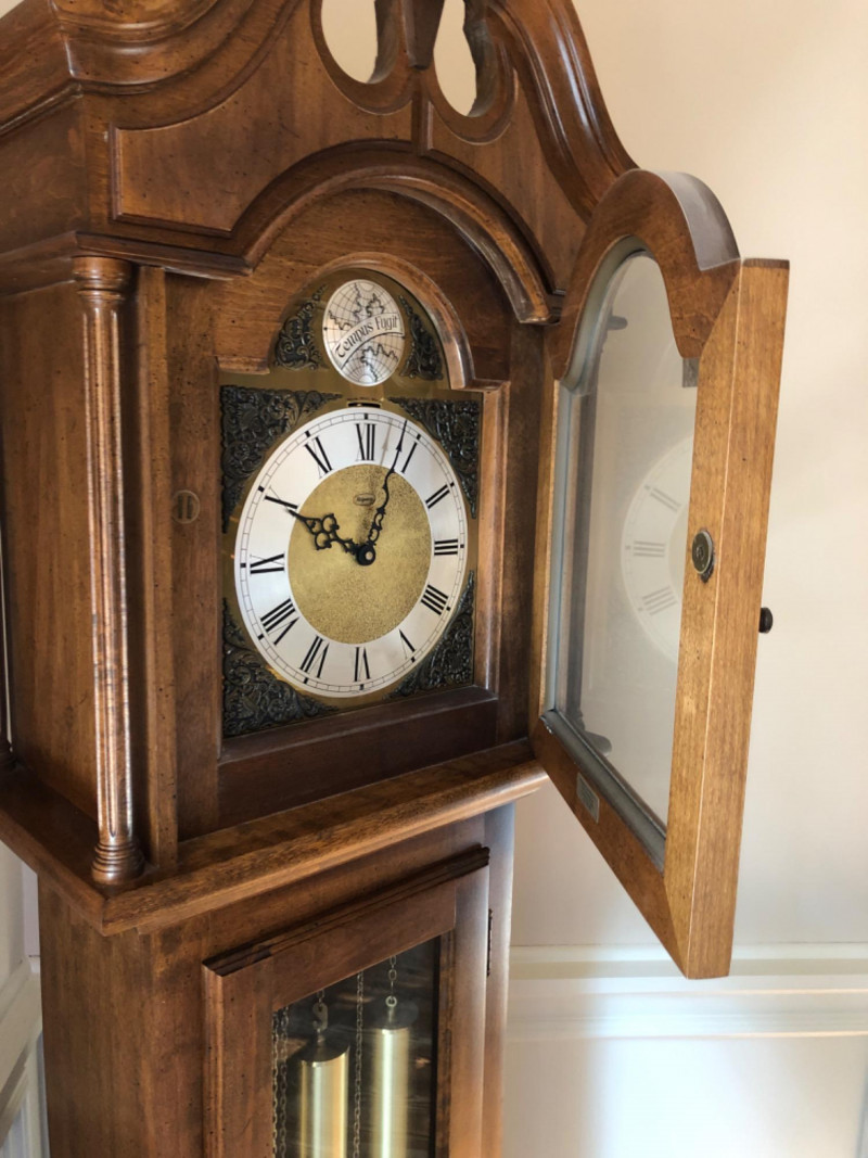 A stately Ridgeway grandmother clock, blending traditional craftsmanship with quiet grace. Its slender silhouette and rhythmic chime evoke the passage of time in homes where legacy lives and moments linger. Beautifully maintained timepiece with a stately presence for any home, or collector of American-made clocks.