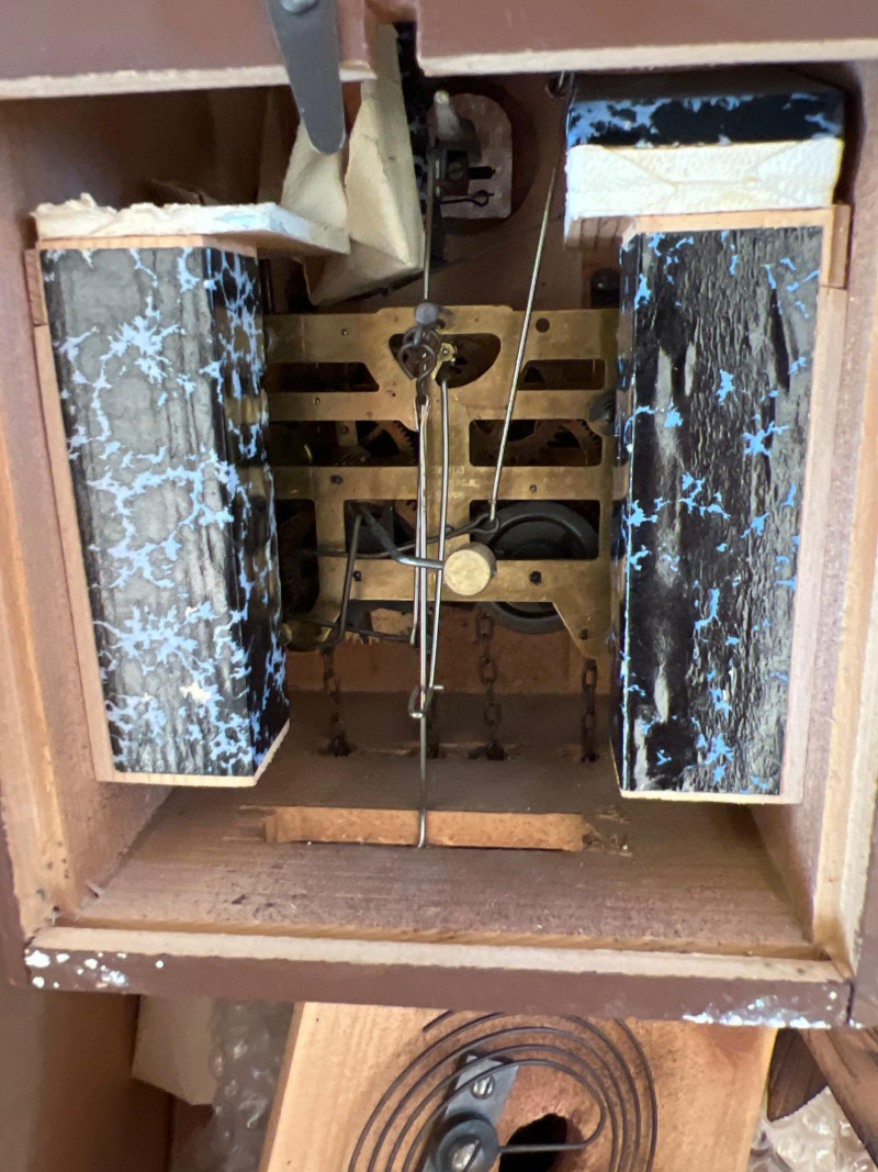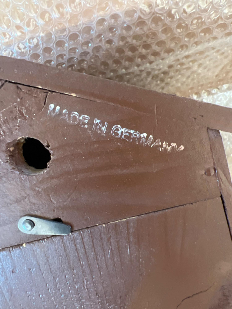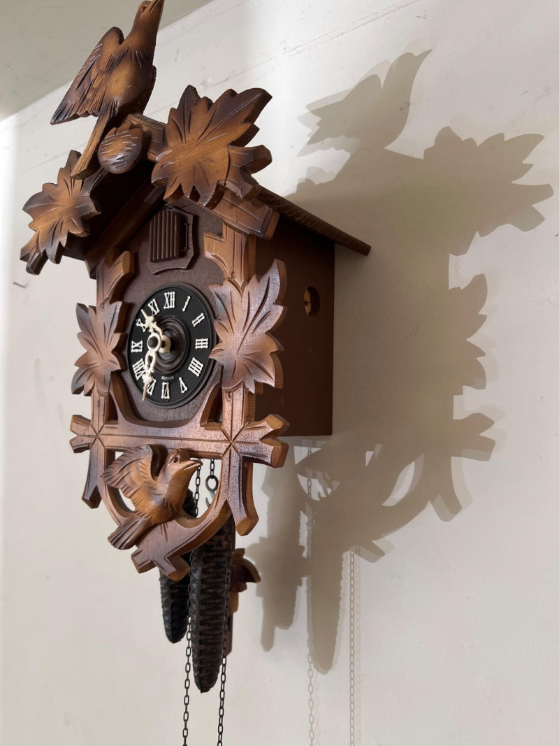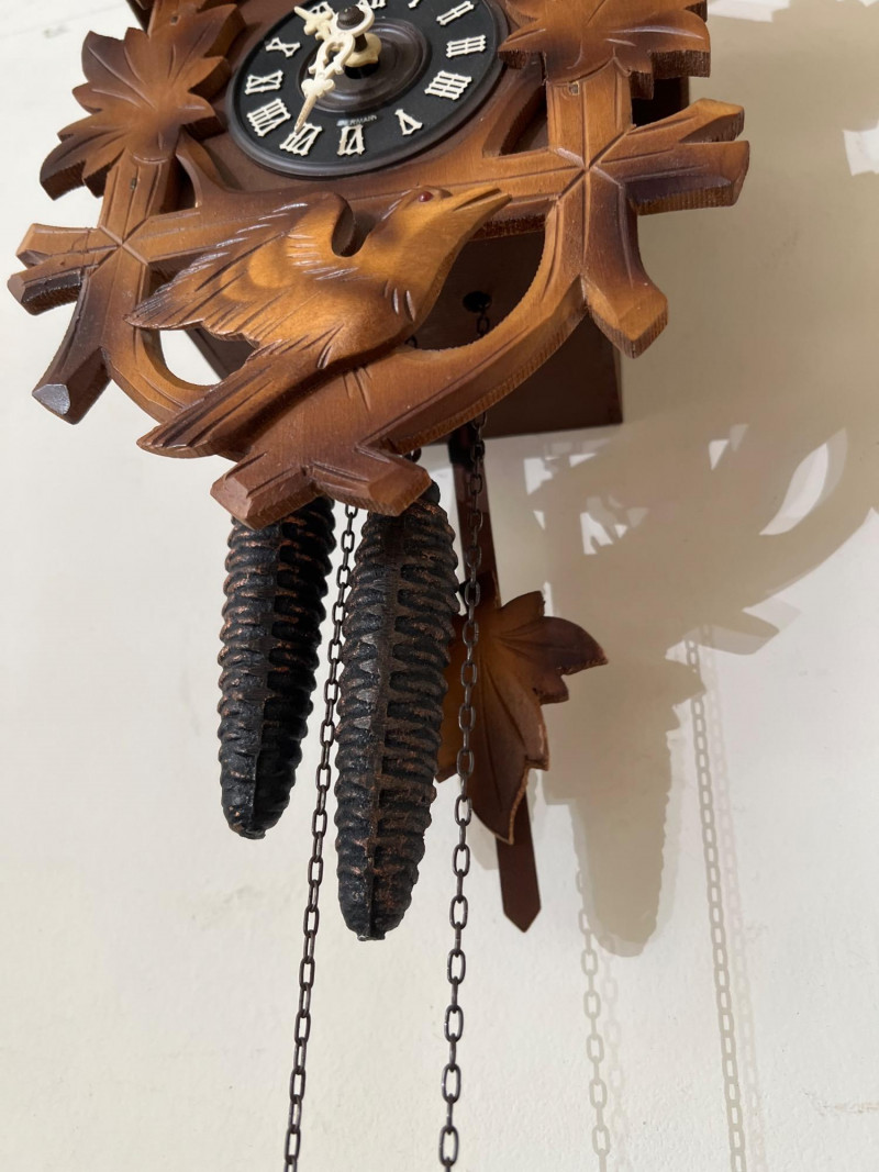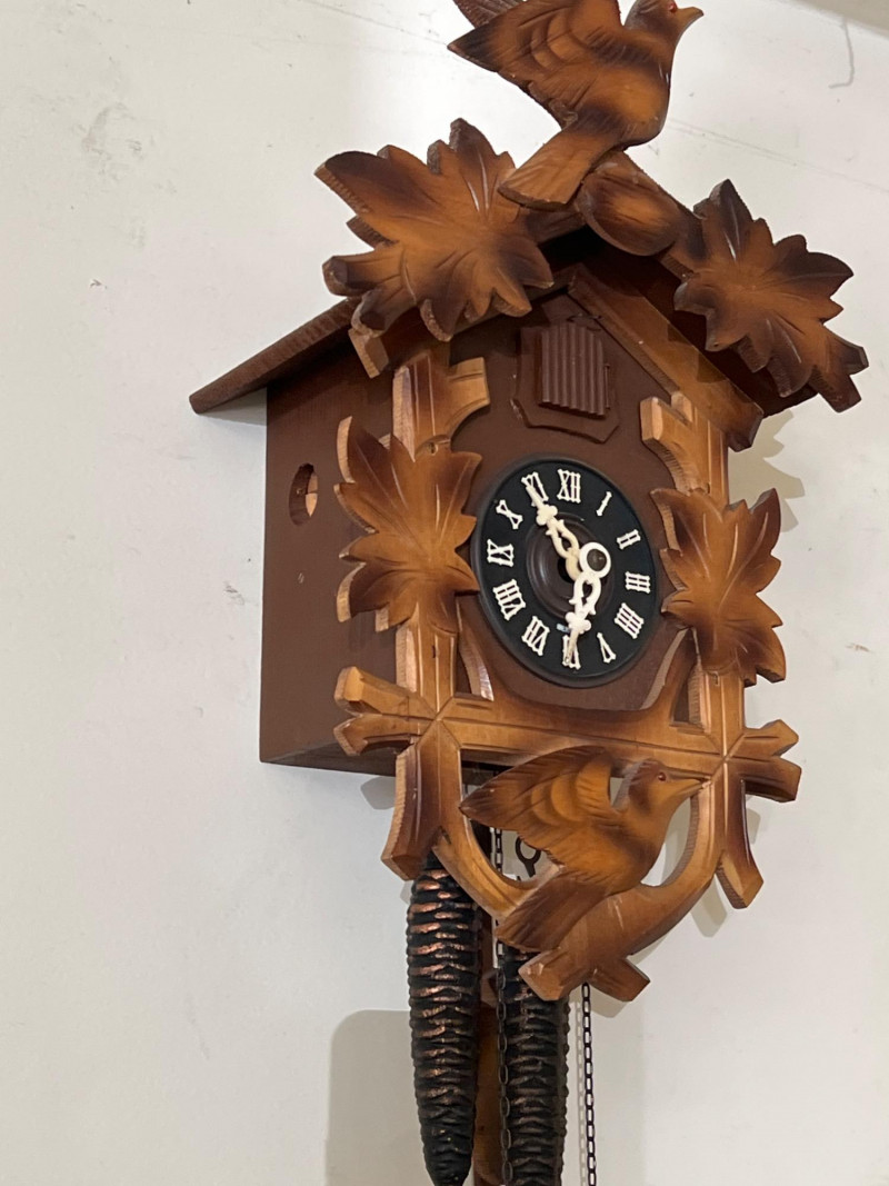 A traditional German cuckoo clock featuring a mechanical movement by Rockco Clock MFG. CO. LTD., a precision-focused maker. With hand-carved details and chalet-style charm, this piece evokes the warmth of alpine craftsmanship and mid-century nostalgia. The movement is engraved with Rockco’s name and serial number (100/171). Clock is in working condition but may still need to be serviced as it has been stored.