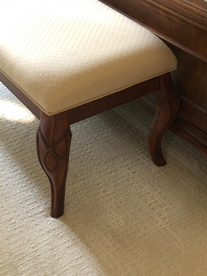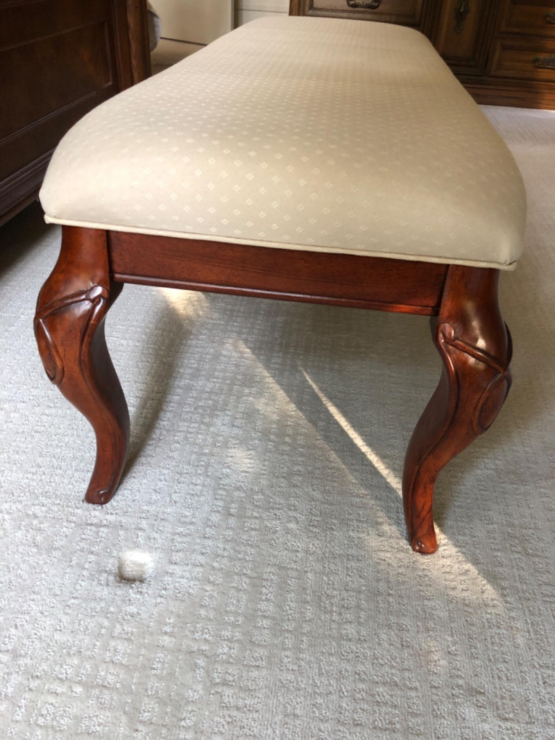 A graceful Queen Anne style bench by Legacy Classic Furniture featuring a carved cherry wood frame and a softly upholstered padded seat in neutral fabric. Measuring 52" in length, this piece blends comfort with classic design—ideal for placement at the foot of a bed, in an entryway, or as a refined accent in a sitting room. The cabriole legs and gentle curves evoke timeless elegance, while the neutral upholstery ensures versatility across traditional and transitional interiors. Fabric appears to have been spot cleaned.