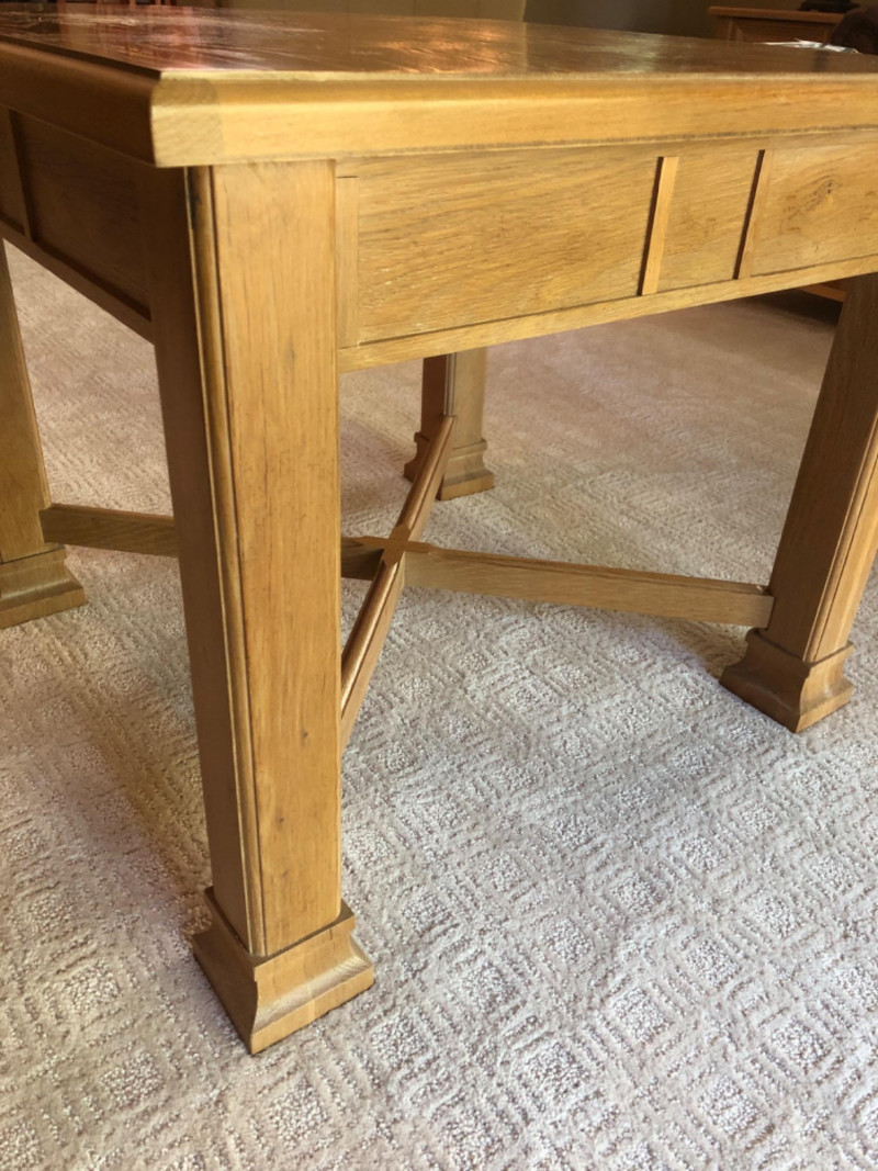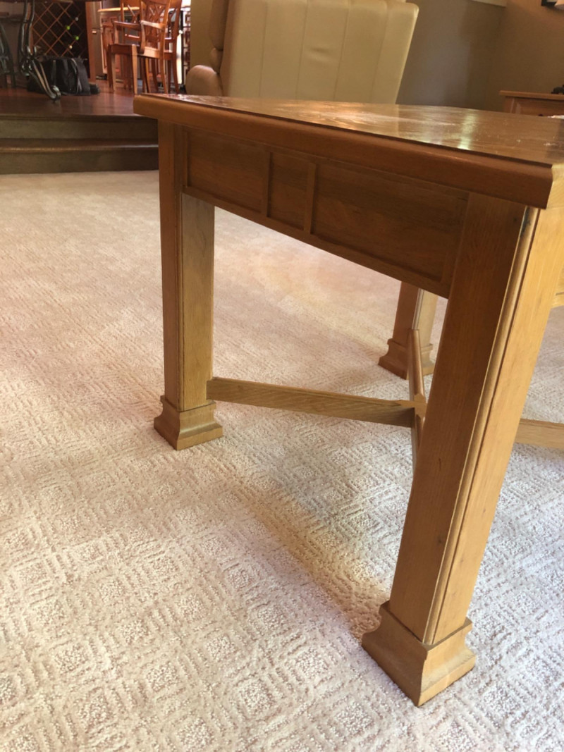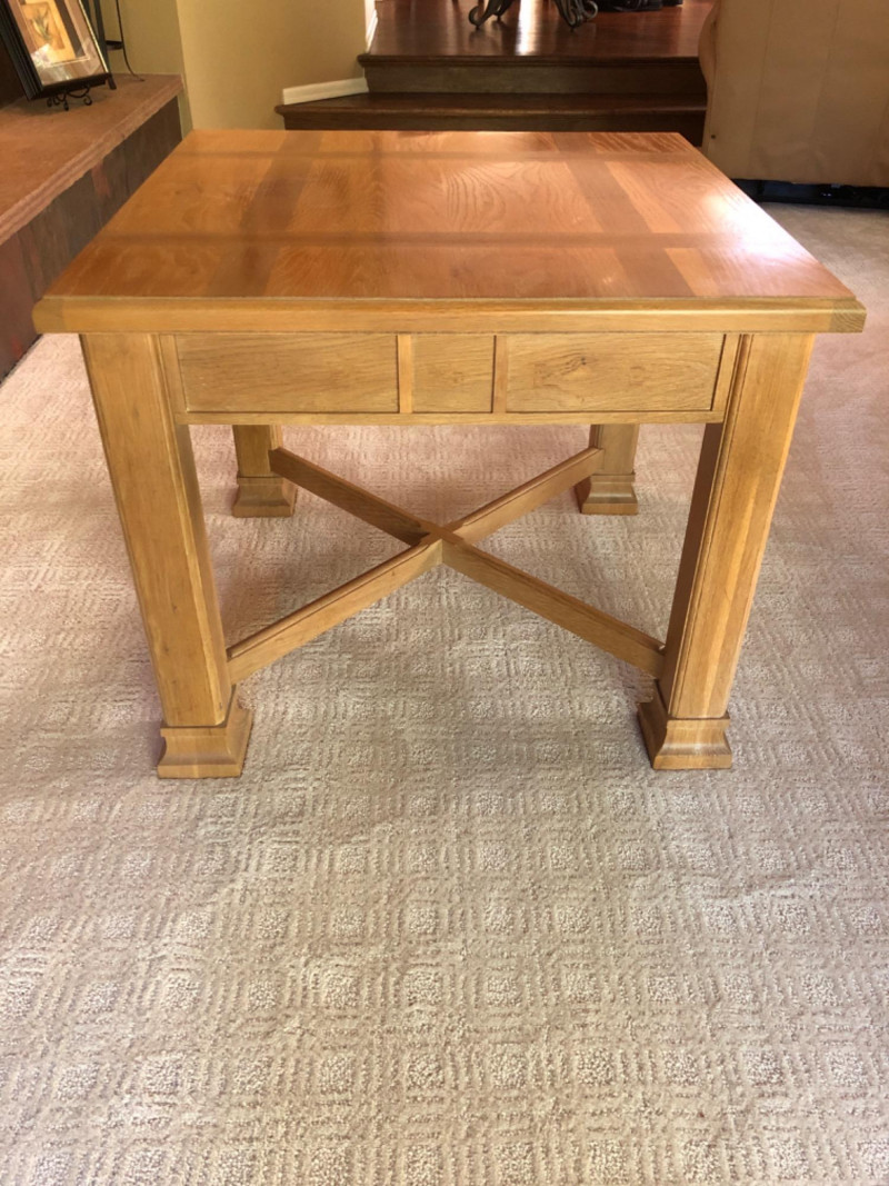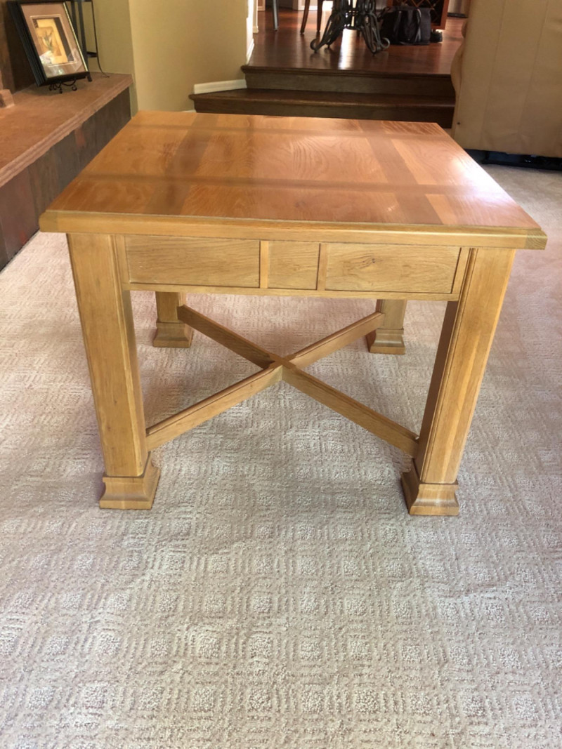 A refined Thomasville square end table in a warm blonde wood finish, featuring a distinctive criss-cross inlay pattern across the tabletop. With clean lines and subtle geometric detailing, this piece blends mid-century charm with timeless craftsmanship. Ideal as a side table, reading nook anchor, or accent piece, it offers both function and visual interest—perfect for interiors that favor understated elegance and heritage design.