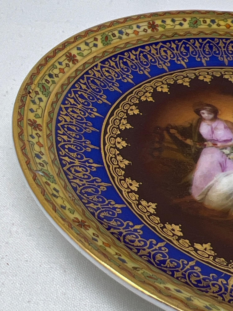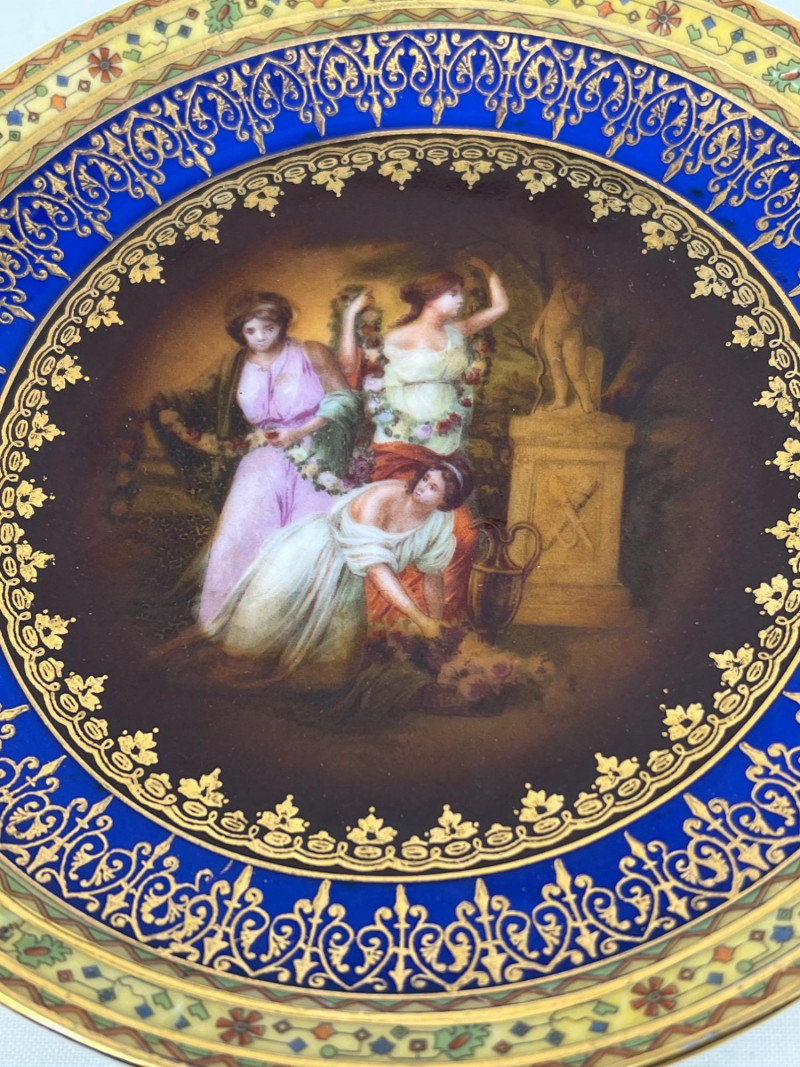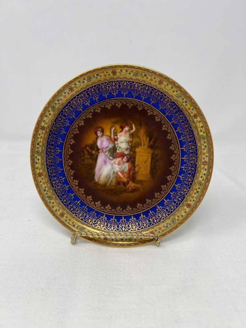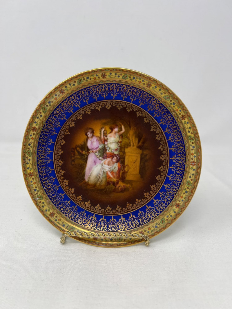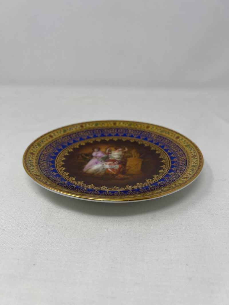 A decorative porcelain plate featuring a hand-painted classical scene of maidens and a child, encircled by intricate cobalt blue and gold scrollwork.