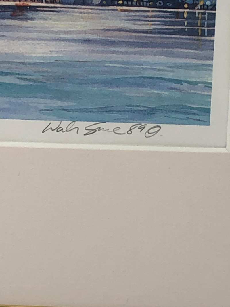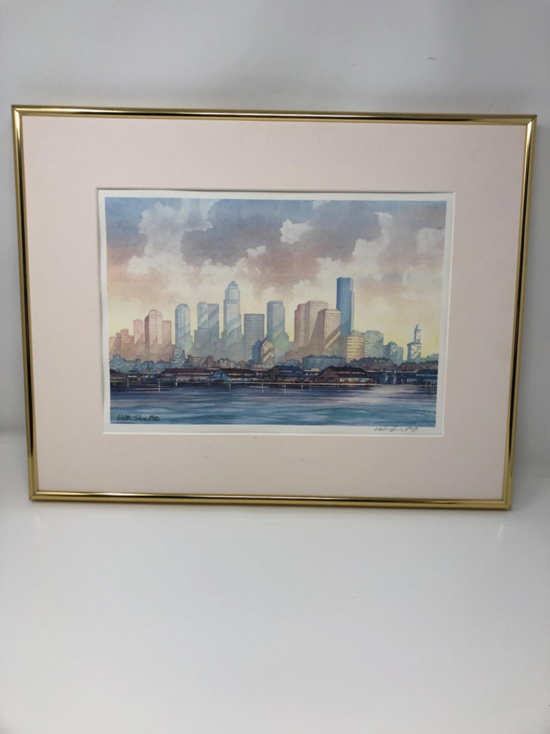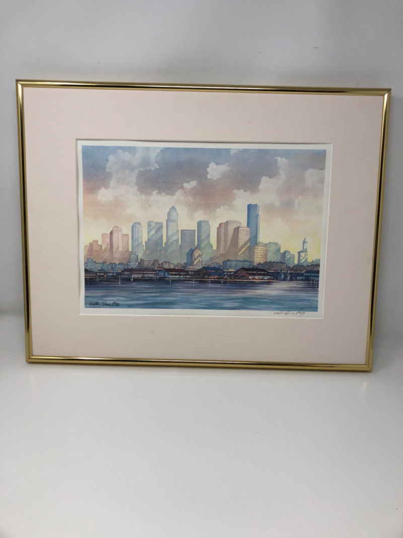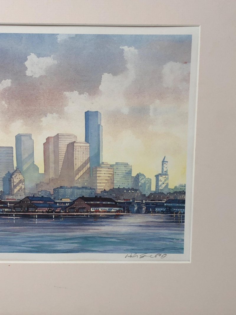 An original 1989 watercolor by Walter Share depicting the Seattle waterfront with its layered cityscape rising in the background. Rendered in expressive washes and atmospheric tones, the painting captures the architectural rhythm and coastal mood of Seattle’s urban shoreline. Framed and matted, no glass.