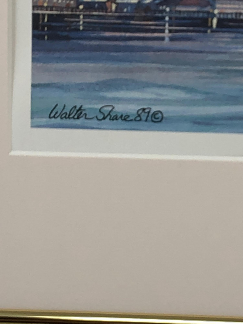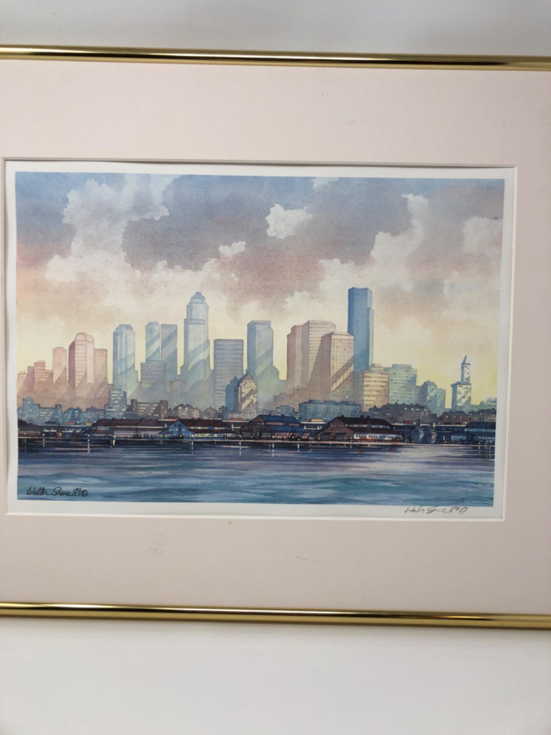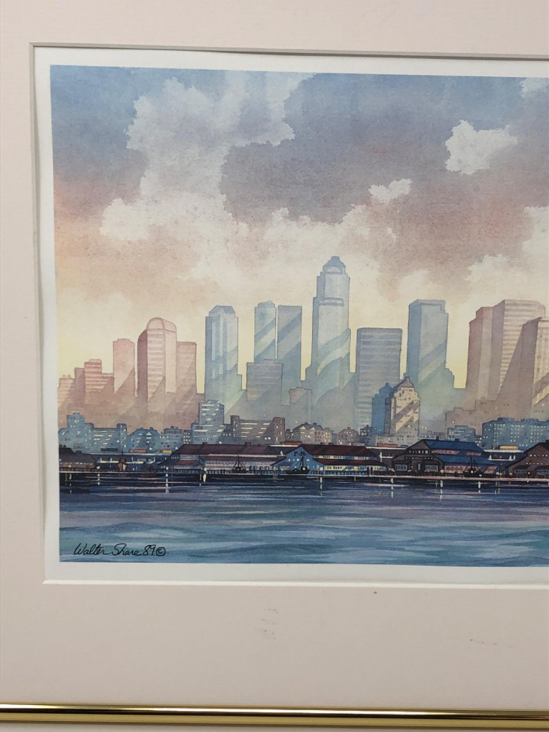 Lot # 123 - Walter Share Watercolor – 1989 Seattle Waterfront Skyline, Framed