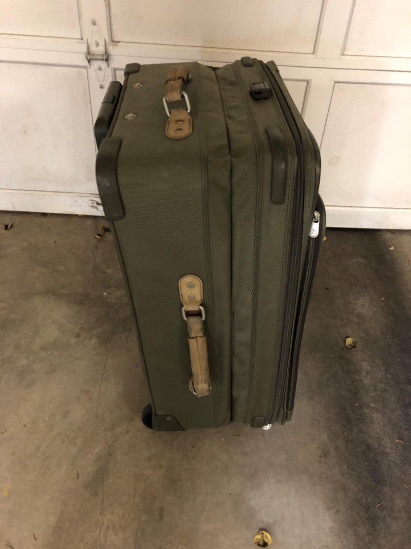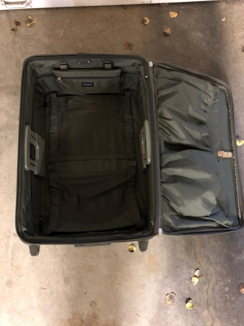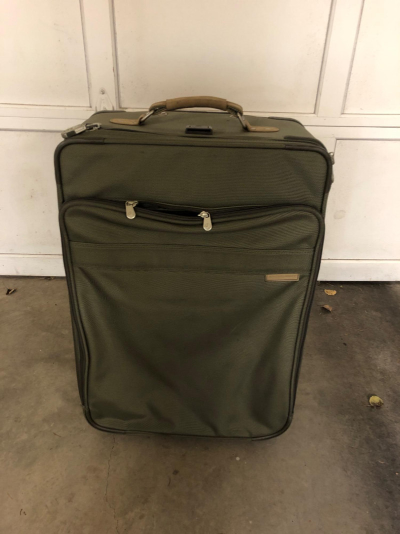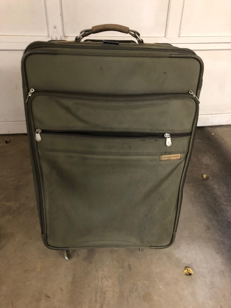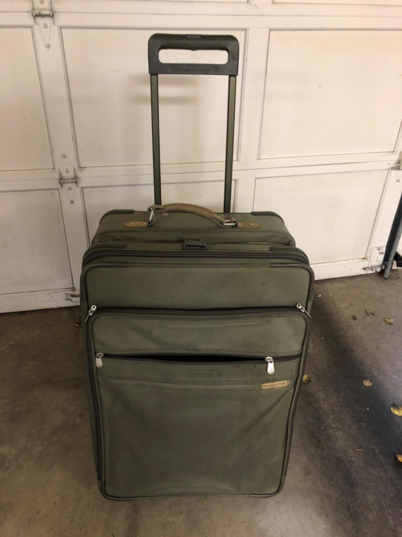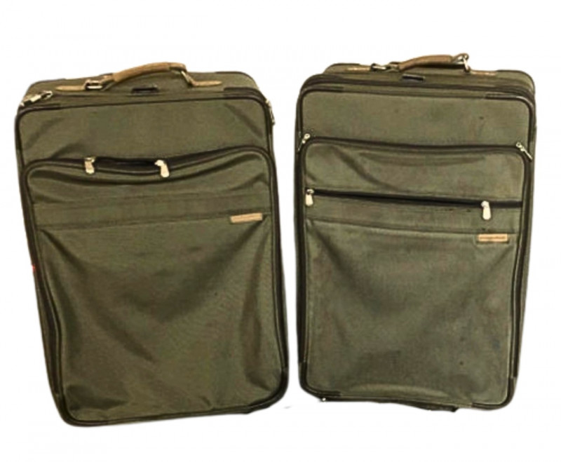 A matched pair of Briggs & Riley suitcases in army green, known for their rugged construction and thoughtful design. These soft-sided cases offer generous packing space with reinforced corners, smooth-rolling wheels, and expandable compartments. Dimensions are approximately 28" W x 18" L x 13" H and 28" W x 18" L x 11" H. Ideal for frequent travelers or those seeking high-quality luggage with understated style.