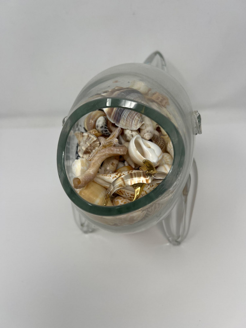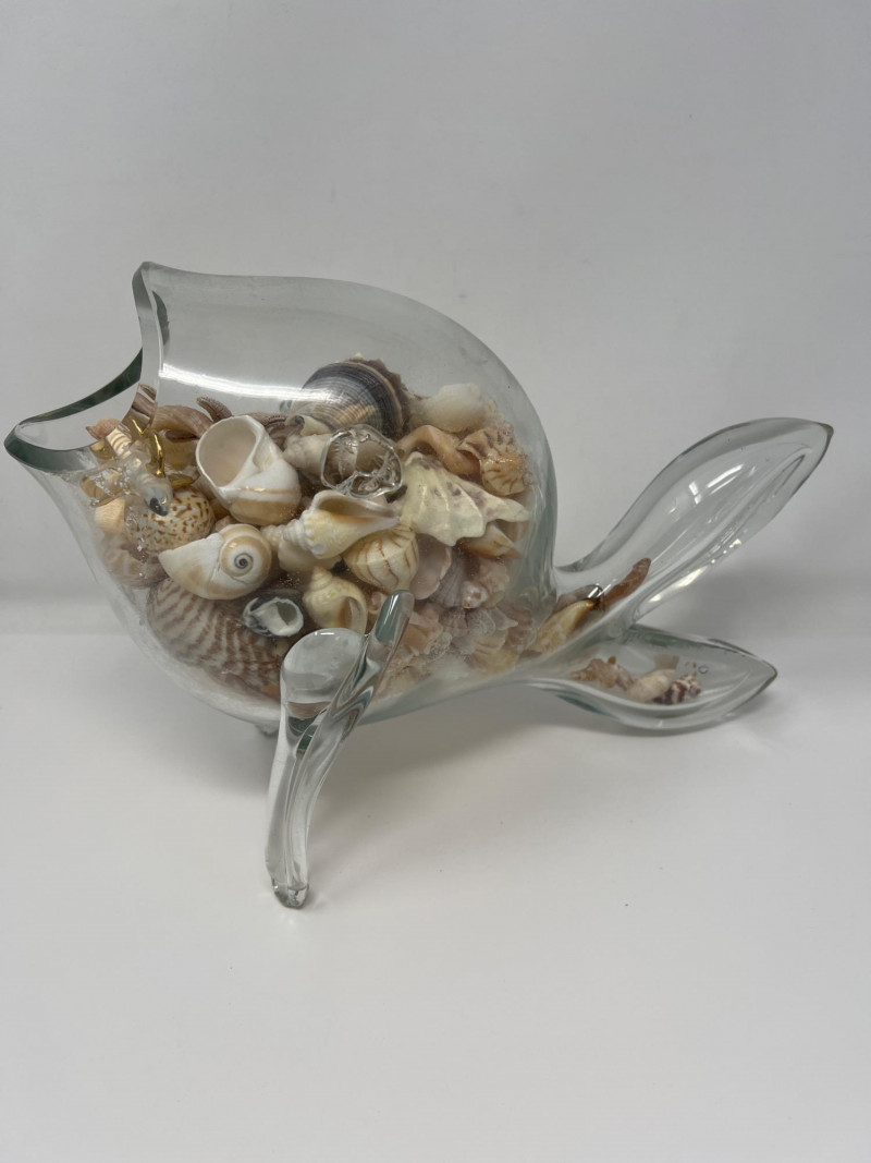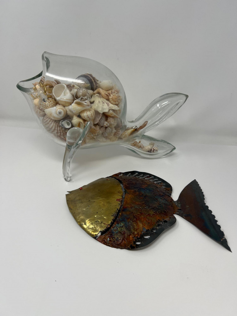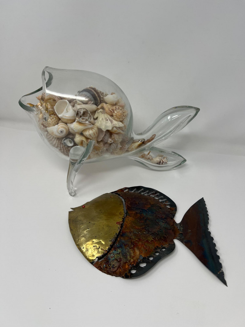 A whimsical decorative pairing featuring: A clear glass fish sculpture in the style of Blenko, filled with assorted seashells. Measures approximately 13" long x 5" wide x 8" high. A metal art fish (9" length x 7" height) with stylized form and coastal flair, offering a playful contrast in texture and tone. Together, these pieces evoke a breezy, beach-inspired aesthetic—perfect for shelf styling, nautical décor, or collectors of glass and metal art.
