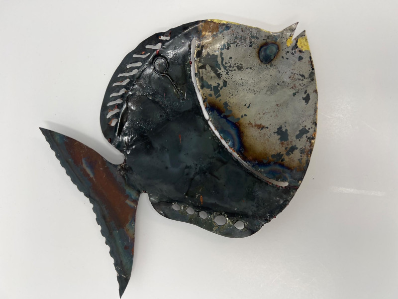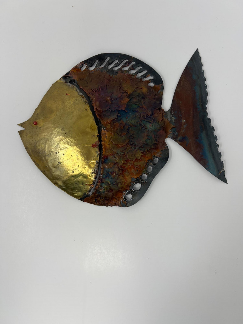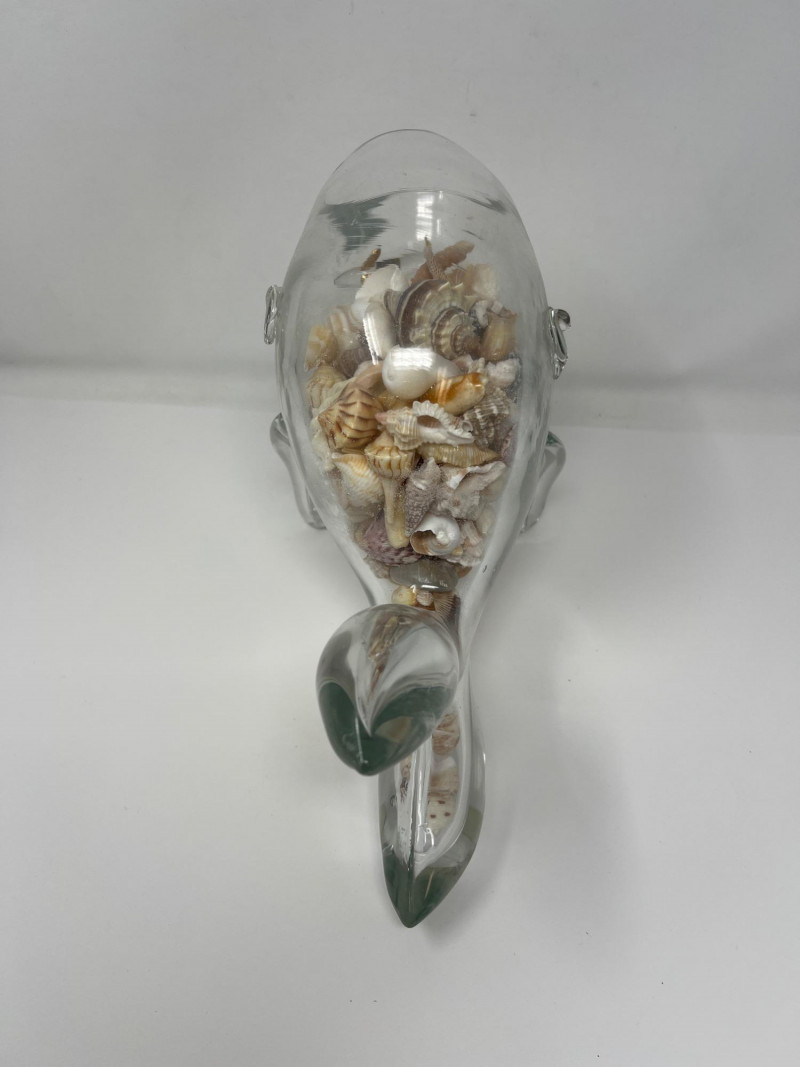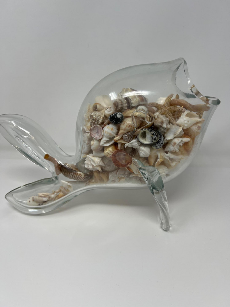 A whimsical decorative pairing featuring: A clear glass fish sculpture in the style of Blenko, filled with assorted seashells. Measures approximately 13" long x 5" wide x 8" high. A metal art fish (9" length x 7" height) with stylized form and coastal flair, offering a playful contrast in texture and tone. Together, these pieces evoke a breezy, beach-inspired aesthetic—perfect for shelf styling, nautical décor, or collectors of glass and metal art.