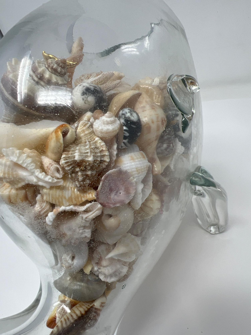 Lot # 128 - Blenko Style Clear Glass Fish Filled with Shells & Metal Art Fish