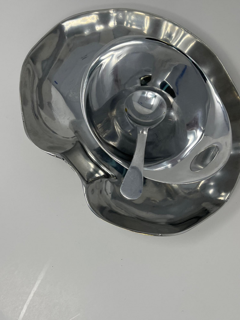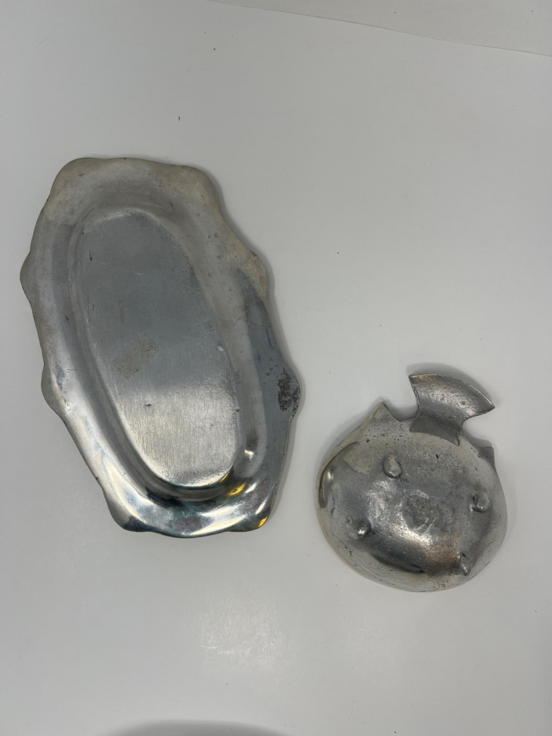 A varied selection of Mexican pewterware ranging from 4" to 14" in size. This lot includes serving and decorative pieces with sculptural forms and a warm silvery finish, characteristic of handcrafted pewter. Ideal for entertaining or display, these pieces blend rustic charm with artisanal craftsmanship. A versatile addition to vintage kitchenware or global-inspired décor.