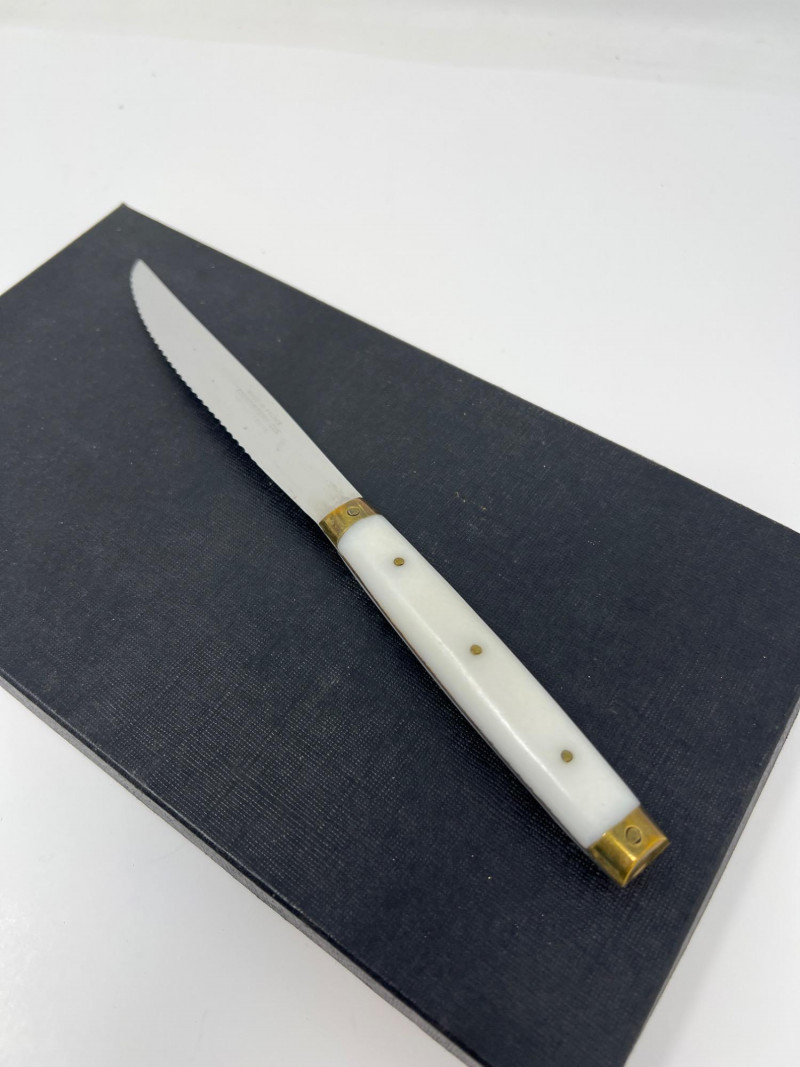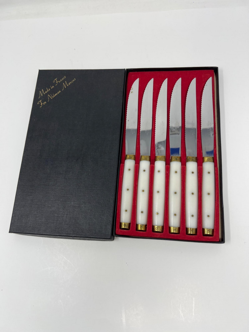 A vintage set of six Neiman Marcus cutlery utensils, crafted in France with elegant lines and balanced weight. This refined set includes matching pieces ideal for formal dining or display, blending understated luxury with European craftsmanship. Perfect for collectors or hosts seeking distinctive flatware with heritage appeal.