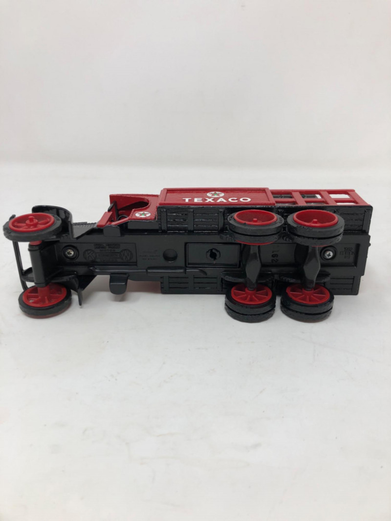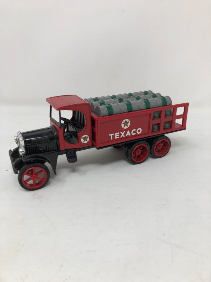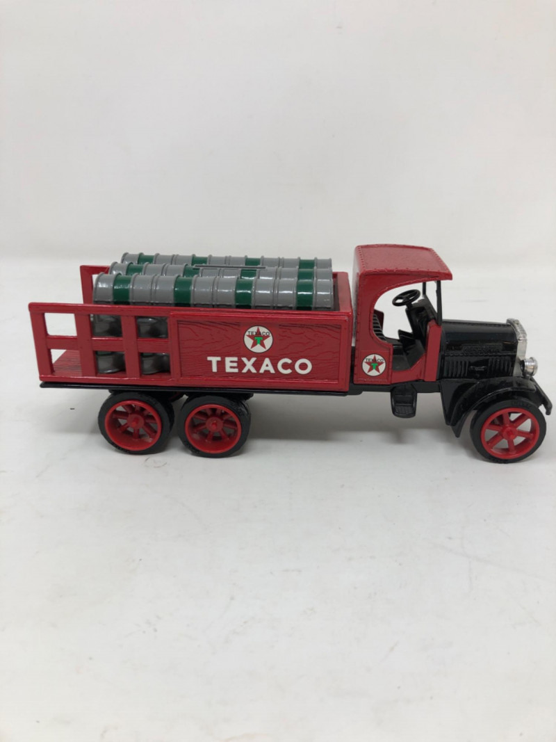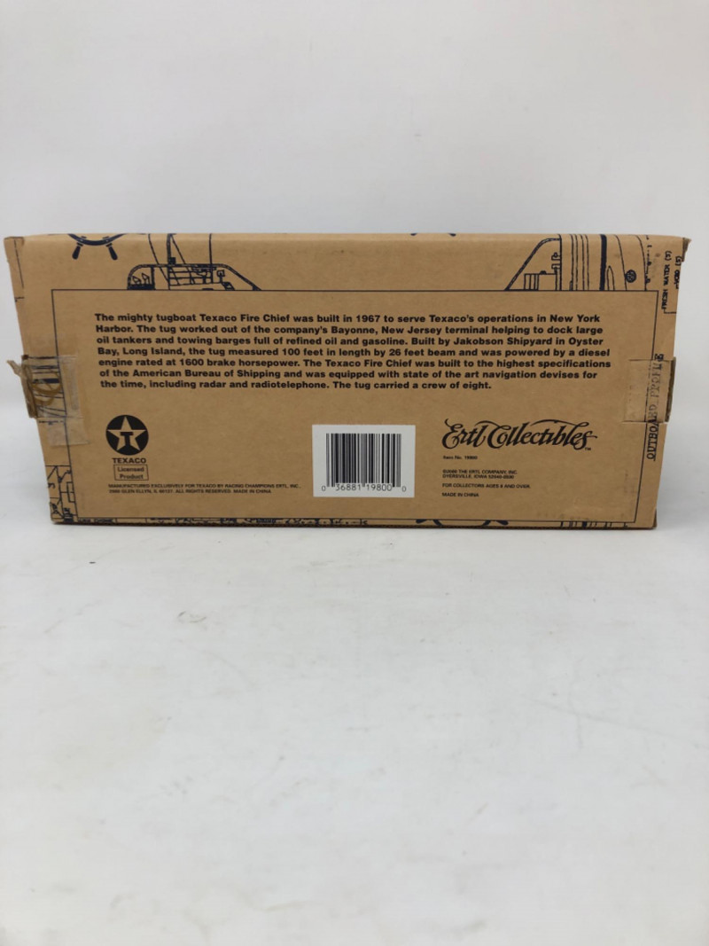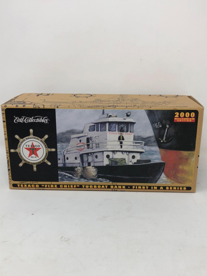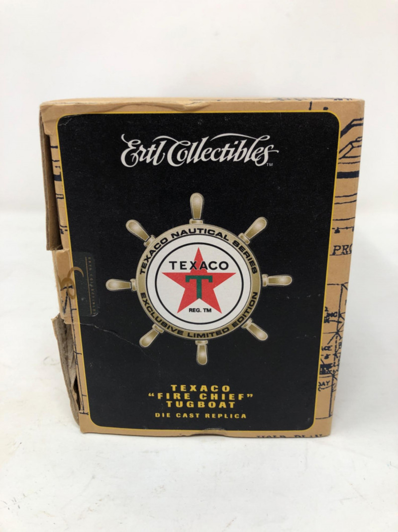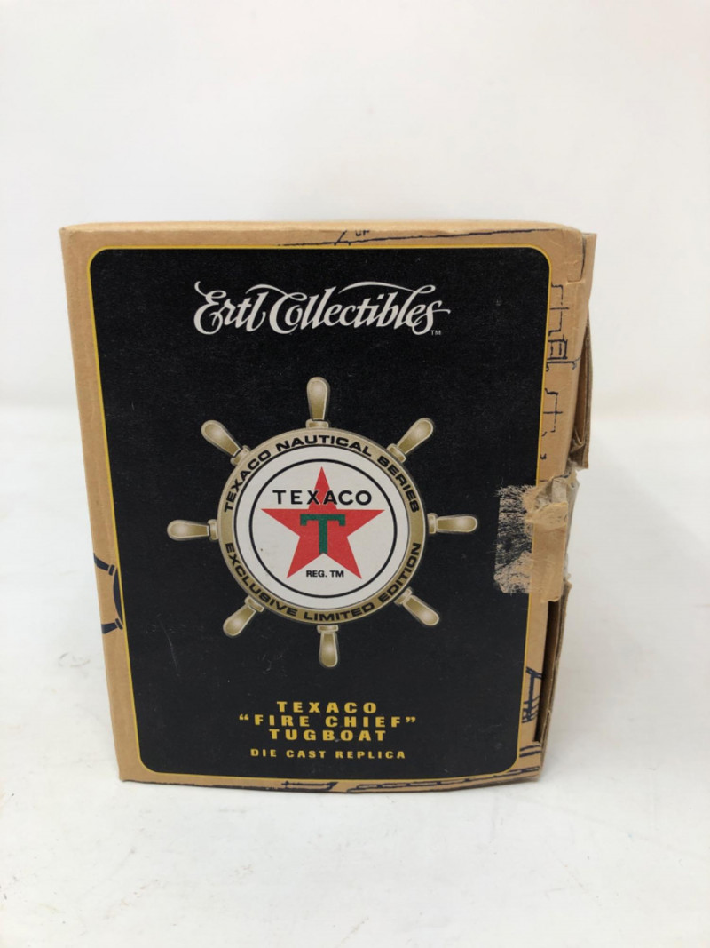 A nostalgic tribute to American service station history, this lot features a collection of ERTL Texaco die-cast banks, each modeled after vintage vehicles. Produced in the 1990s and early 2000s, these officially licensed replicas were part of ERTL’s limited-edition series celebrating Texaco’s iconic branding. Each bank is crafted in sturdy die-cast metal with rolling wheels, detailed paintwork, and coin slots discreetly integrated into the design. The Texaco "Fire Chief" Tugboat is in its original box with certification. Whether displayed on a shelf or gifted to a collector of automotive memorabilia, these vehicles evoke a bygone era of roadside Americana and industrial charm. Fire Chief Tugboat - 9 inches length x 4 inches height x 2 inches width Trucks - 8.5 inches length x 3.5 inches height x 2.5 inches width and two at 7.5 inches length x 2.5 inches height and 2.5 inches width