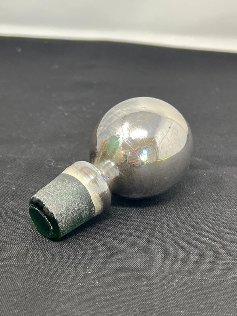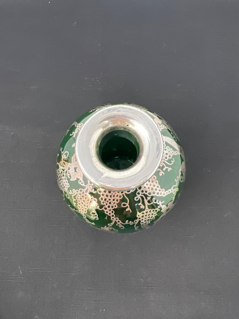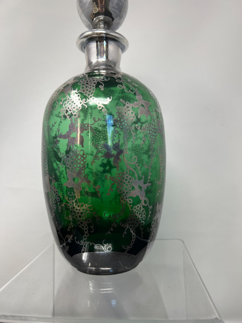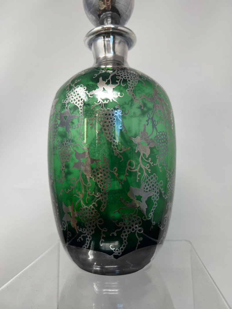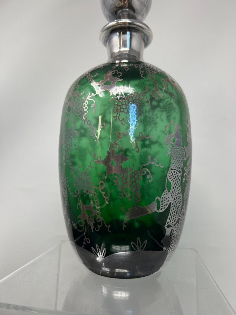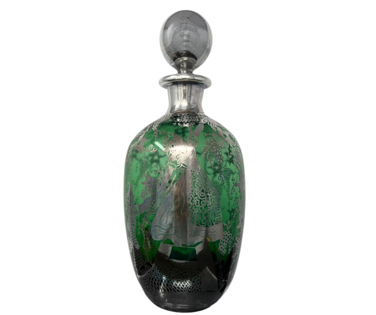 Crafted in the glassmaking region of Murano, Italy (renowned since the 13th century for its innovation in color and technique) this Venetian decanter exemplifies the fusion of artistry and tradition. The emerald green glass, hand-blown in the Murano tradition, is richly adorned with sterling silver overlay, a decorative method popularized in the late 19th and early 20th centuries to elevate fine glassware into objets d’art (works of art). This decanter echoes the Art Nouveau sensibilities that influenced European design. Pieces such as this were often commissioned for display in refined parlors or gifted to mark significant occasions, making them treasured symbols of taste and legacy. This decanter has a unique design with a young woman gracefully reaching upward and a younger child playfully at her side. There are grapes and vines in silver around the entire decanter. Whether collected for its aesthetic merit or its historical lineage, this decanter offers a quiet testament to the enduring beauty of Venetian craftsmanship.