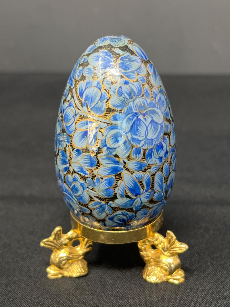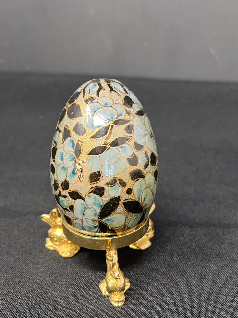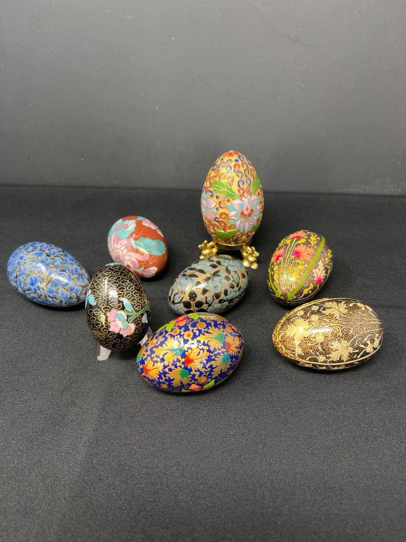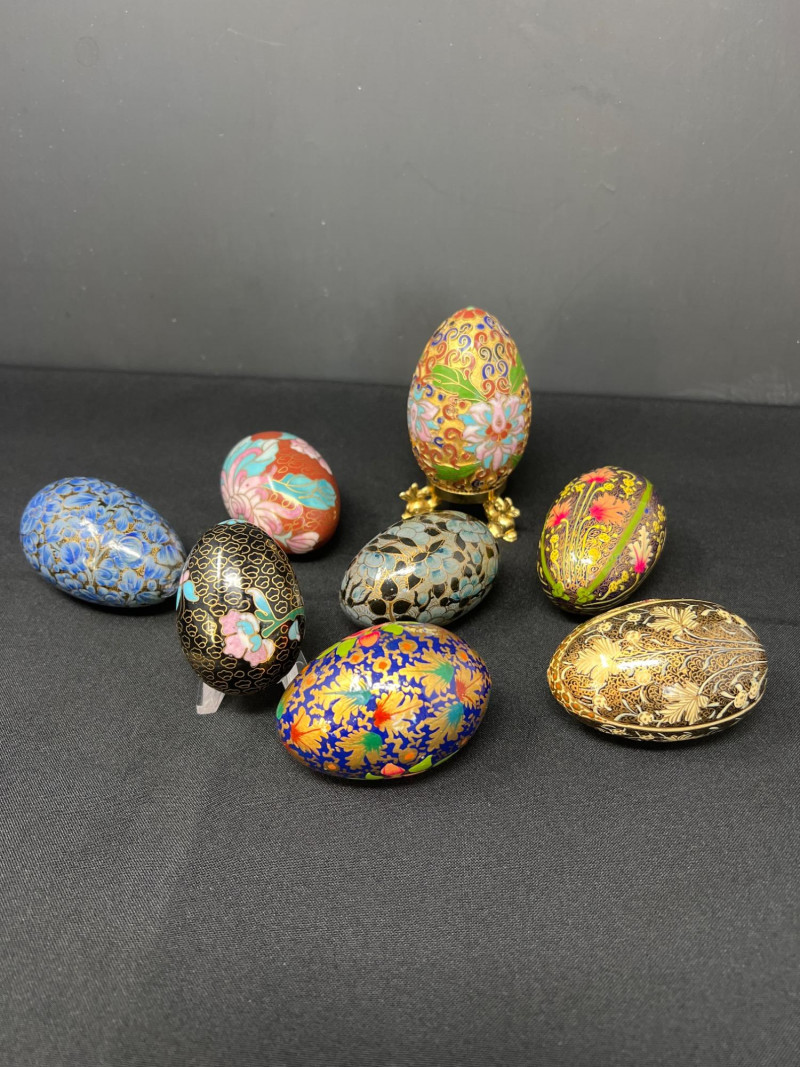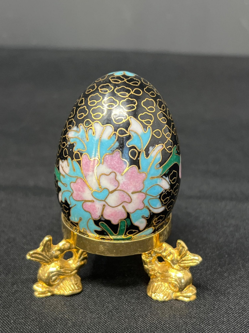A vibrant pairing of cultural artistry, this lot features a collection of handpainted Ukrainian eggs—known as pysanky—alongside a single cloisonné egg rendered in traditional Chinese enamelwork. Each Ukrainian egg is meticulously decorated with wax-resist techniques, echoing centuries-old folk traditions that celebrate rebirth, protection, and heritage. The cloisonné egg, with its intricate metalwork and jewel-toned enamel offers a striking contrast yet shares the same reverence for craftsmanship and symbolism. Together, these eggs form tokens of legacy, ritual, and the enduring beauty of handwork. Gold toned metal holder (made in Italy) is included.