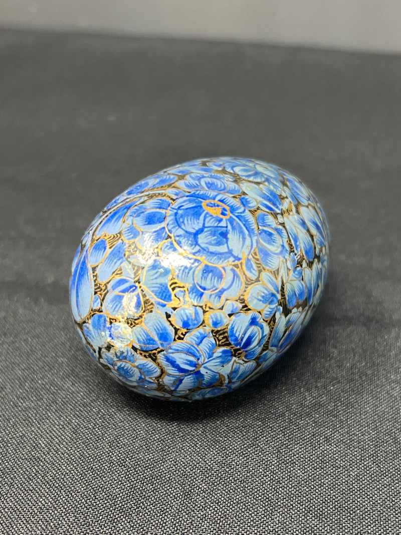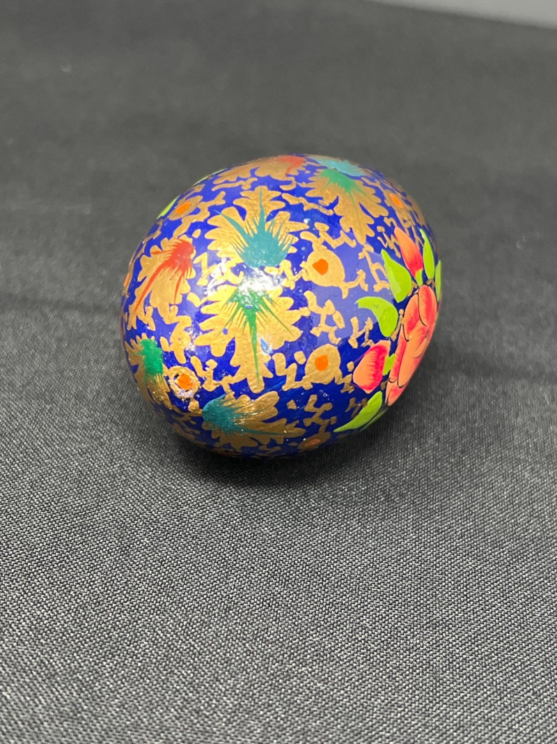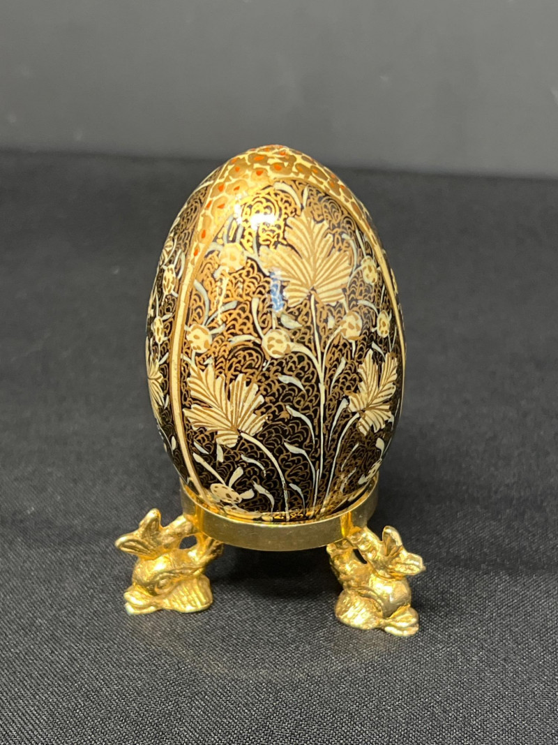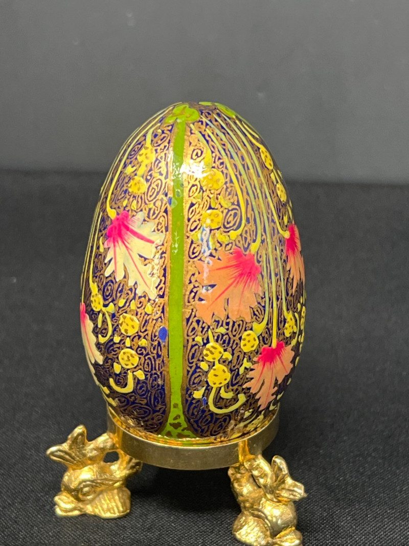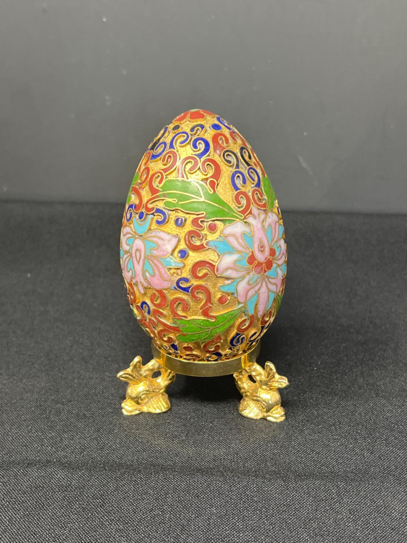 A vibrant pairing of cultural artistry, this lot features a collection of handpainted Ukrainian eggs—known as pysanky—alongside a single cloisonné egg rendered in traditional Chinese enamelwork. Each Ukrainian egg is meticulously decorated with wax-resist techniques, echoing centuries-old folk traditions that celebrate rebirth, protection, and heritage. The cloisonné egg, with its intricate metalwork and jewel-toned enamel offers a striking contrast yet shares the same reverence for craftsmanship and symbolism. Together, these eggs form tokens of legacy, ritual, and the enduring beauty of handwork. Gold toned metal holder (made in Italy) is included.