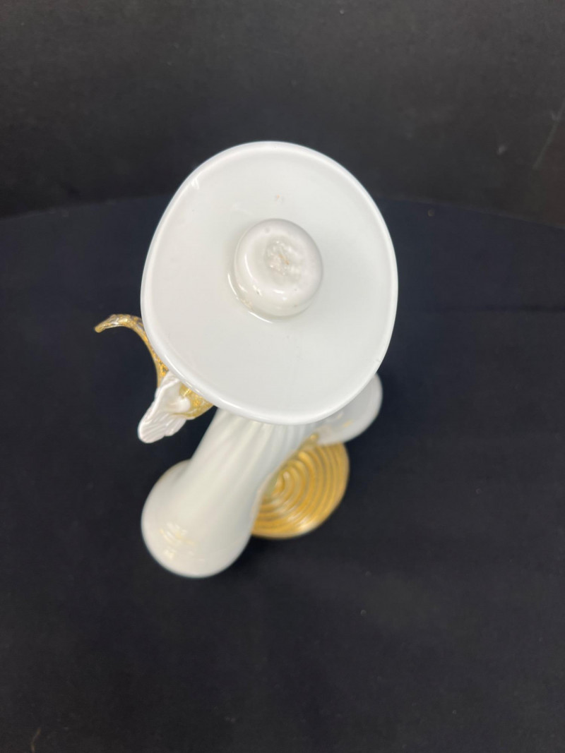 Handcrafted in Murano, Italy—a region synonymous with glassmaking excellence since the 13th century—this white Venetian glass figurine captures the charm and refinement of a Southern Belle. Her flowing gown, dusted with gold, reflects the delicate artistry and attention to detail that define Murano’s legacy. The figure’s poised stance and stylized silhouette suggest mid-century decorative trends, when such pieces were often gifted or displayed as symbols of grace and hospitality. Gold dusting, applied during the glassblowing process, adds a subtle shimmer that catches light and memory alike. A timeless accent for collectors of fine glass or those drawn to the quiet beauty of feminine form and European craftsmanship.