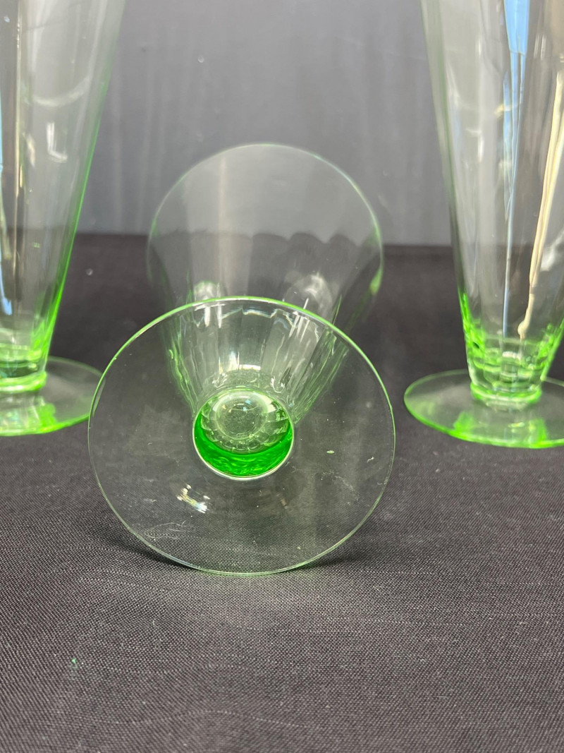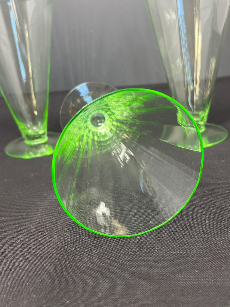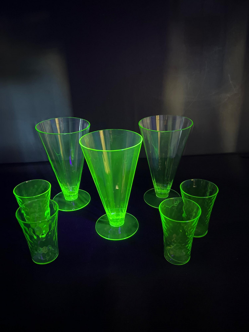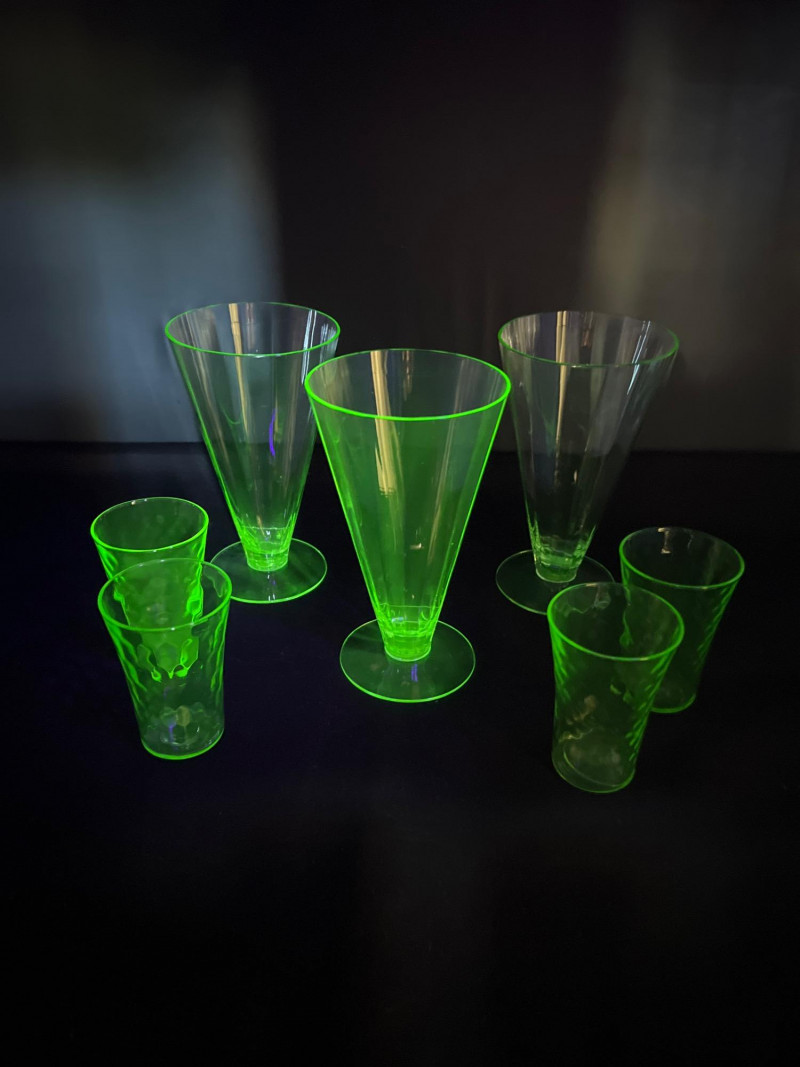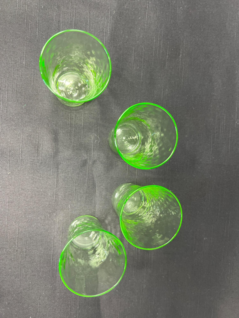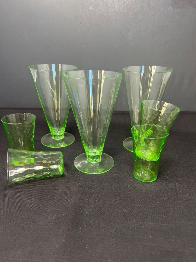 A luminous ensemble of green uranium glass, this set includes three footed paneled optic vaseline glass water tumblers and four vaseline dotted juice glasses, each glowing with the unmistakable radiance of uranium oxide—a hallmark of Depression-era glassmaking. The taller glasses, standing at 6" with flared bowls and pedestal bases, were likely designed for iced tea or water service, while the smaller ¾" tumblers may have served as cordials or breakfast juice. Produced between the 1930s and 1950s, uranium glass was prized not only for its vibrant green hue but for its ethereal glow under UV light—a feature that continues to captivate collectors and historians alike. These pieces reflect a time when even everyday objects were crafted with care, color, and quiet elegance. Whether displayed in a cabinet or illuminated under blacklight, this set offers a glimpse into the artistry and optimism of a bygone era.