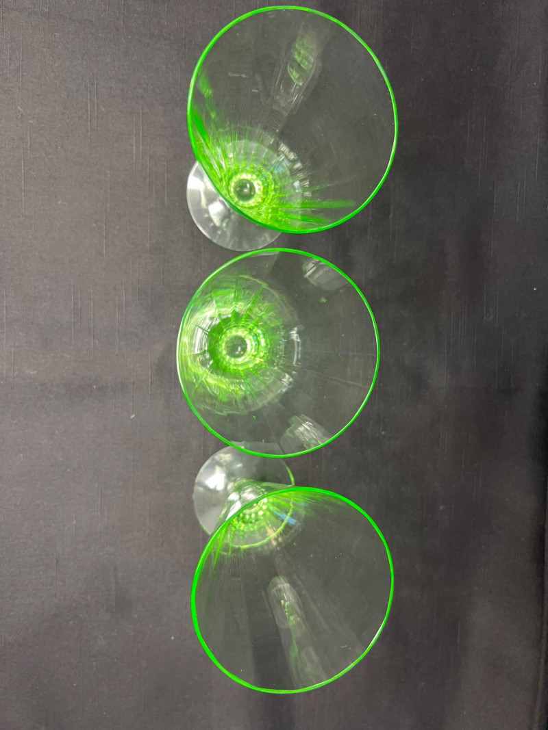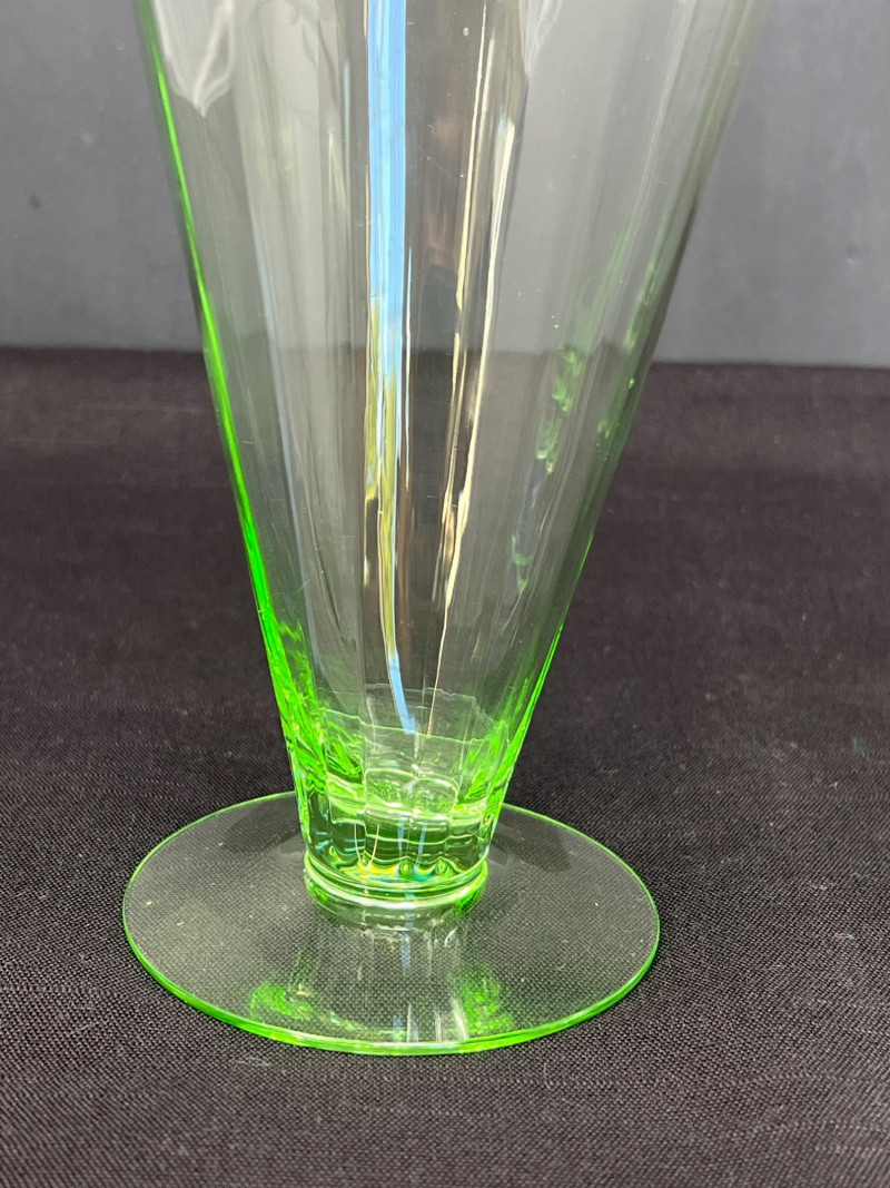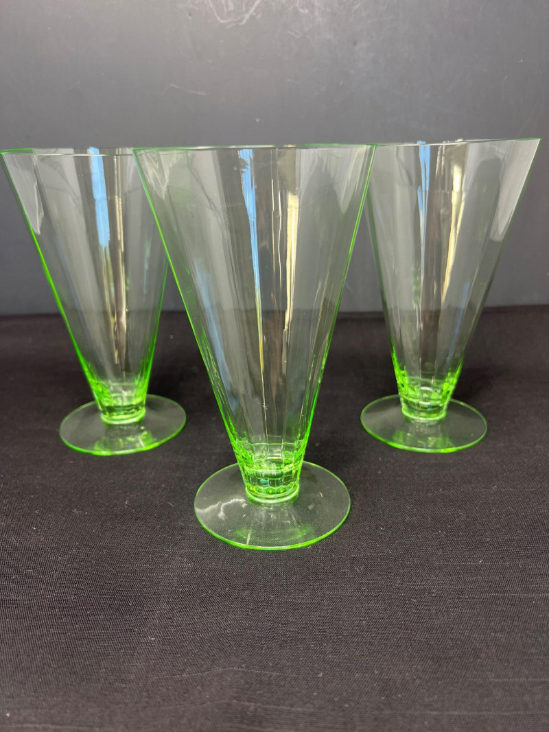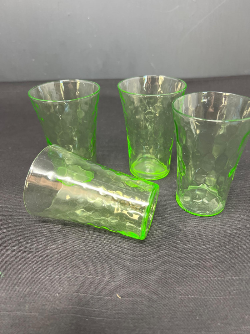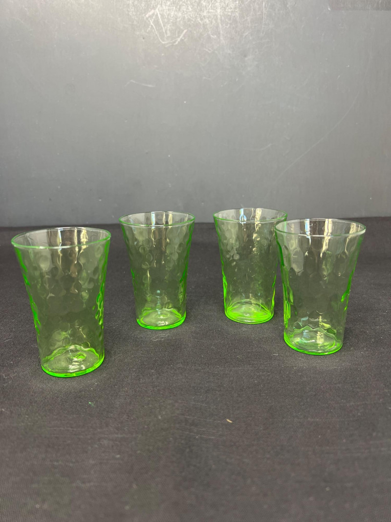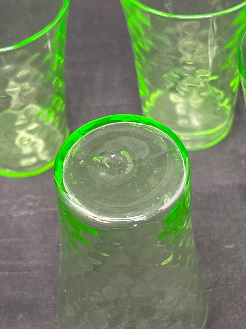 A luminous ensemble of green uranium glass, this set includes three footed paneled optic vaseline glass water tumblers and four vaseline dotted juice glasses, each glowing with the unmistakable radiance of uranium oxide—a hallmark of Depression-era glassmaking. The taller glasses, standing at 6" with flared bowls and pedestal bases, were likely designed for iced tea or water service, while the smaller ¾" tumblers may have served as cordials or breakfast juice. Produced between the 1930s and 1950s, uranium glass was prized not only for its vibrant green hue but for its ethereal glow under UV light—a feature that continues to captivate collectors and historians alike. These pieces reflect a time when even everyday objects were crafted with care, color, and quiet elegance. Whether displayed in a cabinet or illuminated under blacklight, this set offers a glimpse into the artistry and optimism of a bygone era.