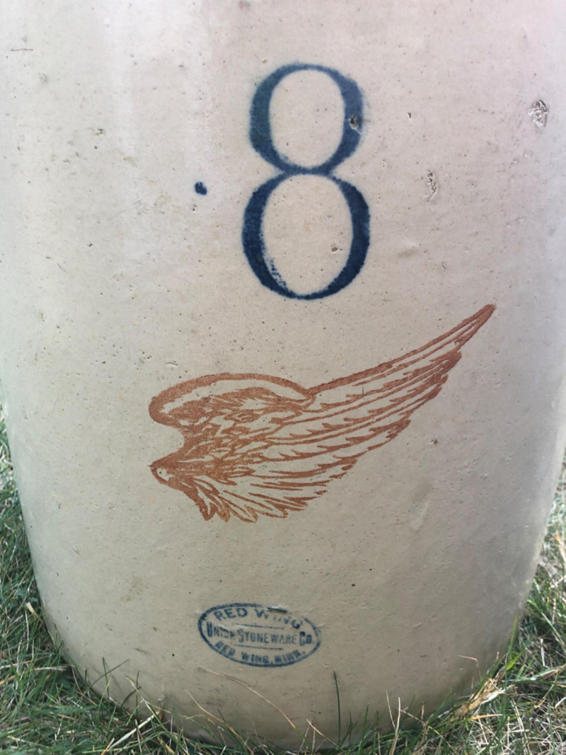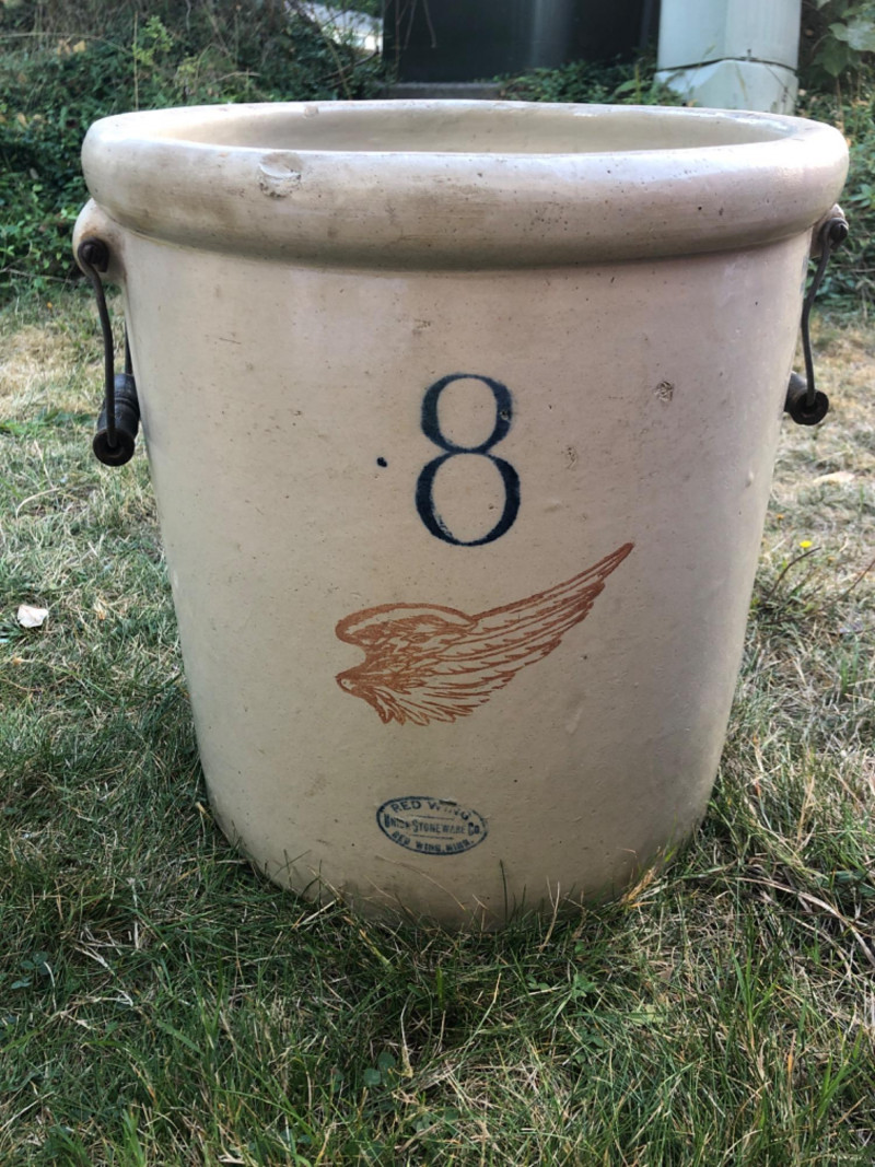 A classic 8-gallon Red Wing stoneware crock featuring sturdy side handles and the iconic red wing emblem. This early 20th-century utility piece was crafted for durability and everyday use—ideal for fermentation, storage, or rustic display. Though the lid is missing, the crock remains a striking example of American stoneware tradition, with surface wear consistent with age and use.