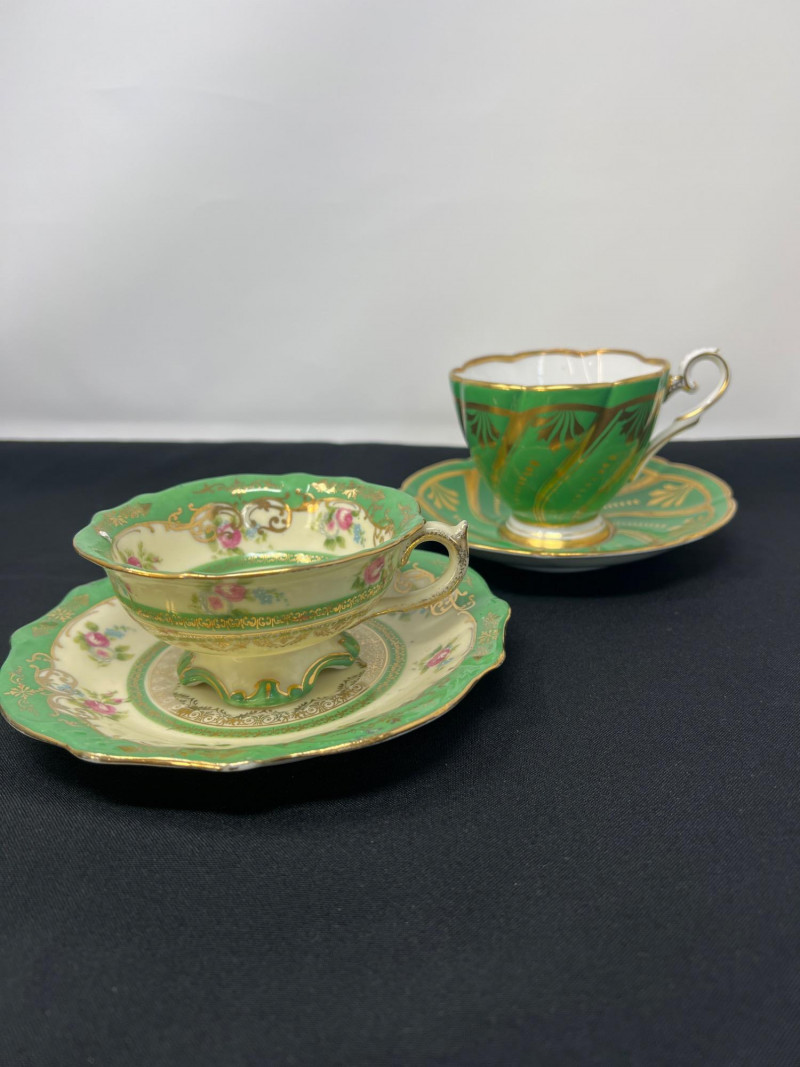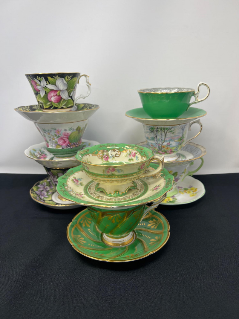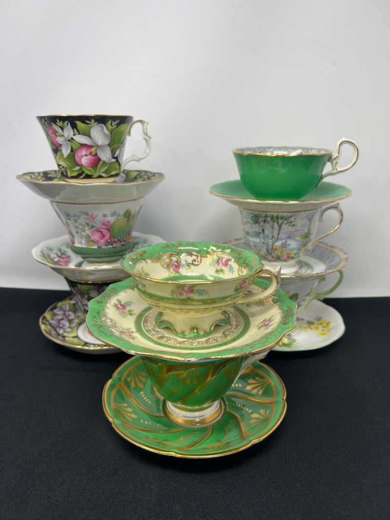 A charming ensemble of eight English porcelain tea cups, each crafted by renowned makers including Royal Albert, Ansley, and Royal Stafford. These bone china beauties showcase a variety of floral motifs, gilded rims, and graceful handles—each cup a miniature canvas of tradition and refinement. 8 assorted bone china tea cups Royal Albert, Ansley, Royal Stafford, Imperial Styles: Floral, gold-rimmed, scalloped edges English Bone China / Porcelain