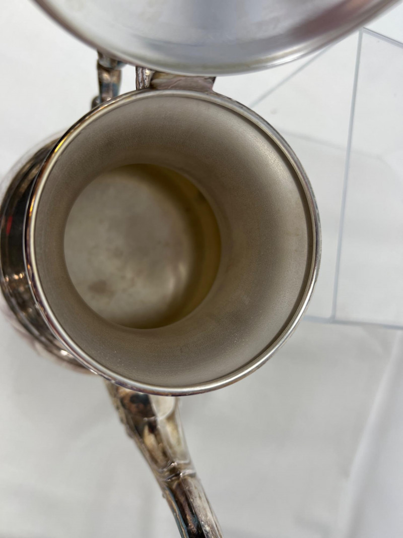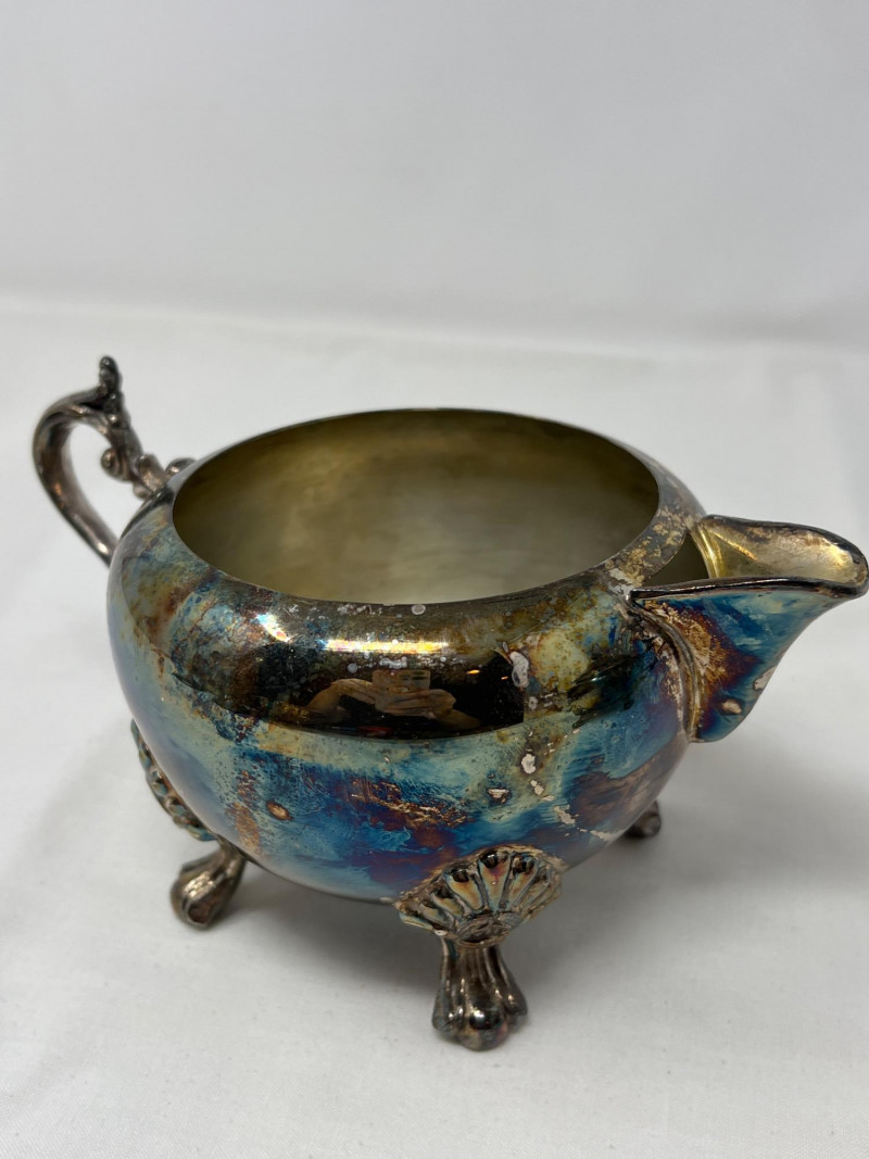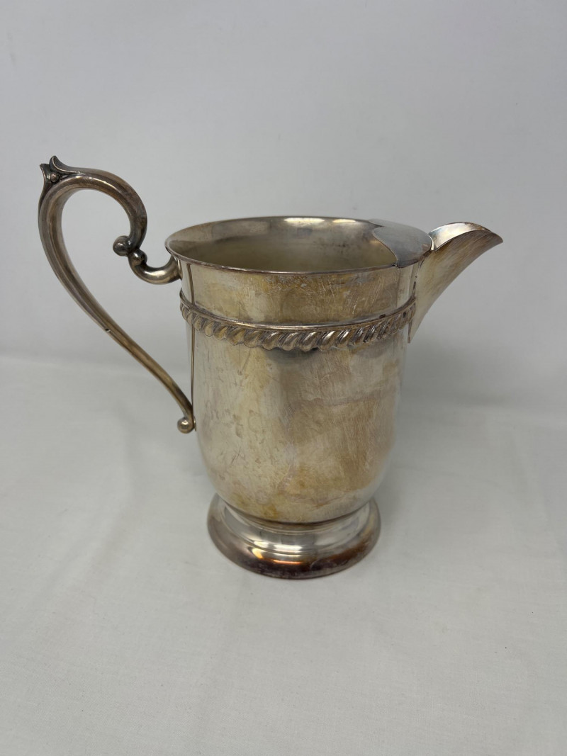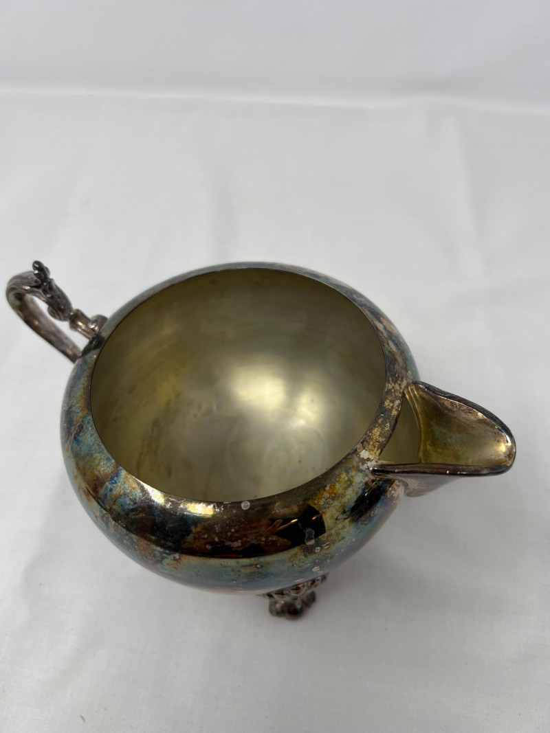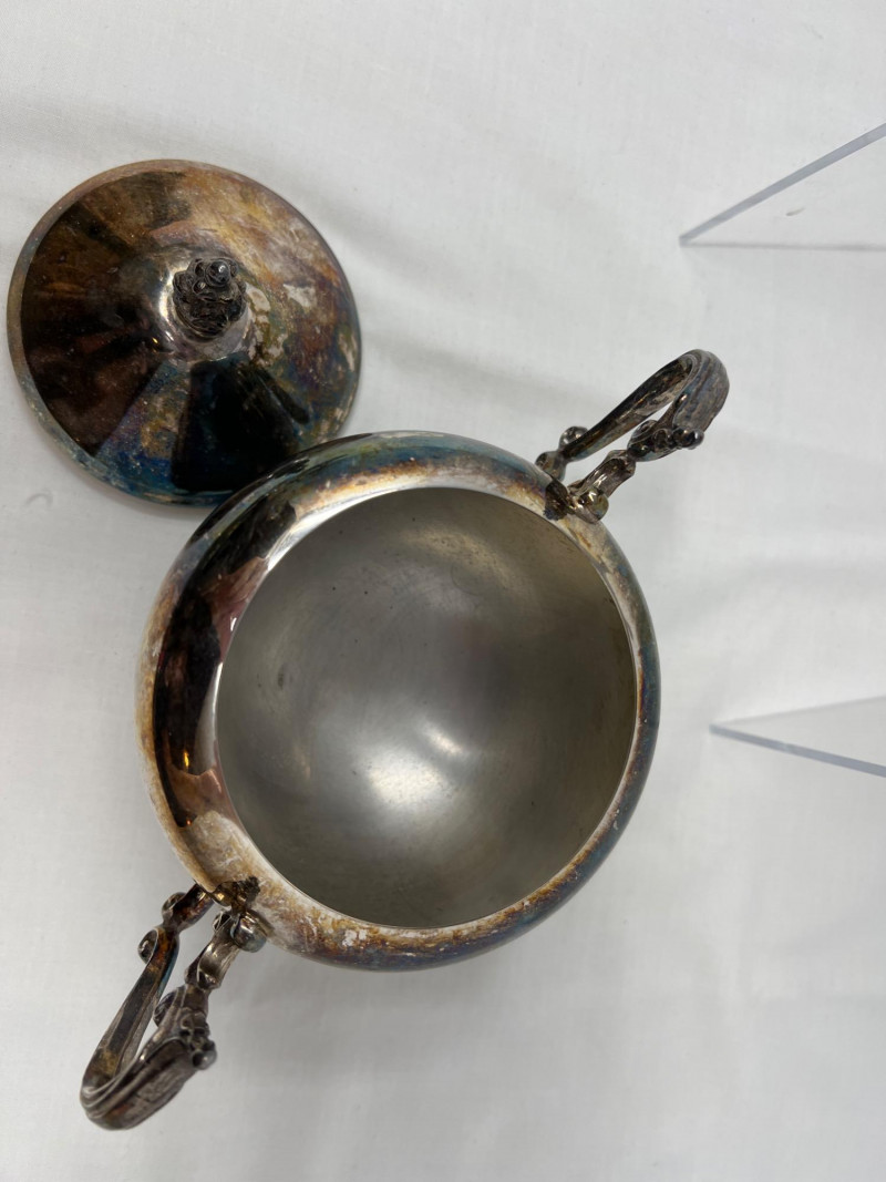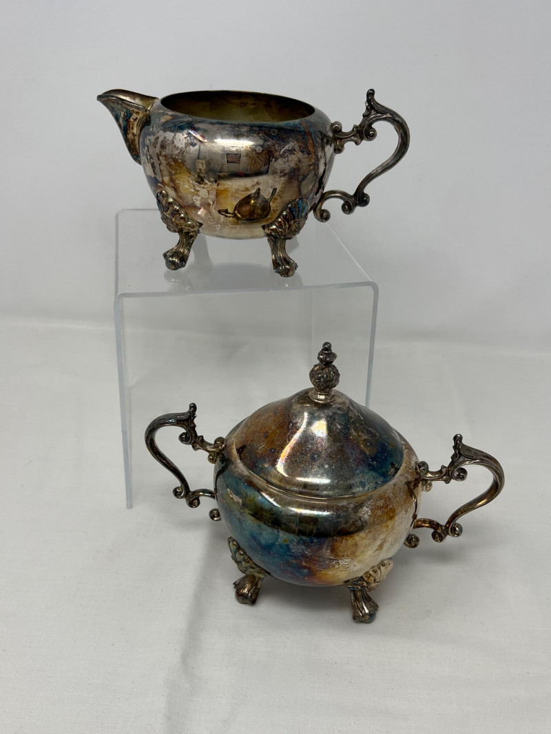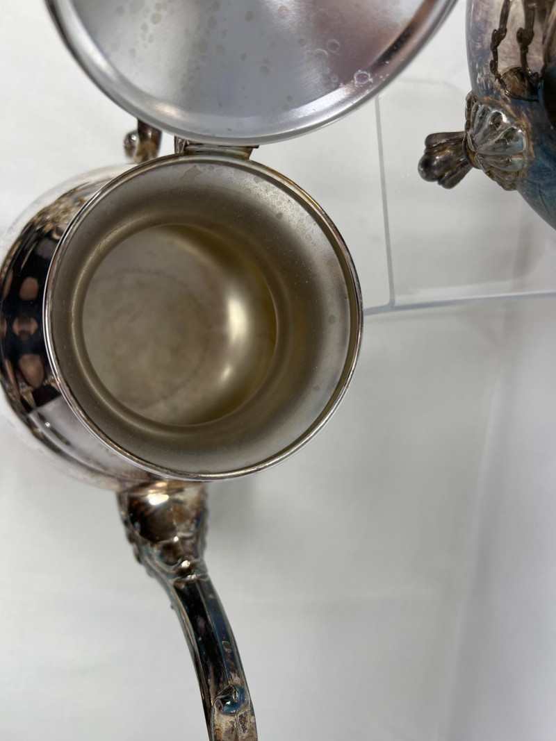 A graceful ensemble of silverplate serving pieces, this lot includes teapots, a pitcher, sugar bowl with lid, creamer, candlesticks, and small dishes—each with classic proportions and timeless charm. Whether displayed as part of a vintage collection or used for elegant entertaining, these pieces evoke the quiet rituals of hospitality and refinement. Pitcher: 8" H × 10" L × 5.5" W Teapots (2): 9.5" H × 11" L × 6" W Sugar with lid: 6.5" H × 5" W Creamer: 3.25" H × 5" W Candlesticks (2): 3" H Dishes (2): 5" diameter