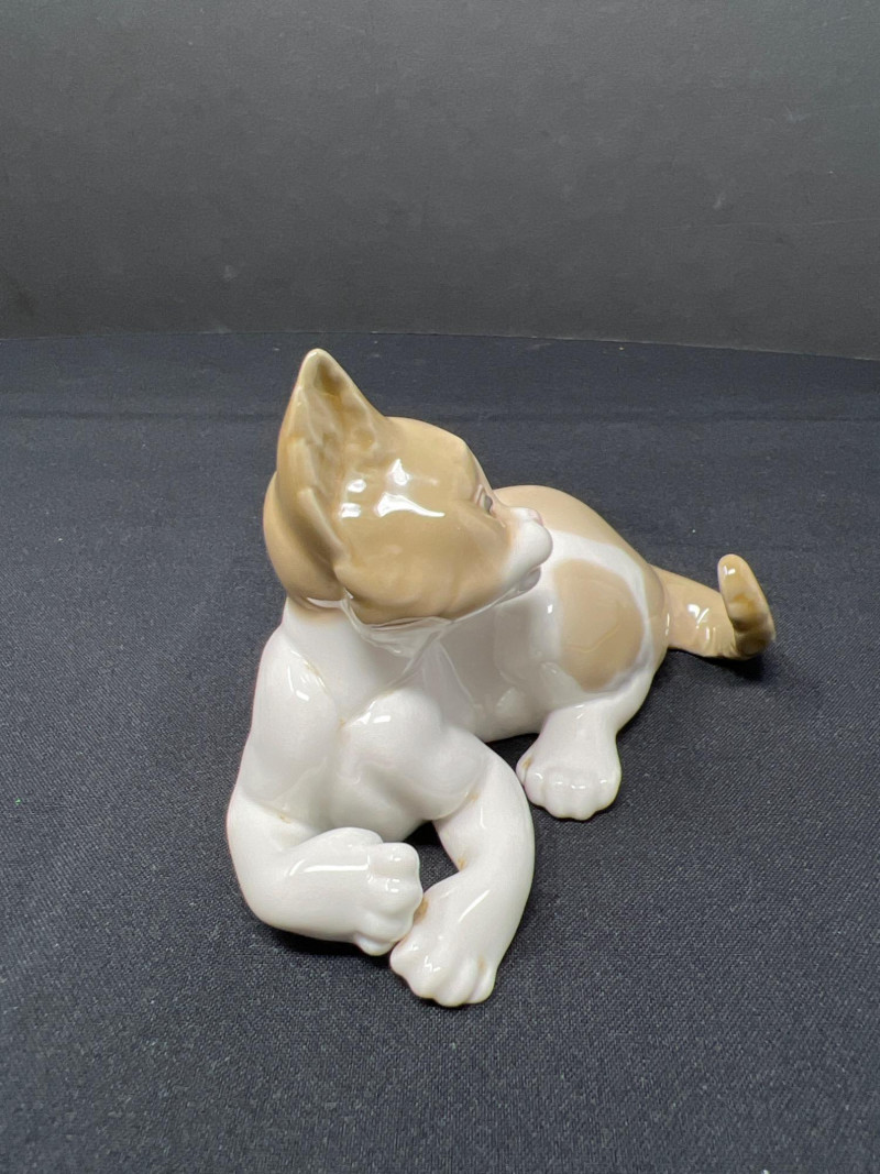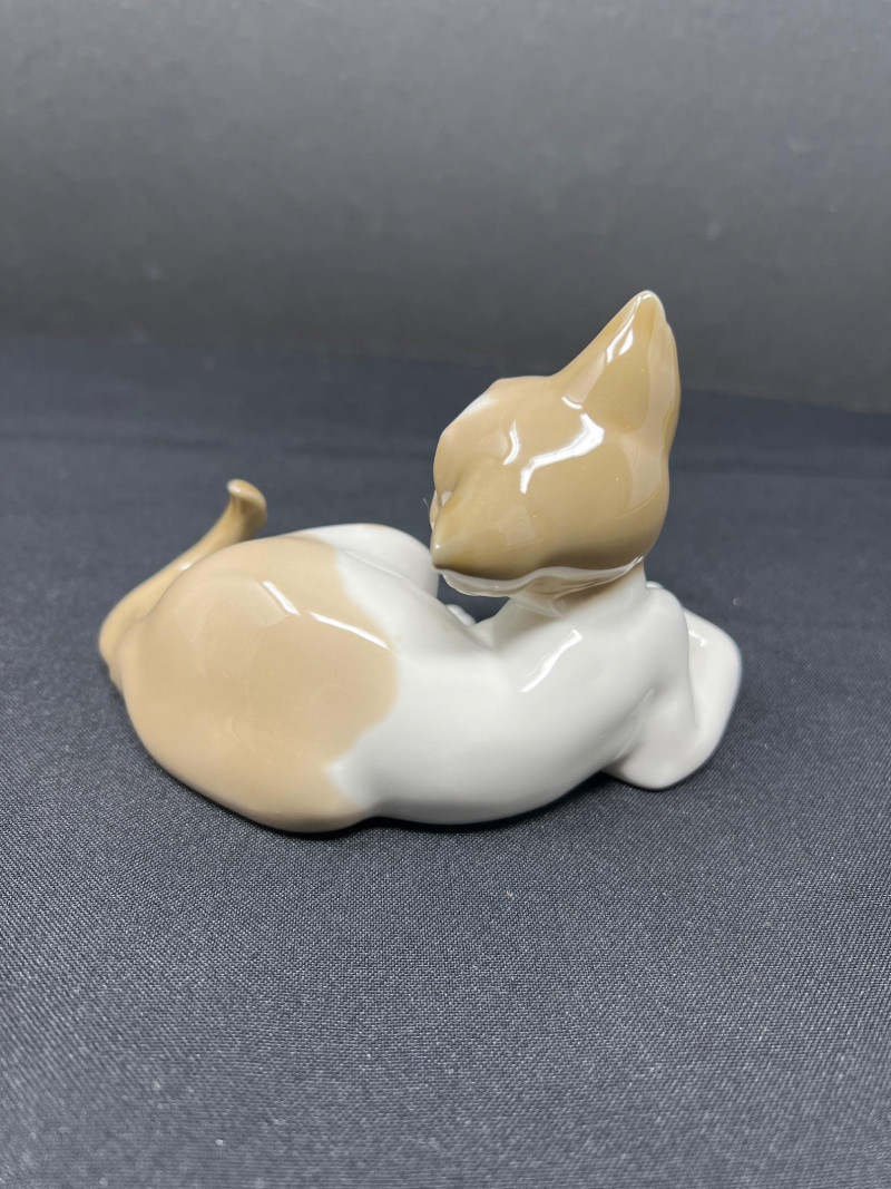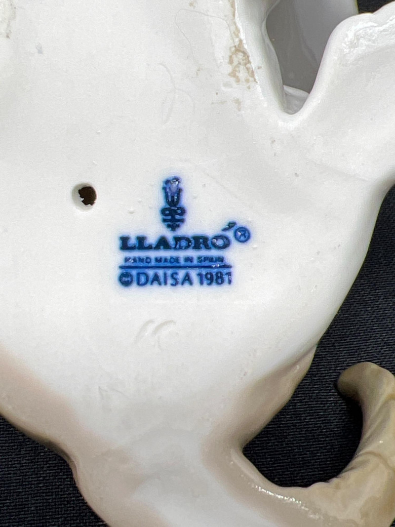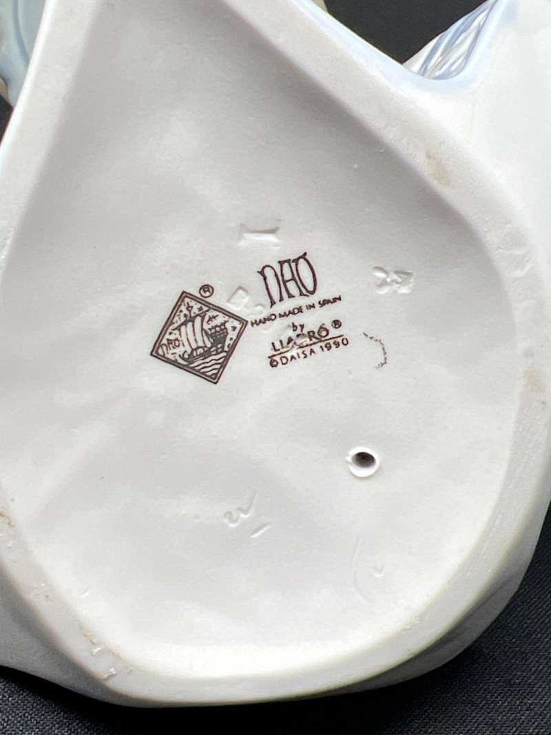 Both figures are marked “Made in Spain” and reflect Lladro’s signature blend of emotional storytelling and sculptural grace. Whether gifted or collected, they evoke the innocence and charm of everyday wonder. A tender pairing of handmade Spanish porcelain figurines from Lladro. These pieces capture quiet moments of joy and curiosity in soft pastel tones and expressive detail. The Birthday Girl stands with gentle poise, holding a cake in celebration—her dress flowing, her gaze serene. NAO Lladro. 7" height x 6" width. The Surprised Cat, with arched back and wide eyes, adds a playful counterpoint, as if startled by the festivities. Lladro Daisa 1987 stamp. 3" height x 5" length.
