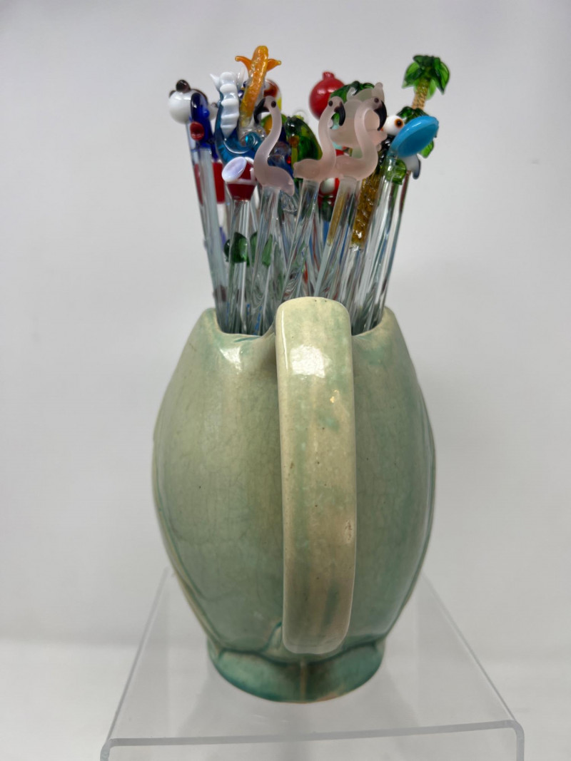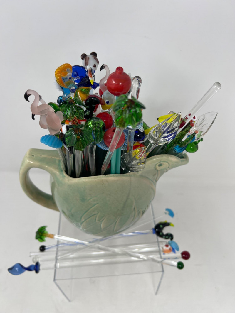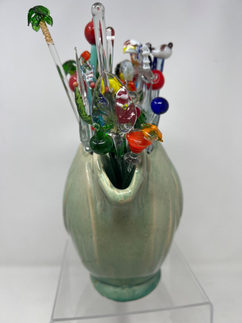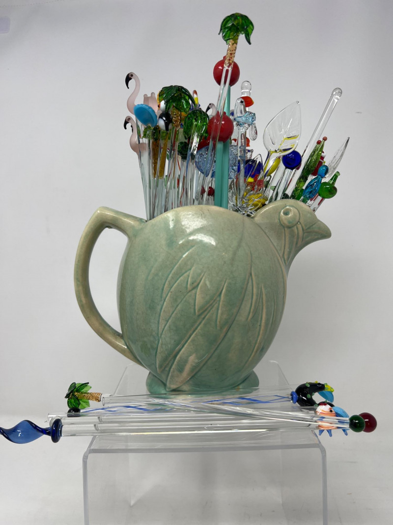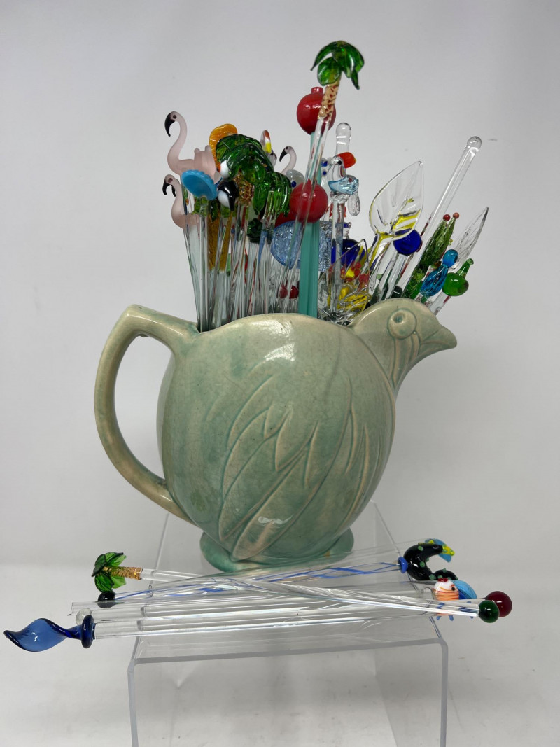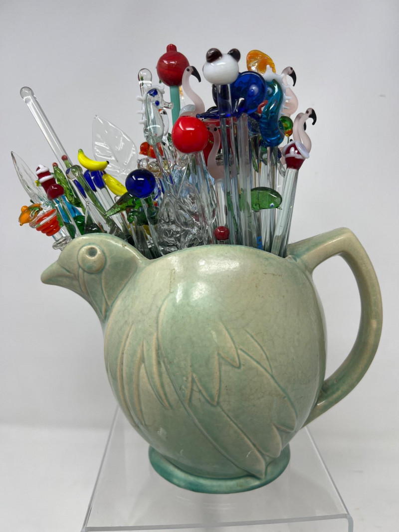 Why did the chicken cross the kitchen? To serve up swizzles in style. This vintage McCoy pottery pitcher, shaped like a cheerful hen, brings a dash of farmhouse charm and a splash of mid-century kitsch. Glazed in warm tones and filled with a colorful assortment of swizzle sticks. Whether perched on a bar cart or nestled in a country kitchen, this clucky character is ready to party.