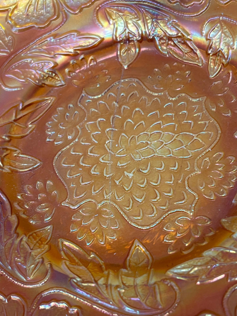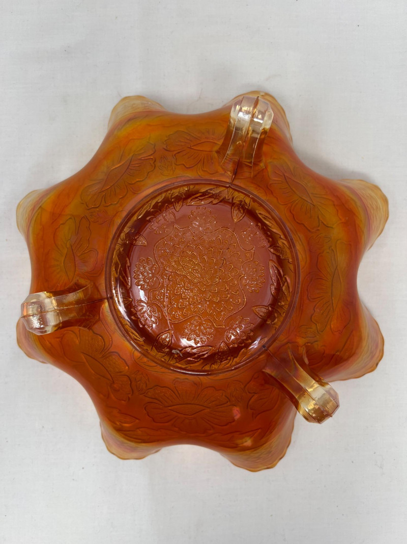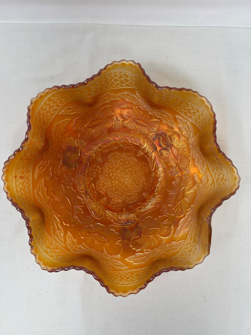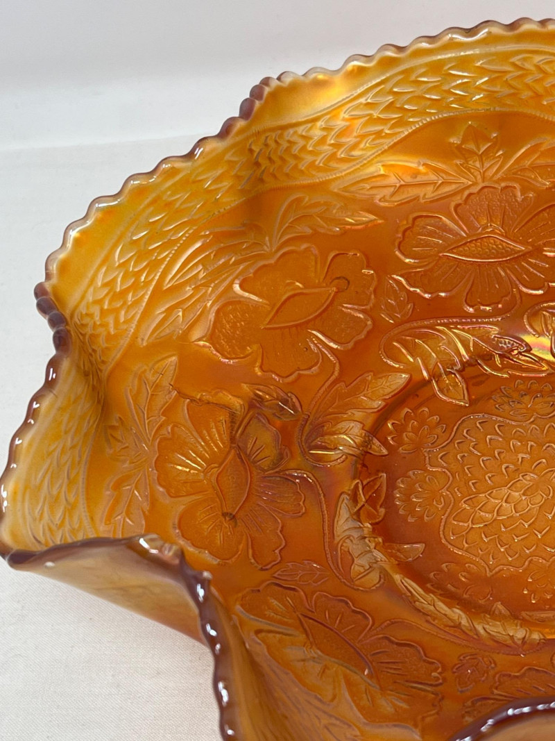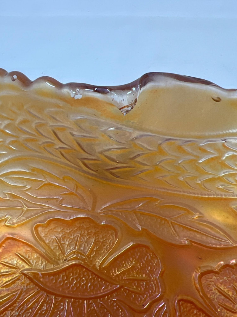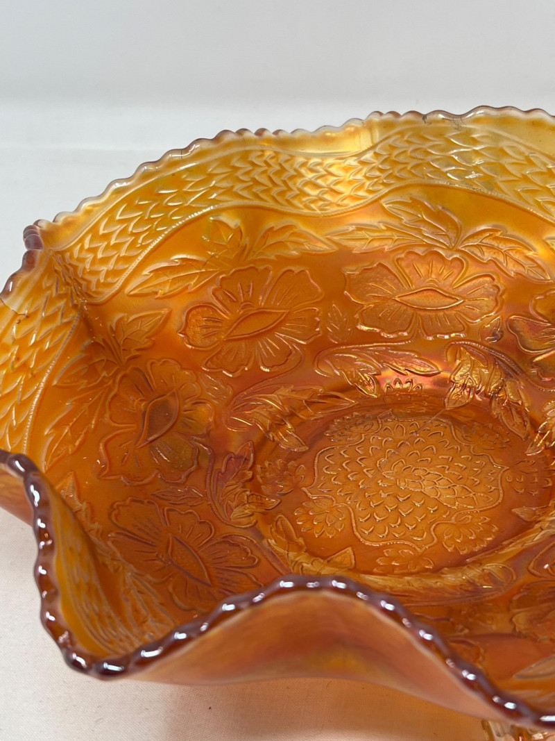 A striking example of early 1900's glass artistry, this antique Fenton marigold carnival glass bowl features the sought-after Two Flowers pattern—an elegant pairing of stylized dogwood and marsh lily blossoms. Produced circa 1915, the bowl showcases Fenton’s signature iridescence, with warm golds and subtle pinks dancing across its pressed surface. The scalloped rim and spatula feet add architectural charm, while the floral motif evokes the romanticism of the era. A collector’s gem valued at $70-90. Potential crease in glass inside center and run-off of glass son scalloped edge (see photos).