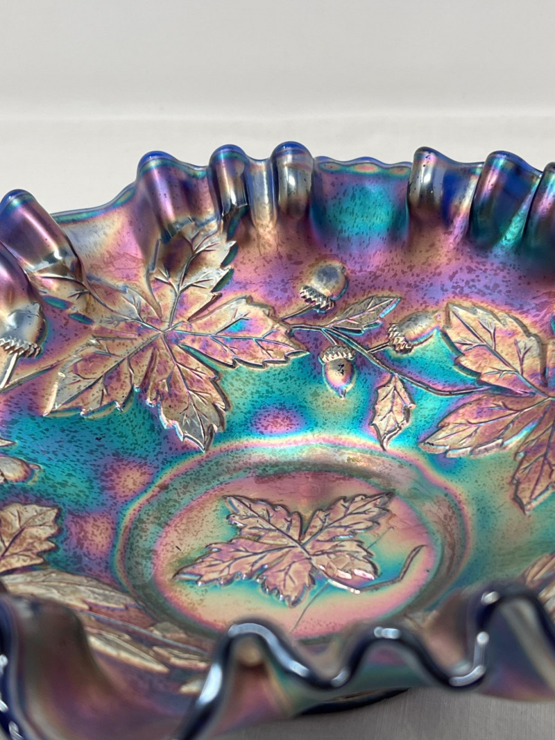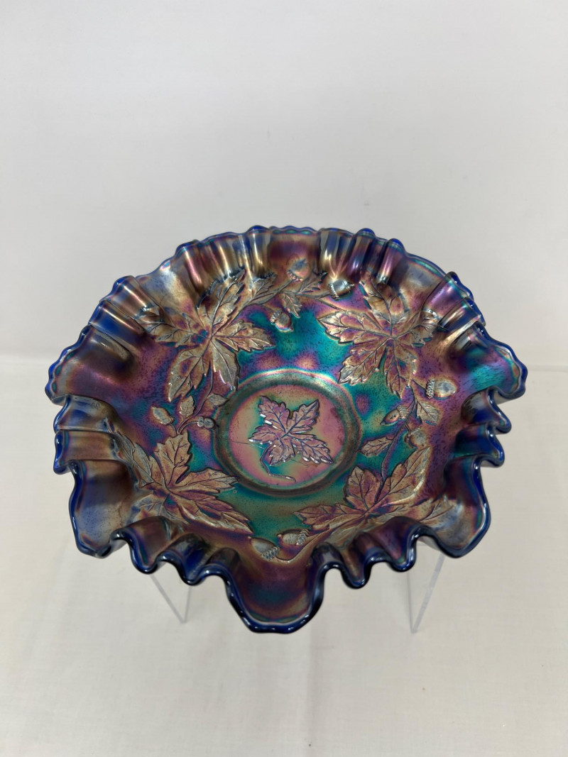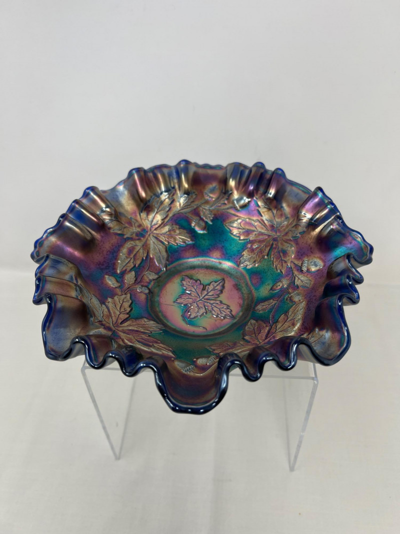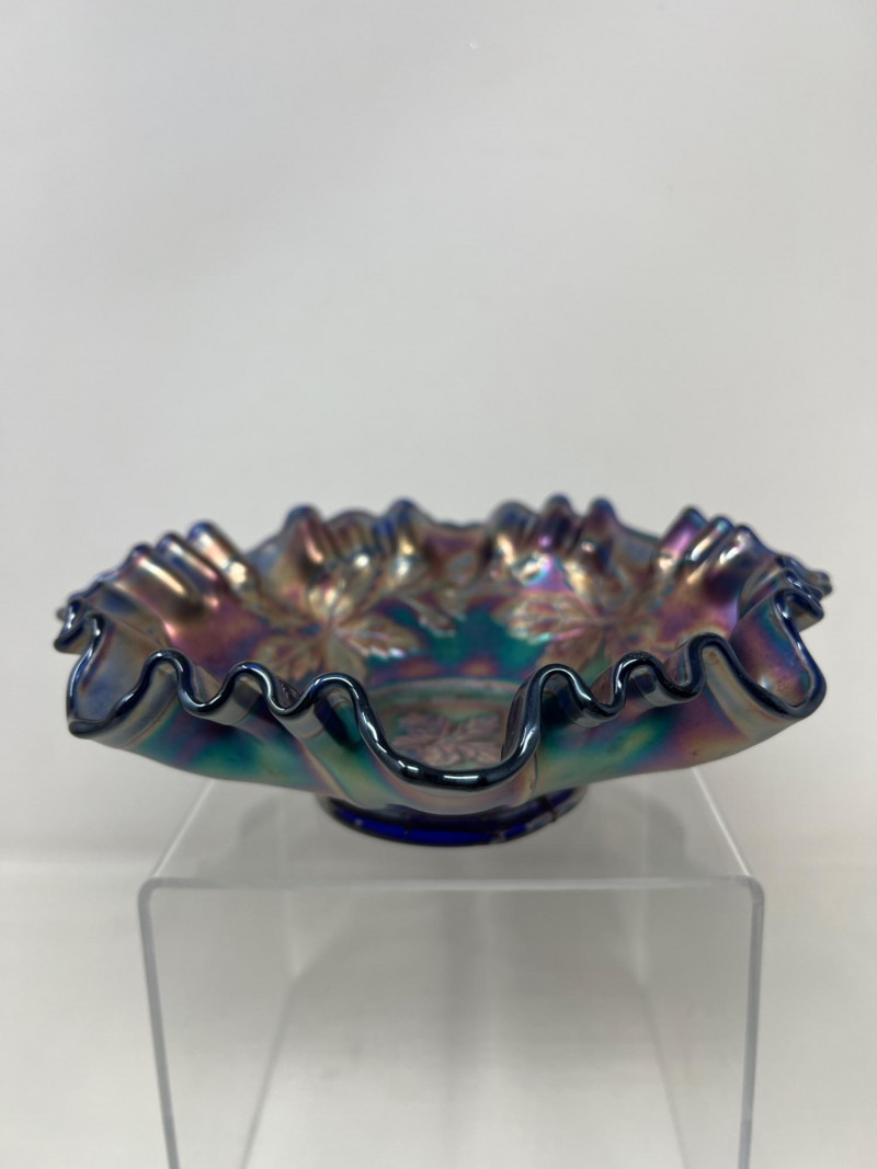 A striking example of early Fenton carnival glass, this ruffled bowl features the classic Holly pattern, introduced in 1911. Molded in rich electric blue with vivid purple and gold iridescence, the surface shimmers with sprays of holly leaves and berries radiating from the center. The ruffled edge adds movement and elegance, making this piece a standout in any vintage glass collection.