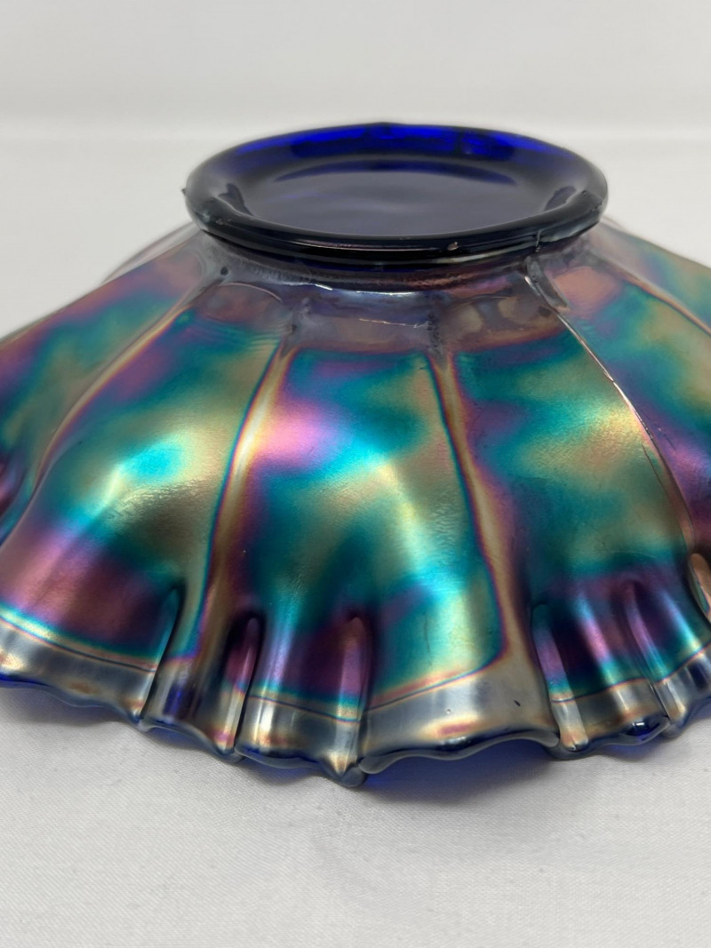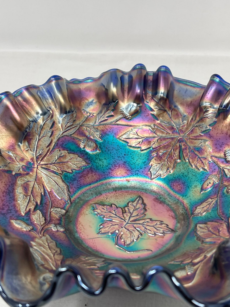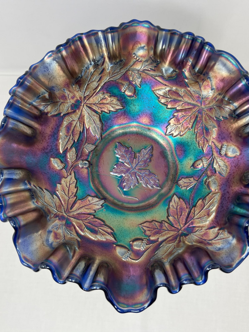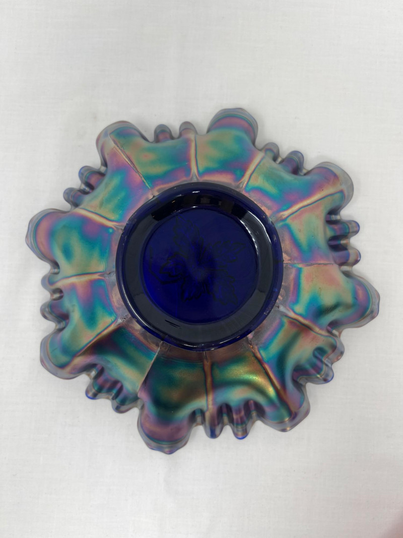 A striking example of early Fenton carnival glass, this ruffled bowl features the classic Holly pattern, introduced in 1911. Molded in rich electric blue with vivid purple and gold iridescence, the surface shimmers with sprays of holly leaves and berries radiating from the center. The ruffled edge adds movement and elegance, making this piece a standout in any vintage glass collection.