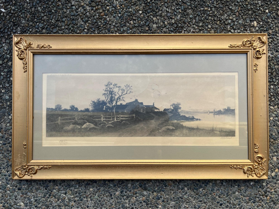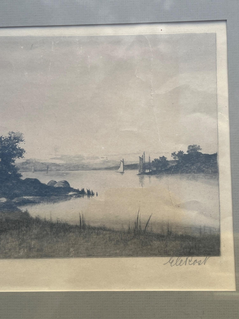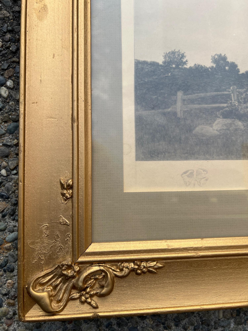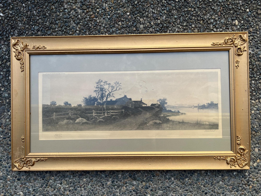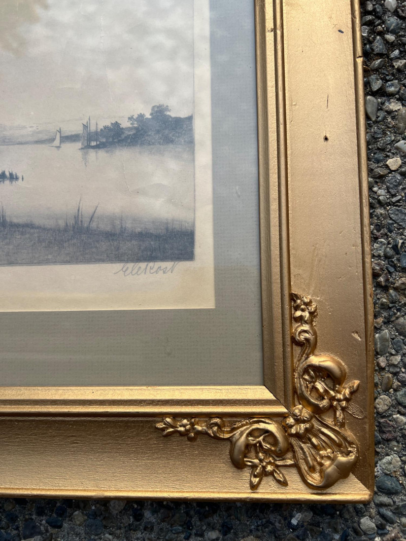 An antique framed landscape etching depicting a serene, silhouetted natural scene under an atmospheric sky, mounted in a period gilded wood carved frame. Ernest Christian Rost was a prominent American artist and etcher who gained recognition in the late 19th and early 20th centuries. His works are admired for their delicate execution and atmospheric quality, often focusing on subtle light effects in landscapes. Note there are a few water spots in sky above house (please review supporting photos).