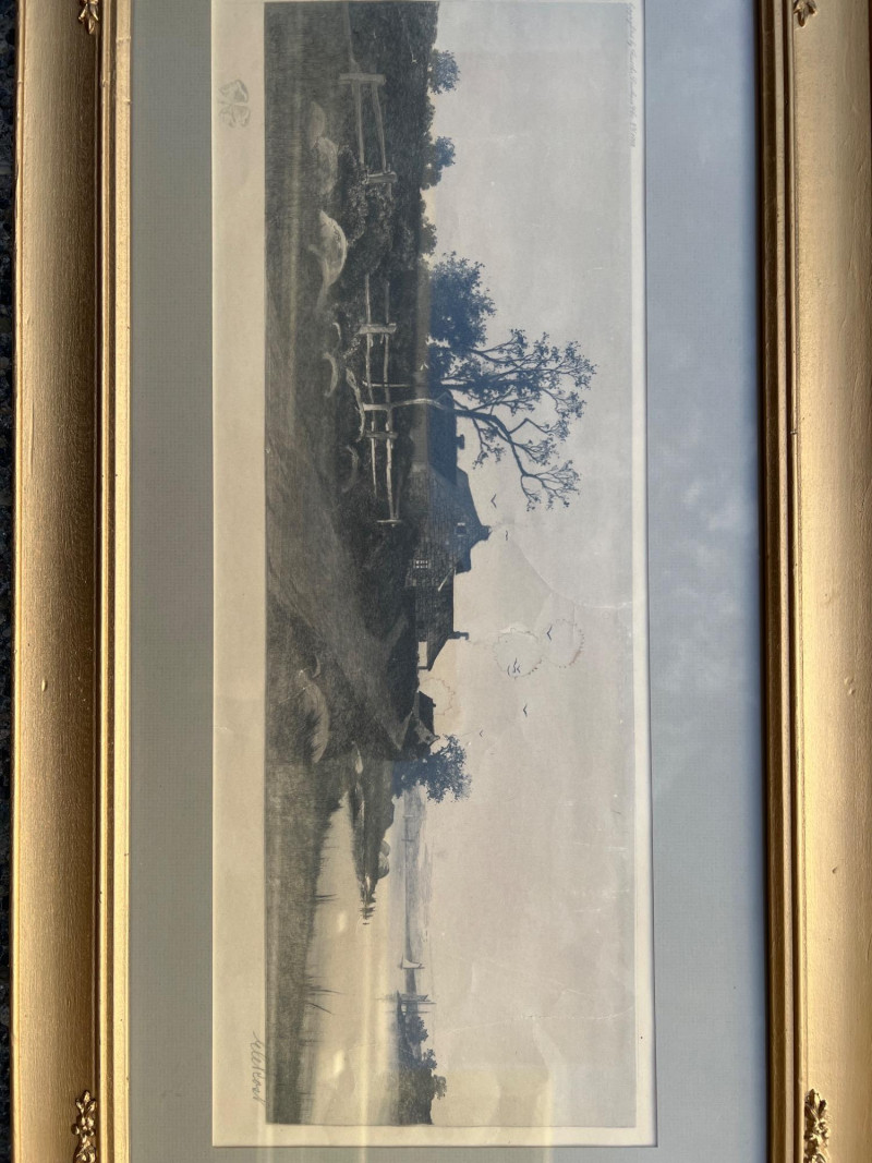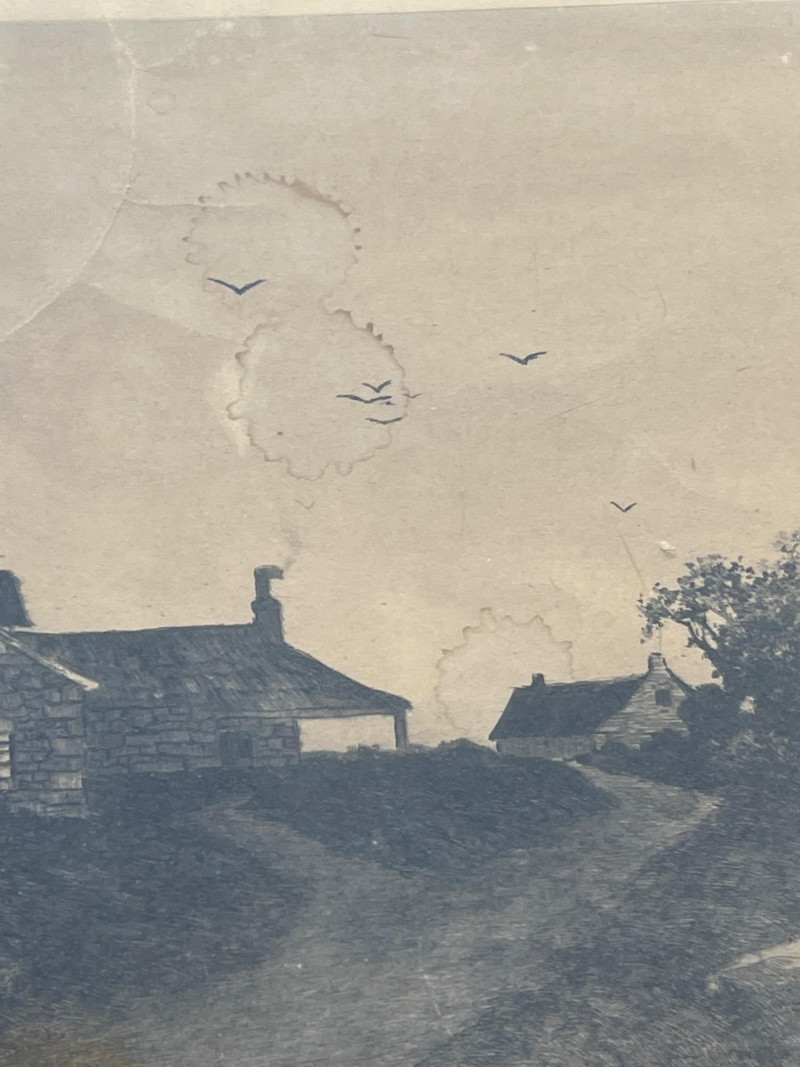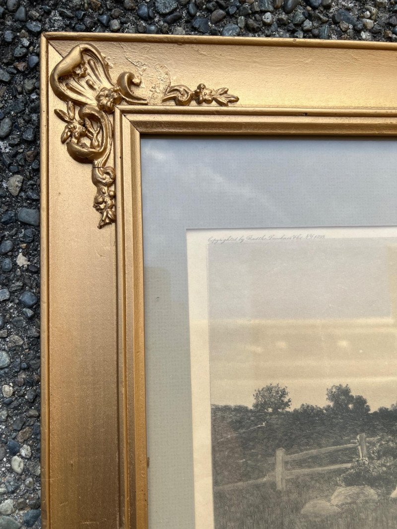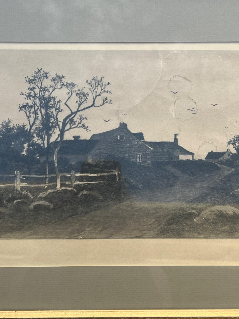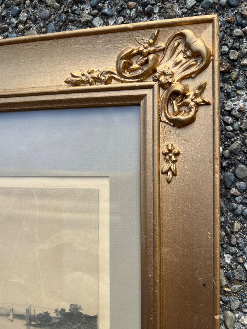 An antique framed landscape etching depicting a serene, silhouetted natural scene under an atmospheric sky, mounted in a period gilded wood carved frame. Ernest Christian Rost was a prominent American artist and etcher who gained recognition in the late 19th and early 20th centuries. His works are admired for their delicate execution and atmospheric quality, often focusing on subtle light effects in landscapes. Note there are a few water spots in sky above house (please review supporting photos).