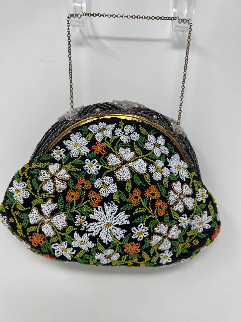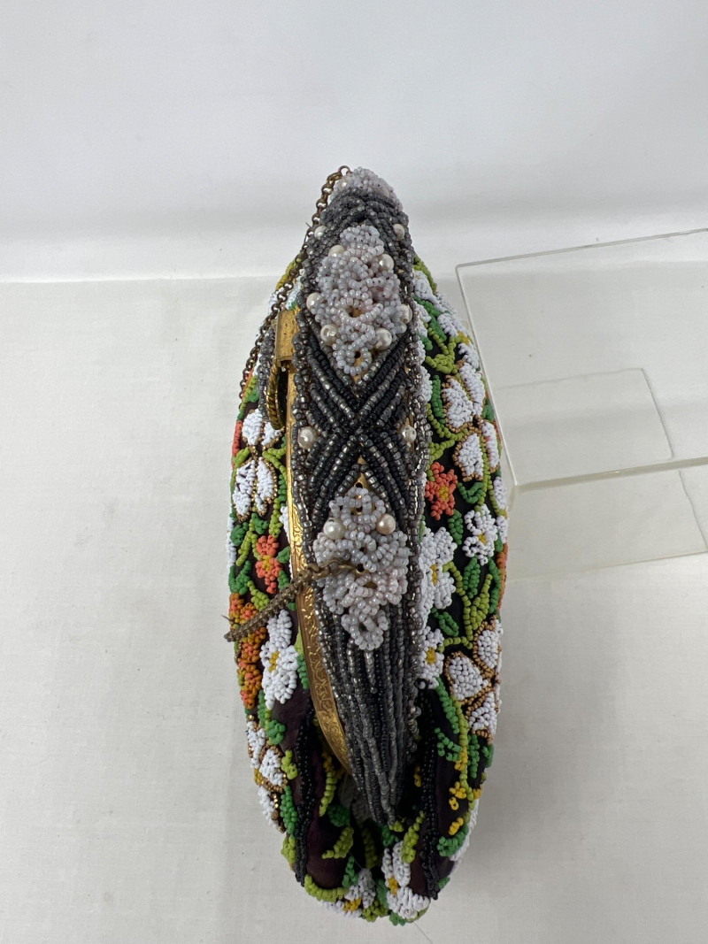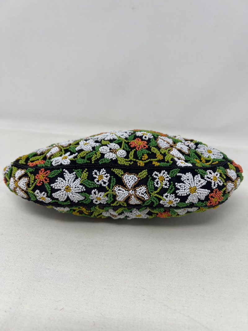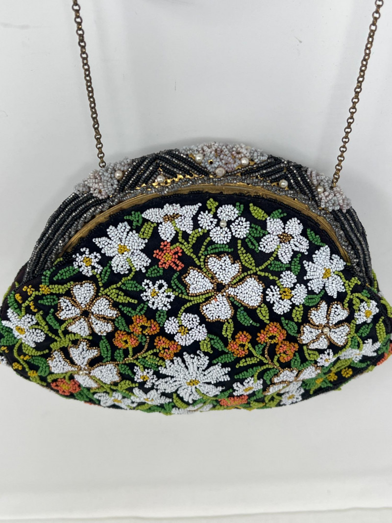 This vintage Art Deco domed evening clutch features intricate multi-colored seed bead floral embroidery on a black fabric background. Crafted in Paris, France by Altman et Fils, the bag reflects the refined glamour of early 20th-century French design. Its silk interior lining adds a touch of luxury, while the compact silhouette makes it ideal for display or occasional wear. A rare find for collectors of vintage fashion and European craftsmanship, this piece evokes the elegance of a bygone era.