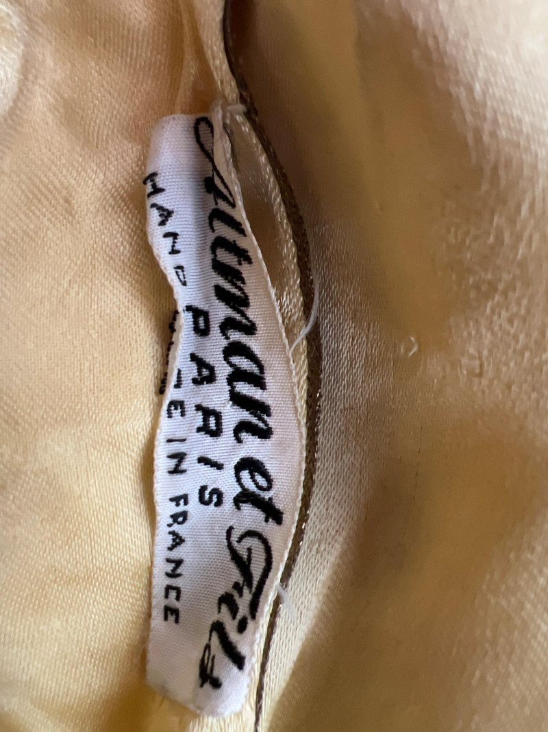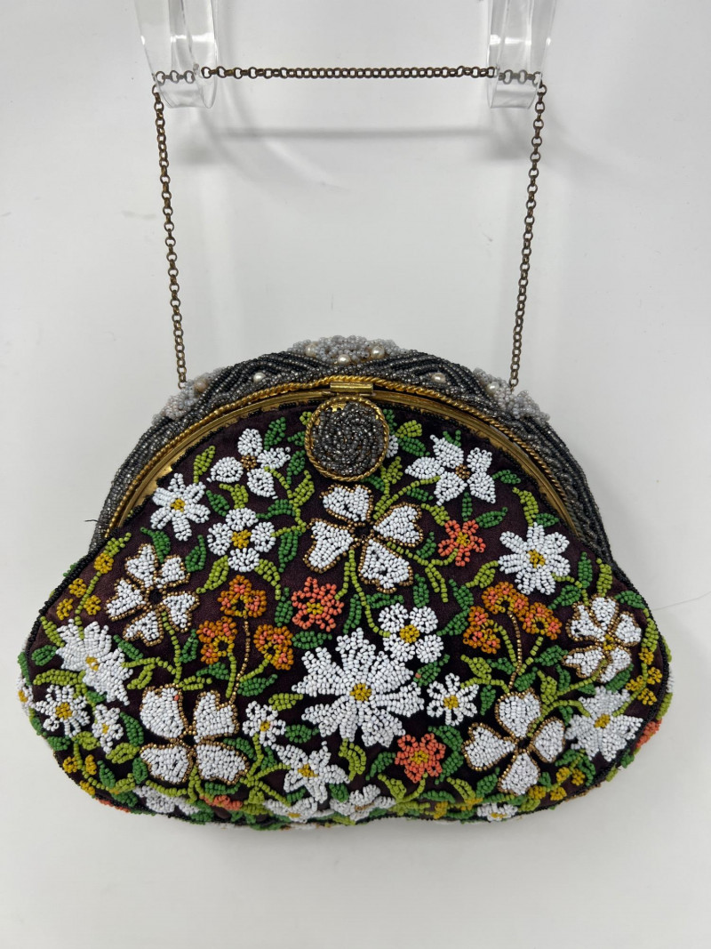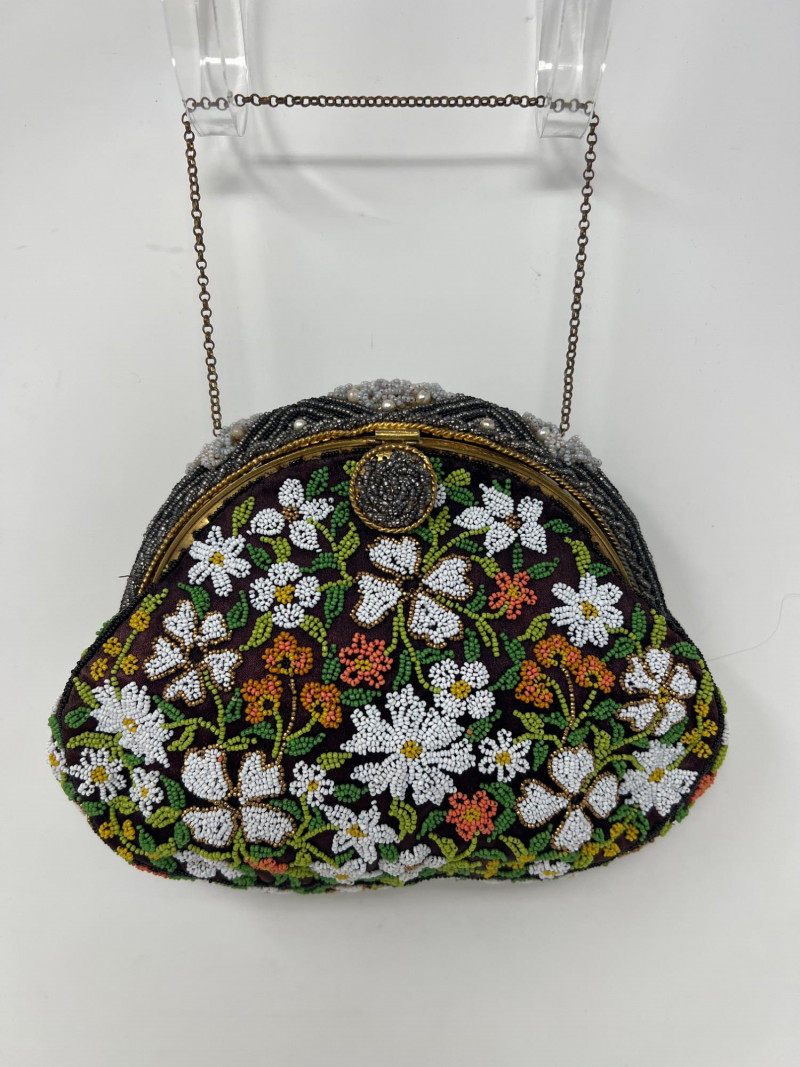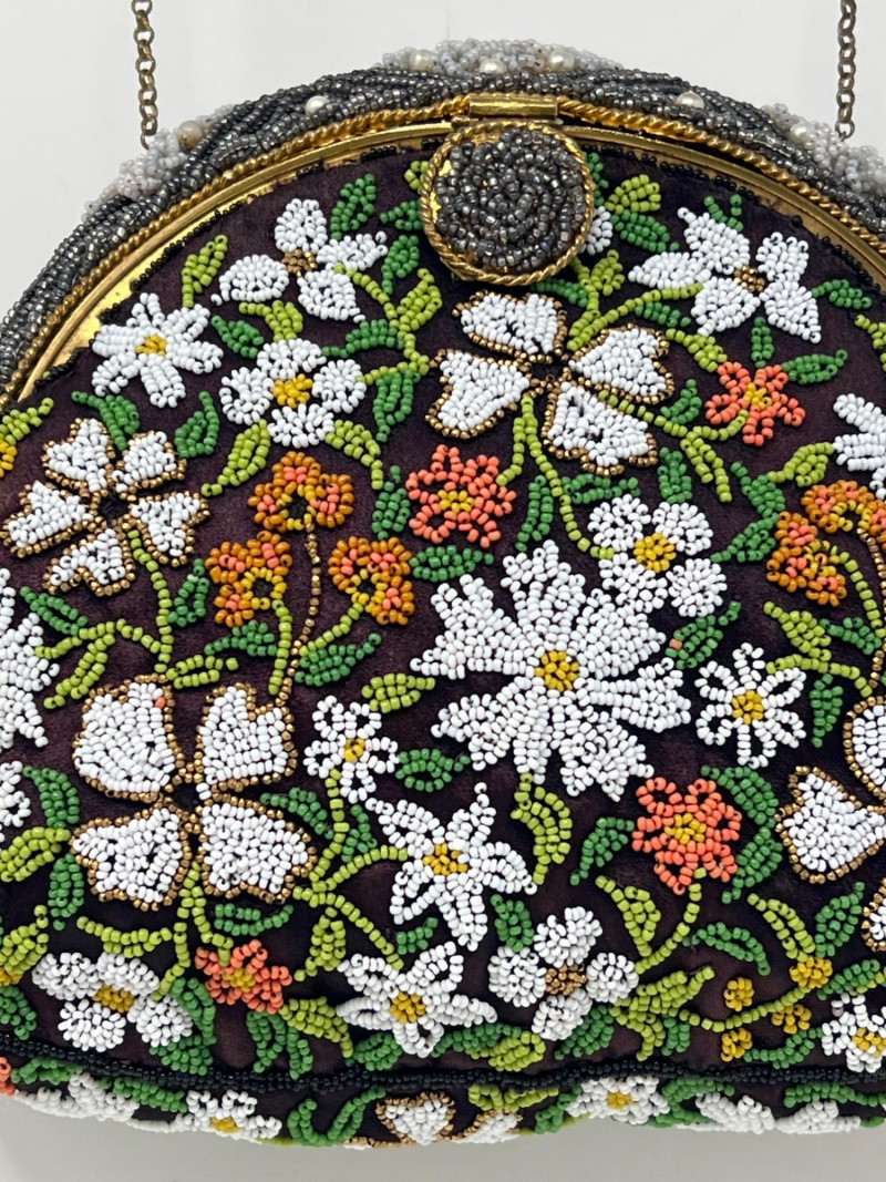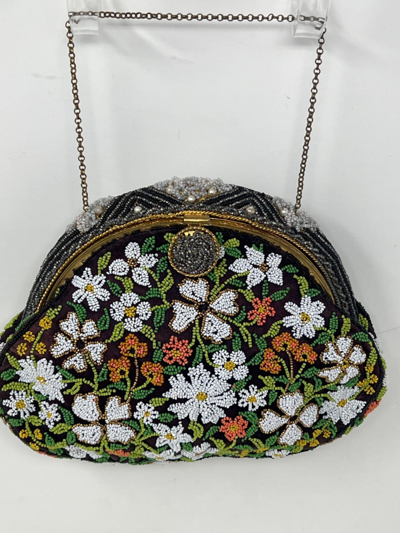 This vintage Art Deco domed evening clutch features intricate multi-colored seed bead floral embroidery on a black fabric background. Crafted in Paris, France by Altman et Fils, the bag reflects the refined glamour of early 20th-century French design. Its silk interior lining adds a touch of luxury, while the compact silhouette makes it ideal for display or occasional wear. A rare find for collectors of vintage fashion and European craftsmanship, this piece evokes the elegance of a bygone era.