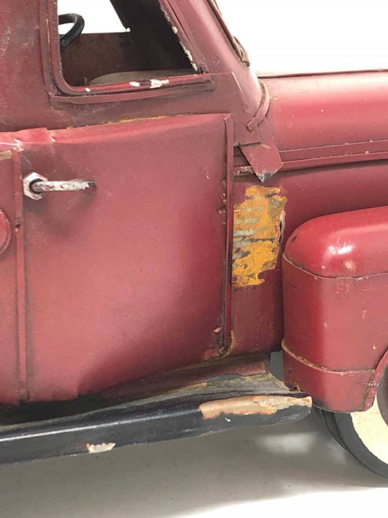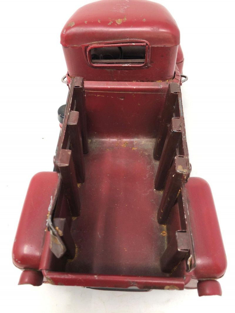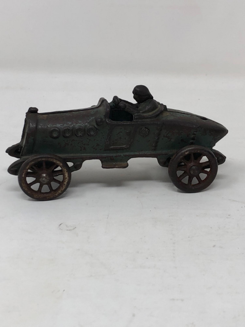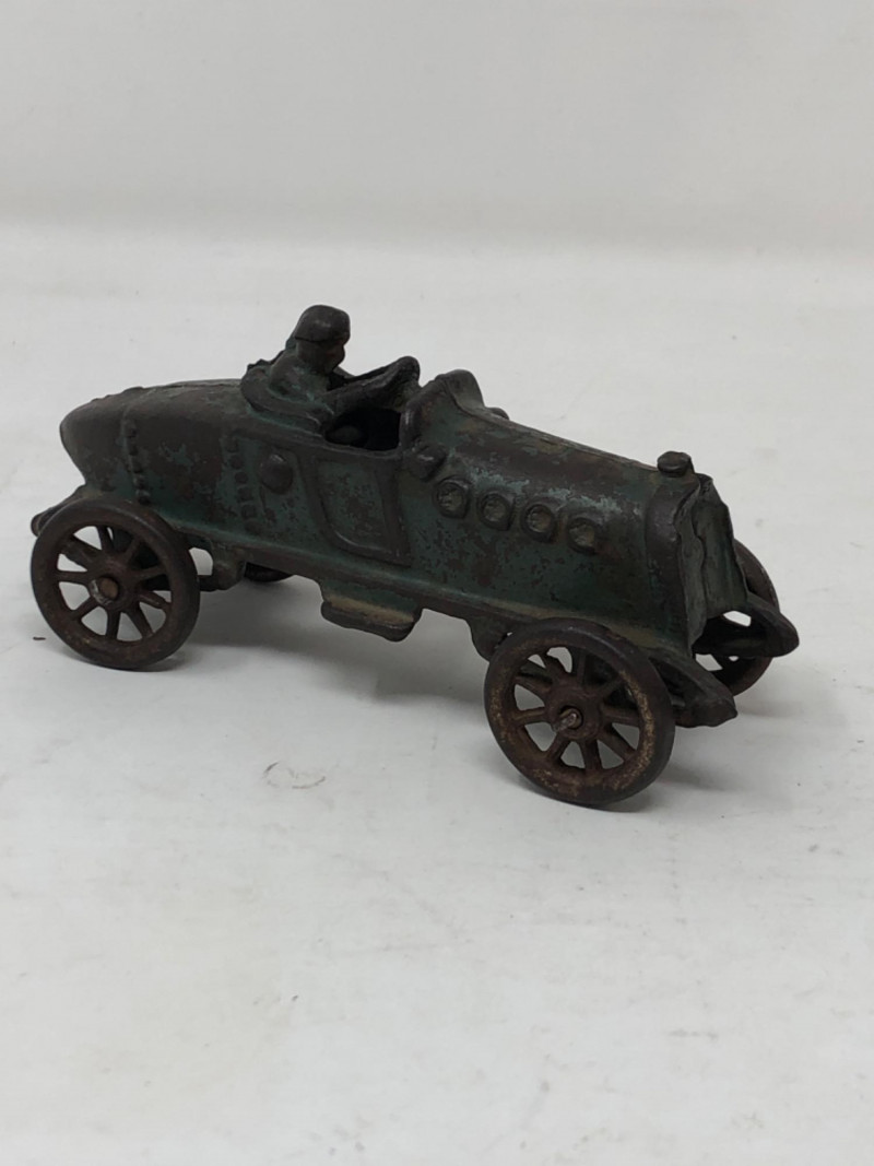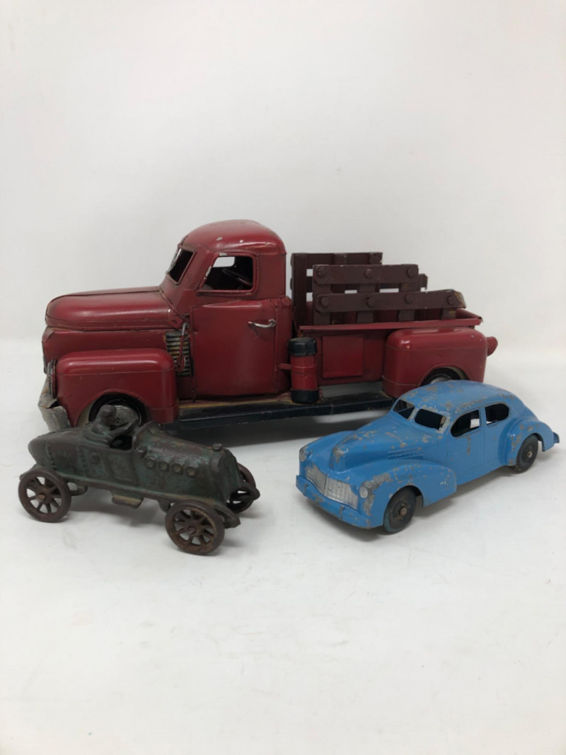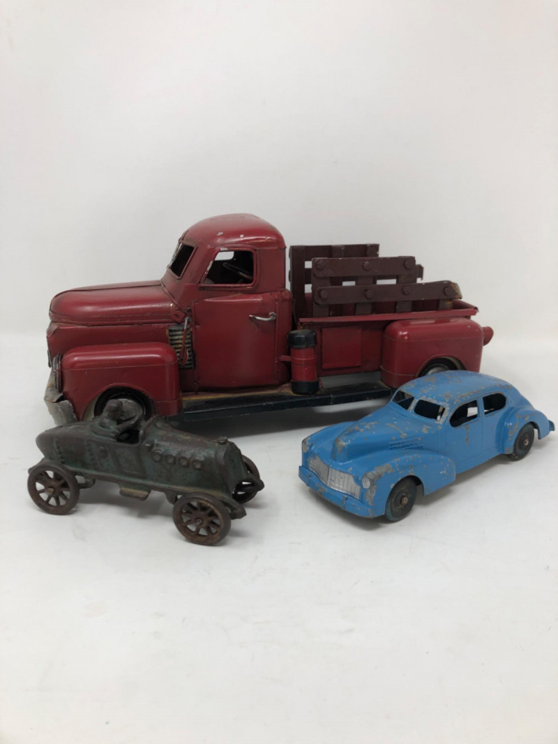 A charming assortment of antique and vintage metal toy vehicles, each echoing the mechanical ingenuity and childhood imagination of the early 20th century. These miniature marvels—likely crafted from cast iron, tinplate, or pressed steel—feature worn paint, functional wheels, and authentic signs of play. Whether fire trucks, roadsters, or delivery wagons, each piece carries the patina of time and the spirit of a bygone era when toys were built to last. Large truck - 12 inches long x 6 inches height x 5 inches width Blue car - 7 inches long x 2.5 inches height x 2.5 inches width Cast iron race car with racer - 5.5 inches long x 2.5 inches height x 2 inches width