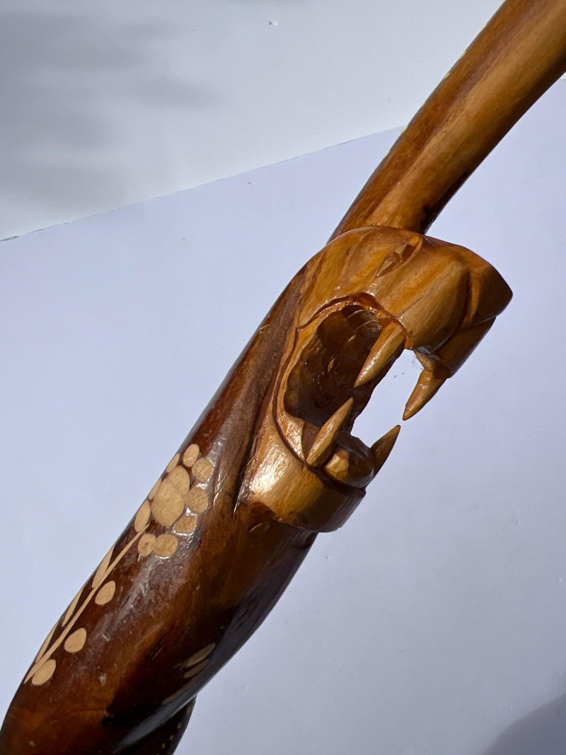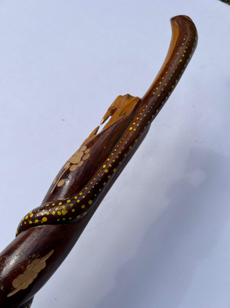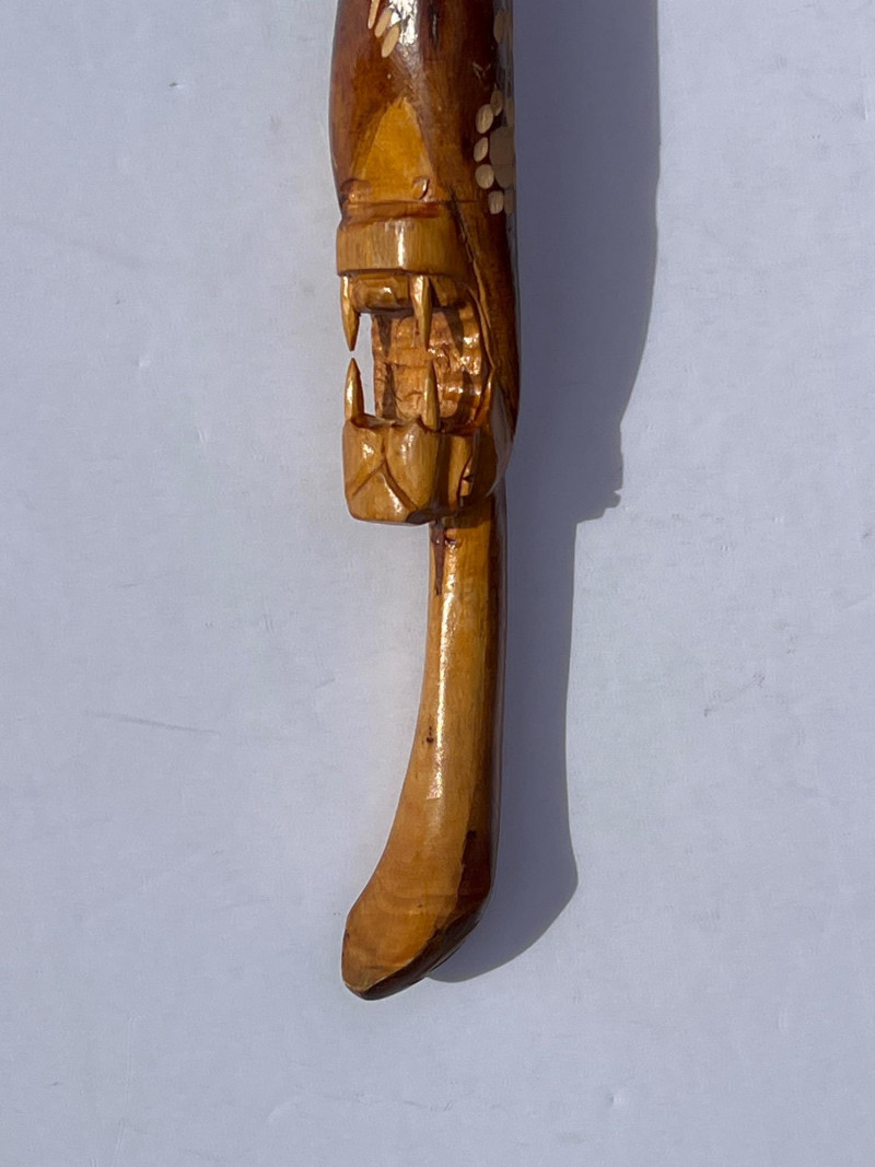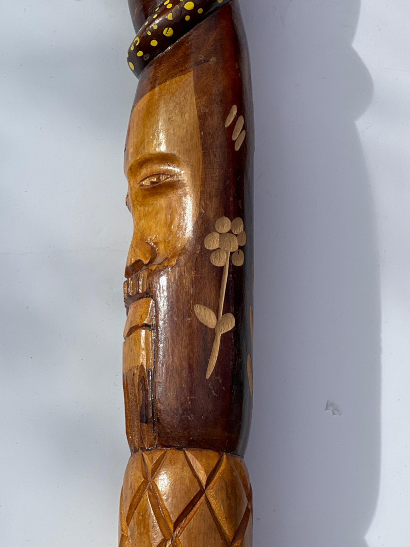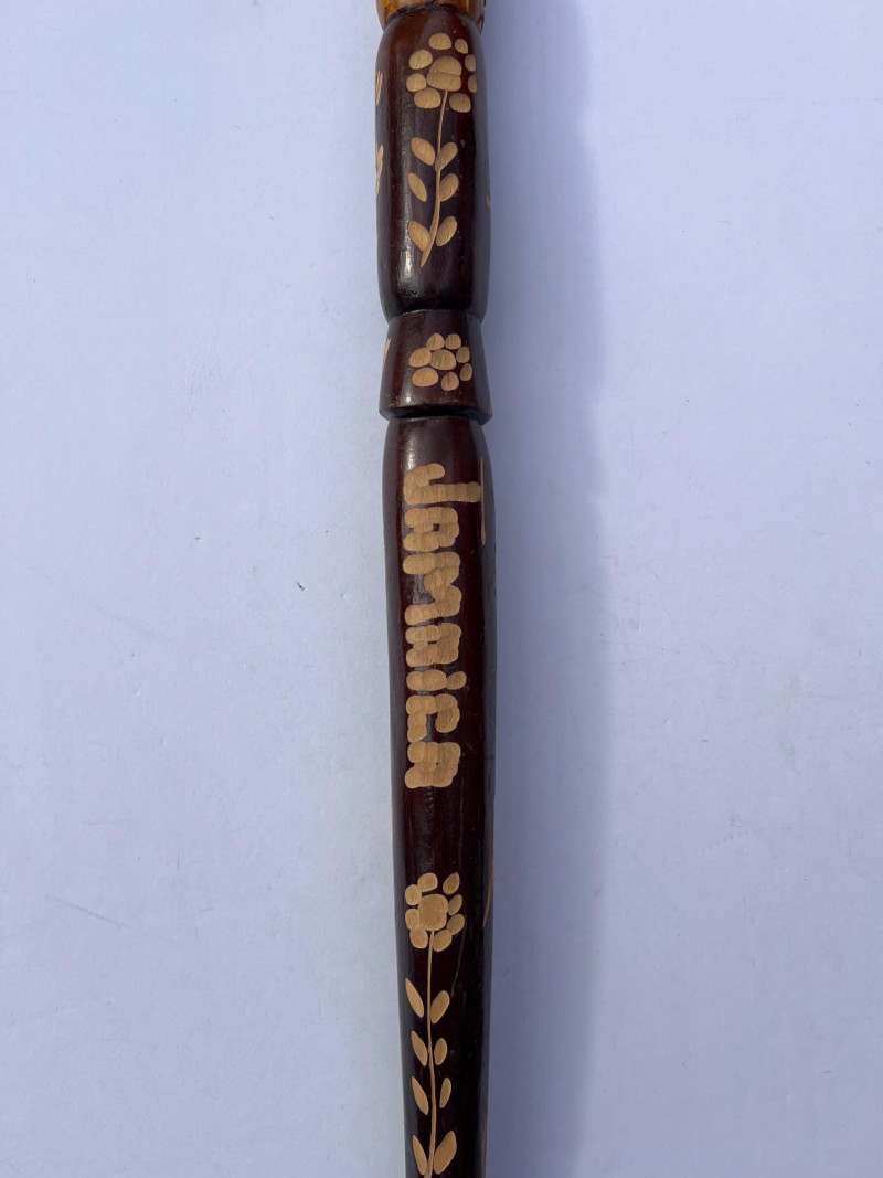 A captivating trio of hand-carved wooden walking sticks, each with its own distinct character and cultural resonance: Snake Carved Stick (40 inches length) – Features a winding serpent motif with “Jamaica” carved into the shaft, accented by floral detailing and a carved man’s face. A vibrant example of Caribbean folk art, blending symbolism and storytelling. Geometric Stick with Amber Crown (37 inches length) – Topped with a crown-shaped amber finial, this piece showcases precise geometric carvings along the shaft. Regal and rhythmic, it evokes ceremonial or tribal design. Pineapple & Animal Head Stick (35 inches length) – Carved with a pineapple motif and a stylized animal head, this stick has a crooked top that adds whimsy and organic charm. Possibly inspired by tropical flora and fauna. Together, these walking sticks reflect a fusion of folk craftsmanship, regional symbolism, and sculptural artistry. Ideal for collectors of ethnographic art, travel mementos, or decorative curiosities.