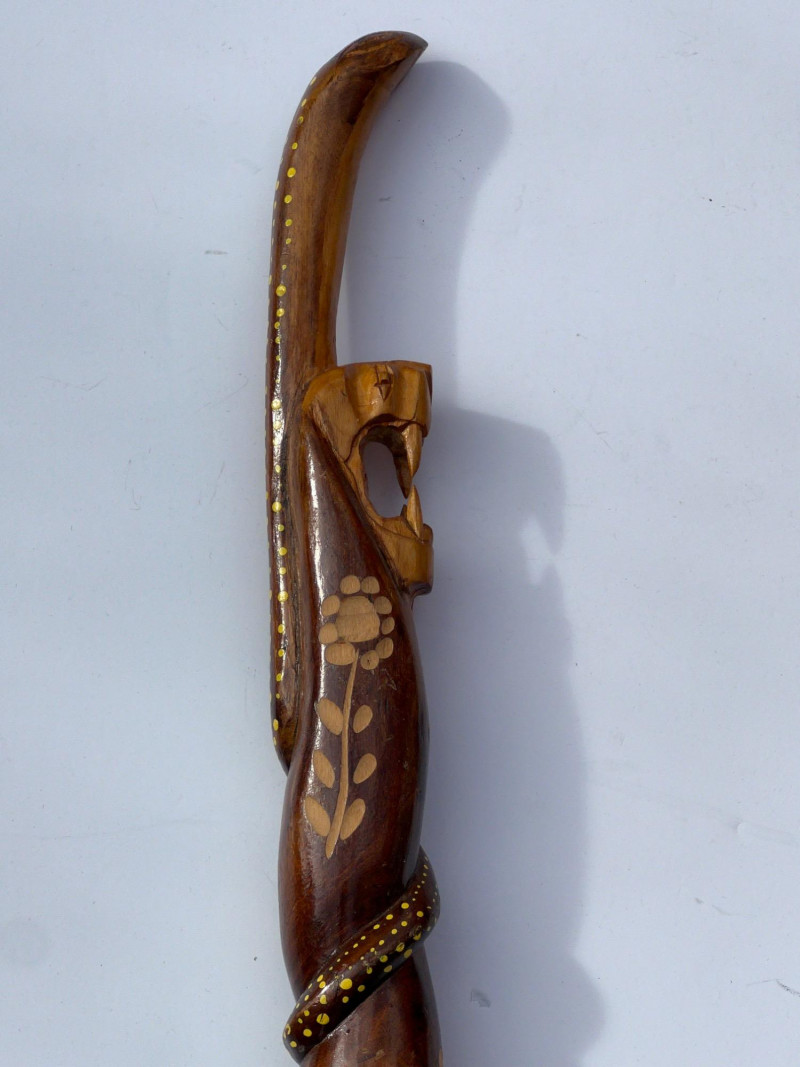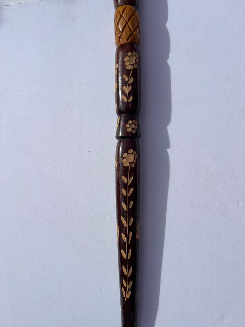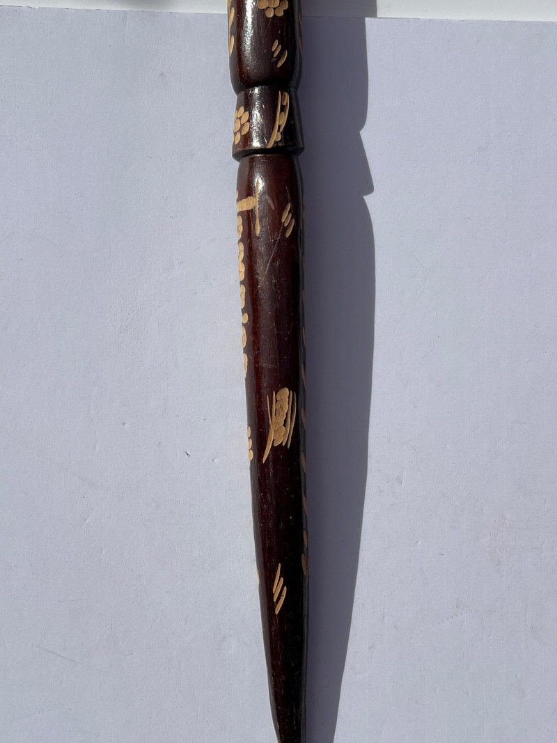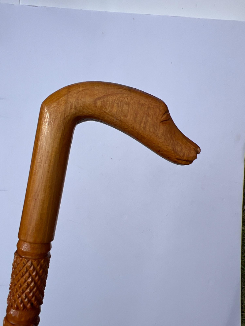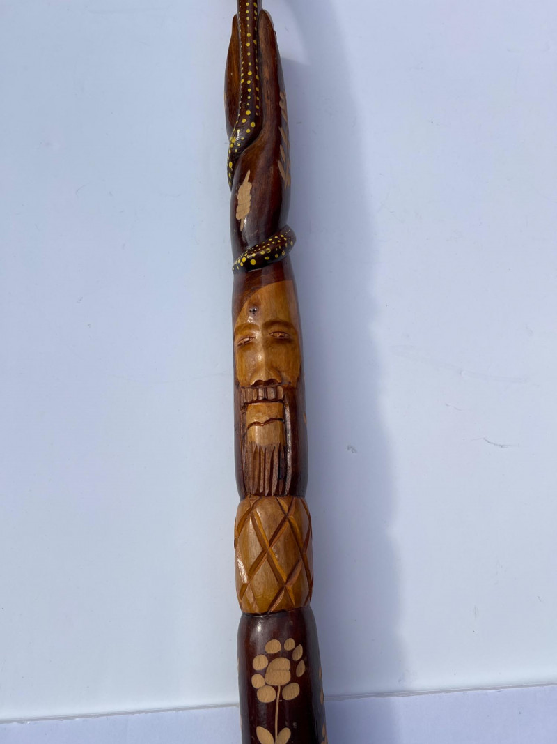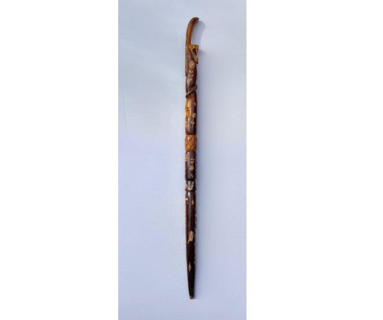 A captivating trio of hand-carved wooden walking sticks, each with its own distinct character and cultural resonance: Snake Carved Stick (40 inches length) – Features a winding serpent motif with “Jamaica” carved into the shaft, accented by floral detailing and a carved man’s face. A vibrant example of Caribbean folk art, blending symbolism and storytelling. Geometric Stick with Amber Crown (37 inches length) – Topped with a crown-shaped amber finial, this piece showcases precise geometric carvings along the shaft. Regal and rhythmic, it evokes ceremonial or tribal design. Pineapple & Animal Head Stick (35 inches length) – Carved with a pineapple motif and a stylized animal head, this stick has a crooked top that adds whimsy and organic charm. Possibly inspired by tropical flora and fauna. Together, these walking sticks reflect a fusion of folk craftsmanship, regional symbolism, and sculptural artistry. Ideal for collectors of ethnographic art, travel mementos, or decorative curiosities.