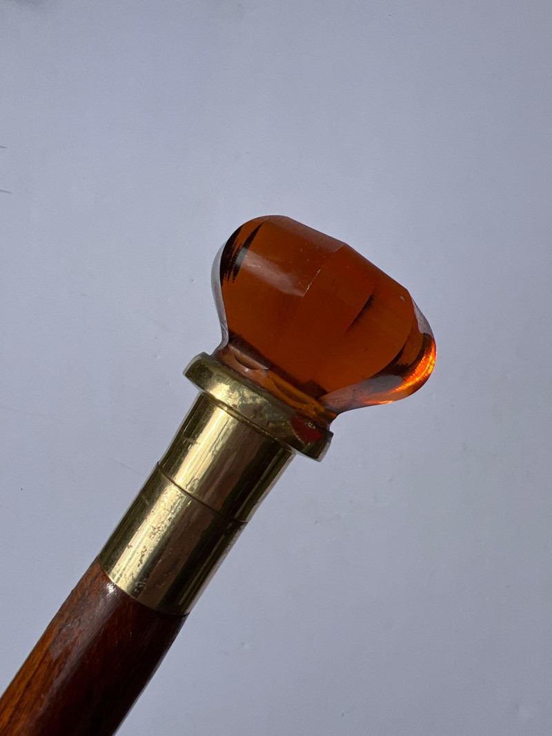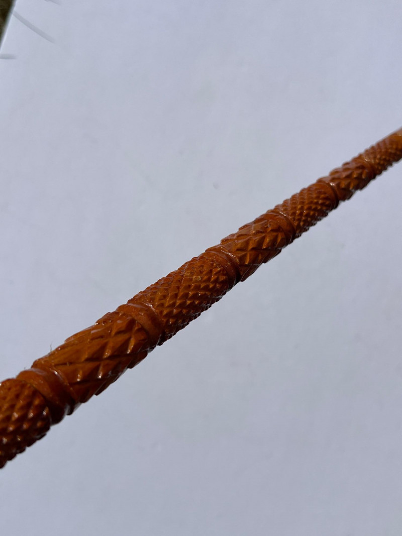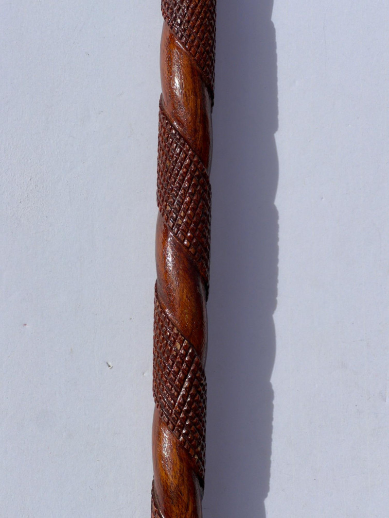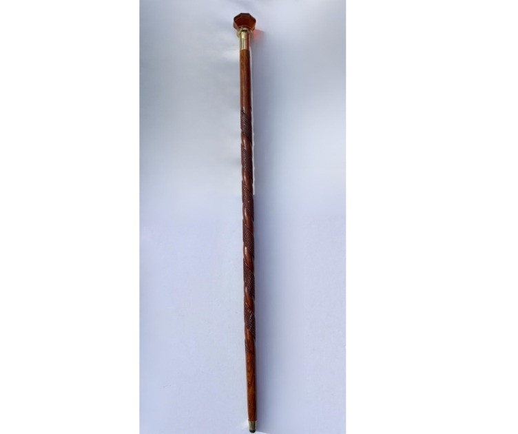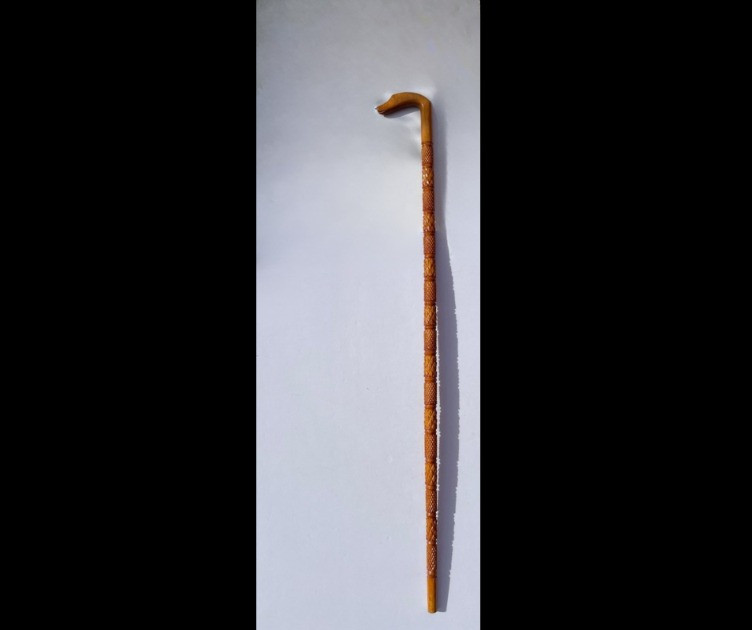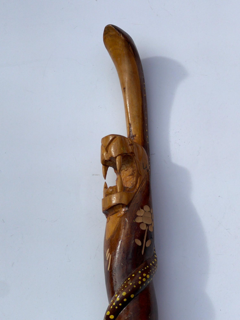 A captivating trio of hand-carved wooden walking sticks, each with its own distinct character and cultural resonance: Snake Carved Stick (40 inches length) – Features a winding serpent motif with “Jamaica” carved into the shaft, accented by floral detailing and a carved man’s face. A vibrant example of Caribbean folk art, blending symbolism and storytelling. Geometric Stick with Amber Crown (37 inches length) – Topped with a crown-shaped amber finial, this piece showcases precise geometric carvings along the shaft. Regal and rhythmic, it evokes ceremonial or tribal design. Pineapple & Animal Head Stick (35 inches length) – Carved with a pineapple motif and a stylized animal head, this stick has a crooked top that adds whimsy and organic charm. Possibly inspired by tropical flora and fauna. Together, these walking sticks reflect a fusion of folk craftsmanship, regional symbolism, and sculptural artistry. Ideal for collectors of ethnographic art, travel mementos, or decorative curiosities.