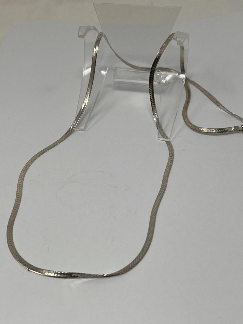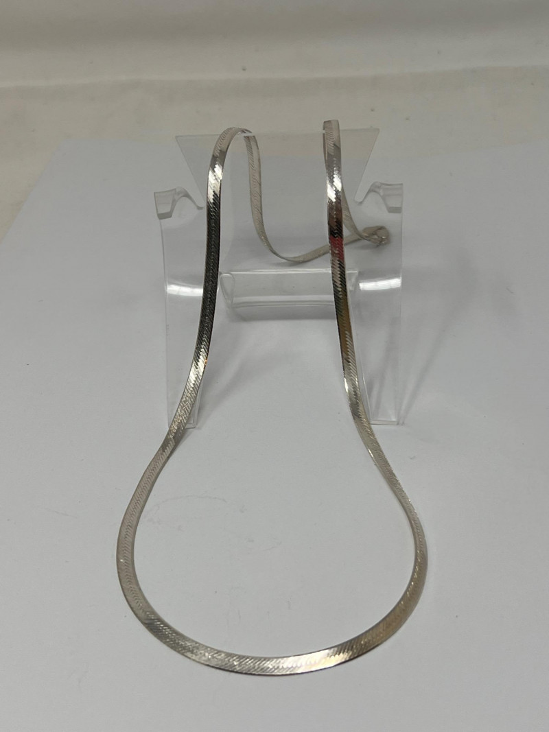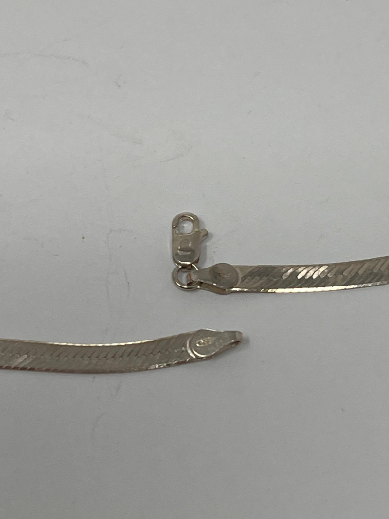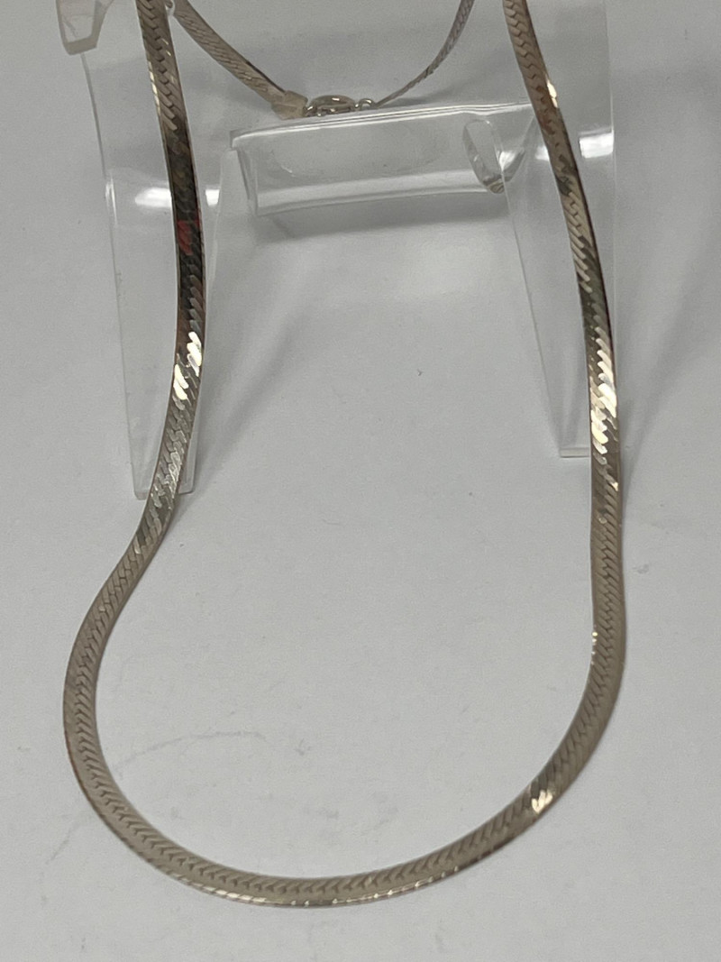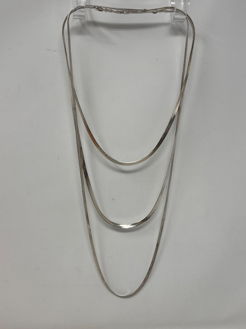 A graceful trio of sterling silver herringbone chain necklaces, each offering a distinct length and width for versatile styling. Crafted in 925 silver, these chains shimmer with fluid movement and minimalist sophistication. Whether layered together or worn individually, they evoke timeless elegance and quiet luxury. Marked 925 Sterling Silver Styles: Herringbone chain Lengths & Widths: 16" × 3mm 22" × 4mm 30" × 3mm Total Weight: 9 grams