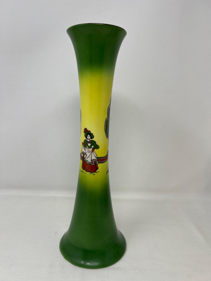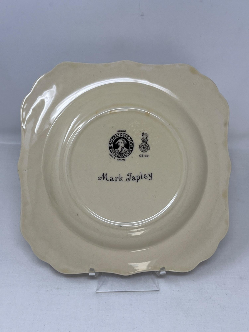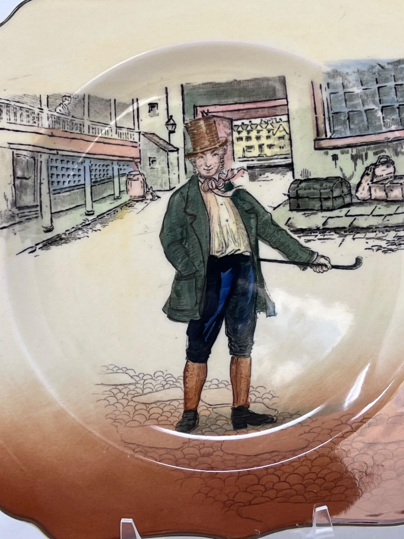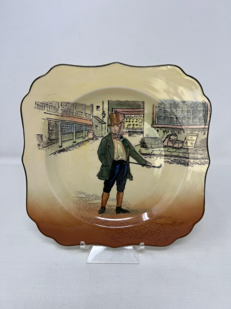 Gainsborough Ware was a line of decorative ceramics produced by Haynes, Bennett & Company in the United States, primarily active around the turn of the 20th C. Here is a whimsical folk motif painted on this vase consistent with the Art Nouveau movement. Vase is 12 inches tall and 4 inches round at bottom. Included is a Royal Doulton Dickens Ware Mark Tapley collector square plate. The illustration is Mark Tapley known for his relentless cheerfulness in the face of adversity (a popular character from the novel Martin Chuzzlewit). Doulton mark on back of plate. The Dickens Ware was first introduced in 1908 and became one of the company's most successful lines of decorative ceramics. Measures 8 inches x 8 inches.