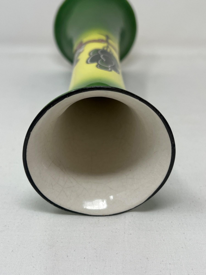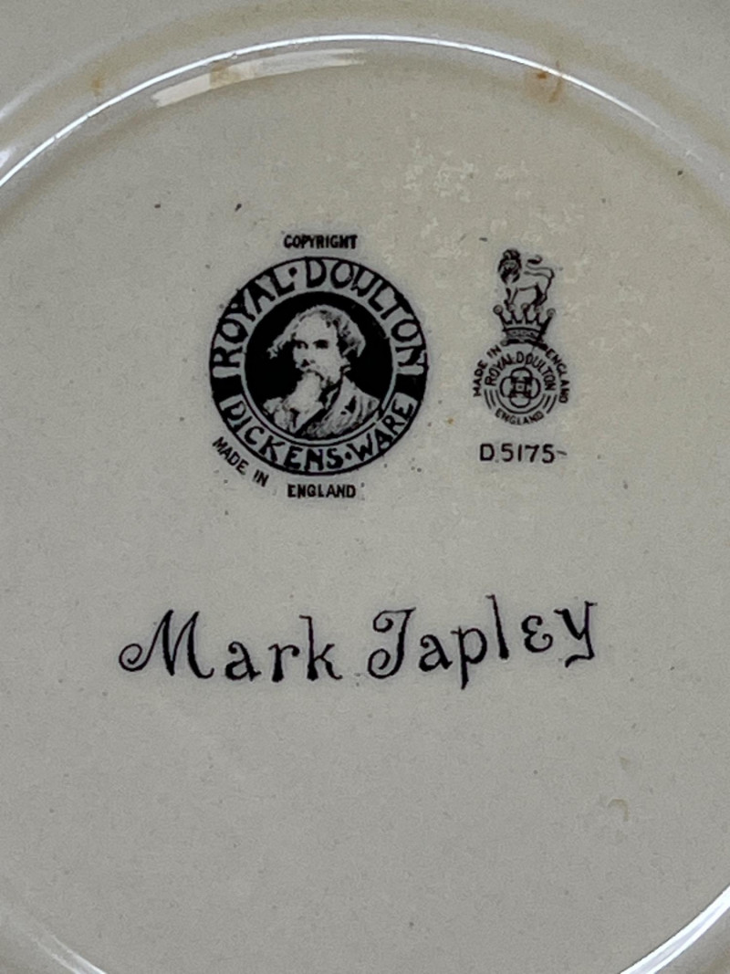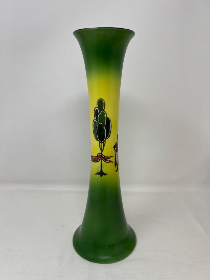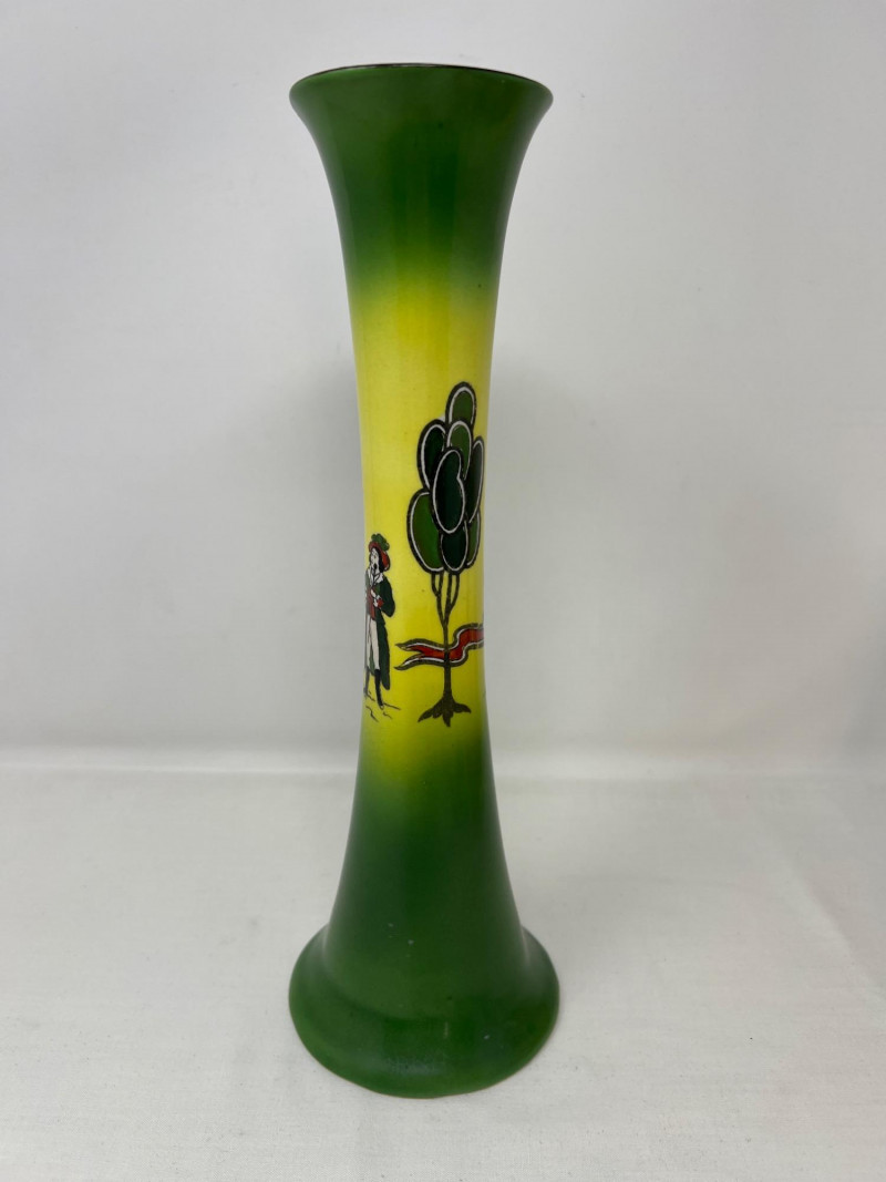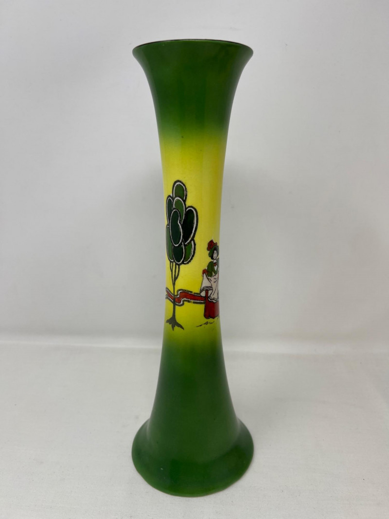 Gainsborough Ware was a line of decorative ceramics produced by Haynes, Bennett & Company in the United States, primarily active around the turn of the 20th C. Here is a whimsical folk motif painted on this vase consistent with the Art Nouveau movement. Vase is 12 inches tall and 4 inches round at bottom. Included is a Royal Doulton Dickens Ware Mark Tapley collector square plate. The illustration is Mark Tapley known for his relentless cheerfulness in the face of adversity (a popular character from the novel Martin Chuzzlewit). Doulton mark on back of plate. The Dickens Ware was first introduced in 1908 and became one of the company's most successful lines of decorative ceramics. Measures 8 inches x 8 inches.