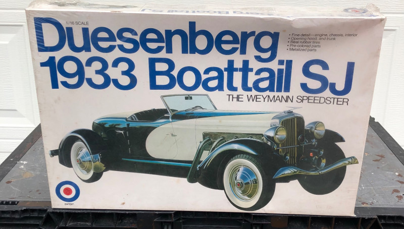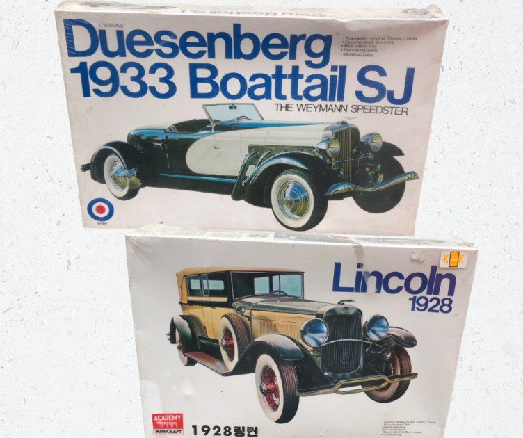A pair of vintage 1/16 scale model car kits, both still shrink-wrapped and unopened. This lot includes: Lincoln 1928 Model Car Kit Duesenberg 1933 Boattail SJ – The Weyman Speedster Ideal for collectors, hobbyists, or those drawn to the elegance of early automotive design, these kits offer a pristine starting point for display or assembly. Their untouched condition and classic subjects make them standout additions to any model collection. Scale: 1/16 Packaging: Shrink-wrapped, unopened